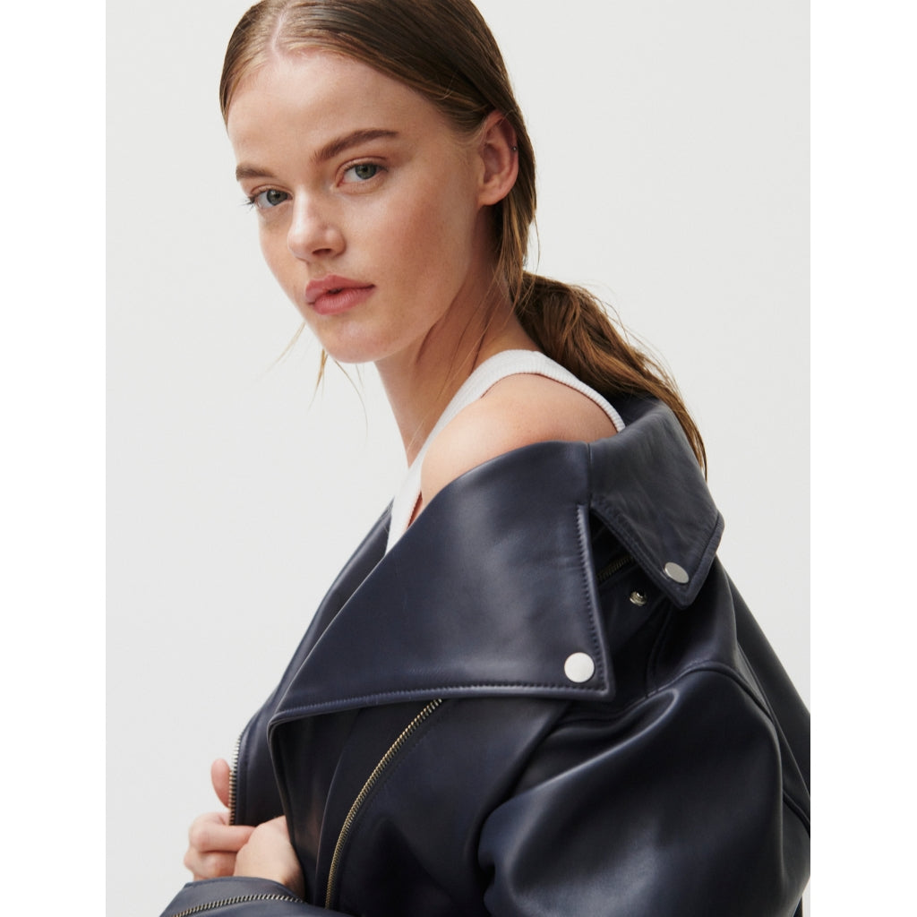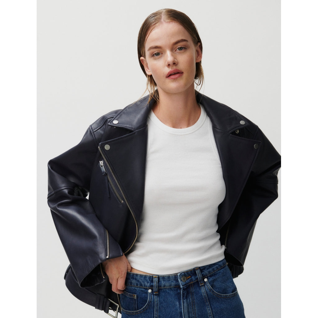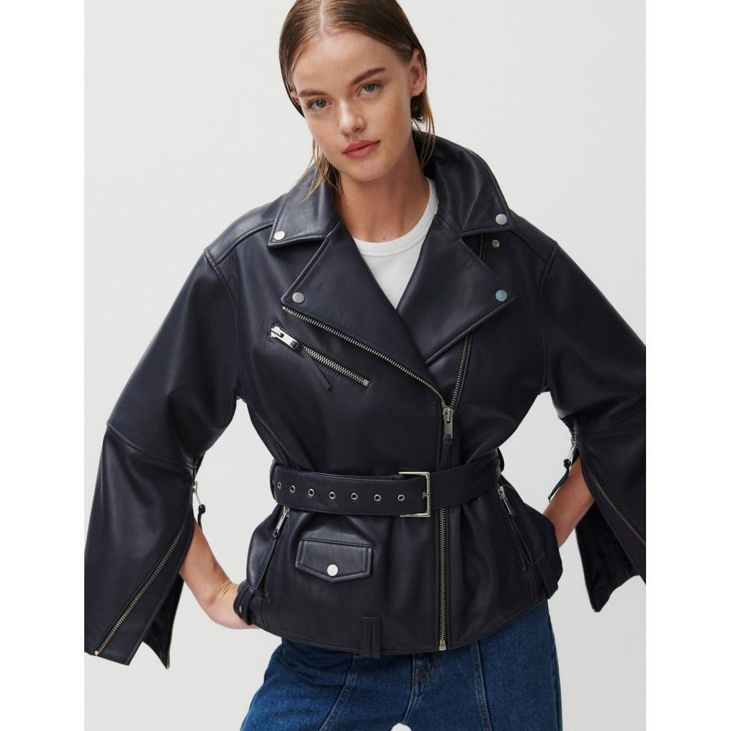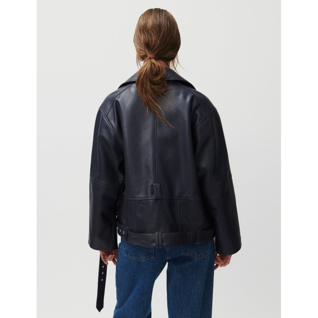 Denne mørkeblå læderjakke fra 2NDDAY til damer er et tidløst og moderne valg, der kombinerer klassisk biker-stil med et feminint snit. Jakken har asymmetrisk lynlås, dekorative metaldetaljer og et justerbart bælte i taljen, som giver et stilrent og flatterende look.
