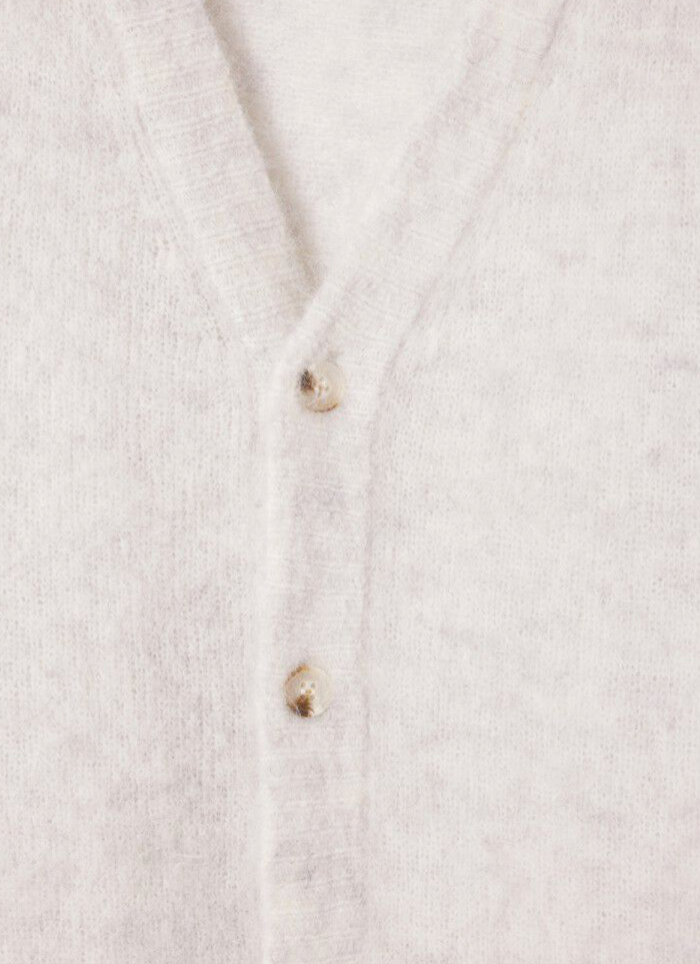Den fluffy alpaka-blanding giver cardiganen en luksuriøs, let tekstur, der føles behagelig mod huden og tilfører garderoben et elegant touch.