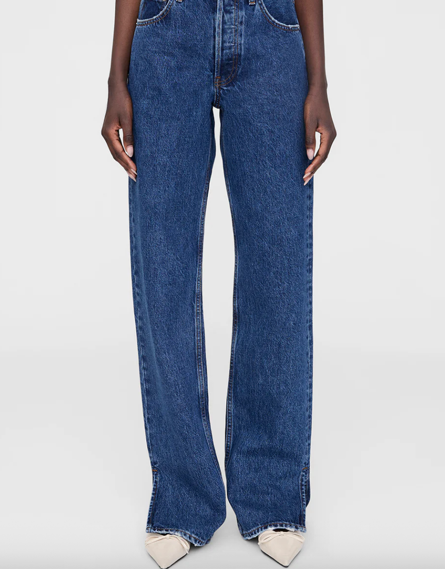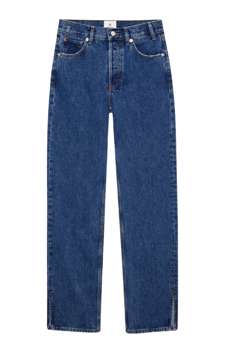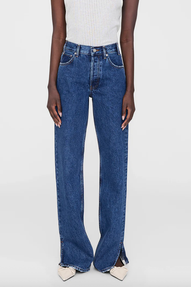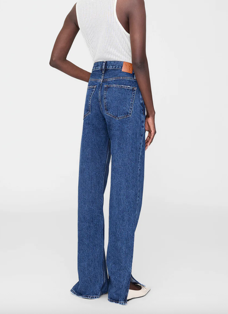 Disse Roy-jeans fra Anine Bing har en afslappet, lige pasform med mid waist. De er fremstillet i mellemtykke, stive økologiske bomuldsjeans og har en mørkeblå vask med slidte områder og sideudskæringer ved benåbningerne.