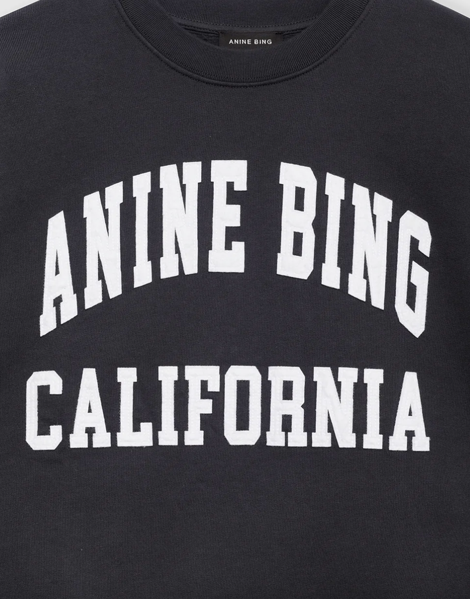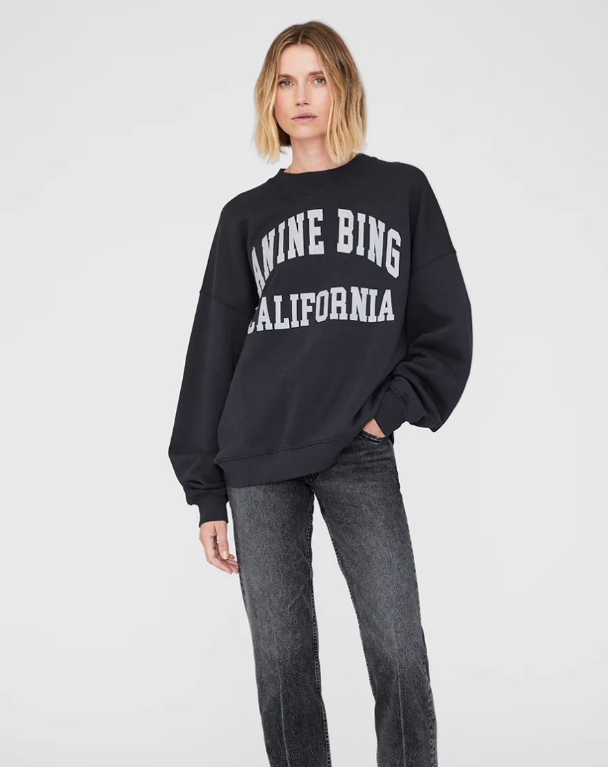 Miles Sweatshirt ANINE BING er en oversized sweatshirt med rund hals, fremstillet af mellemvægtigt 100 % økologisk bomuldsfleece i en vintage-sort vask. Den har et afslappet, casual udtryk og er prydet med et originalt ANINE BING filt-logo på brystet i kontrastfarvet hvid med autentiske college-inspirerede bogstaver.