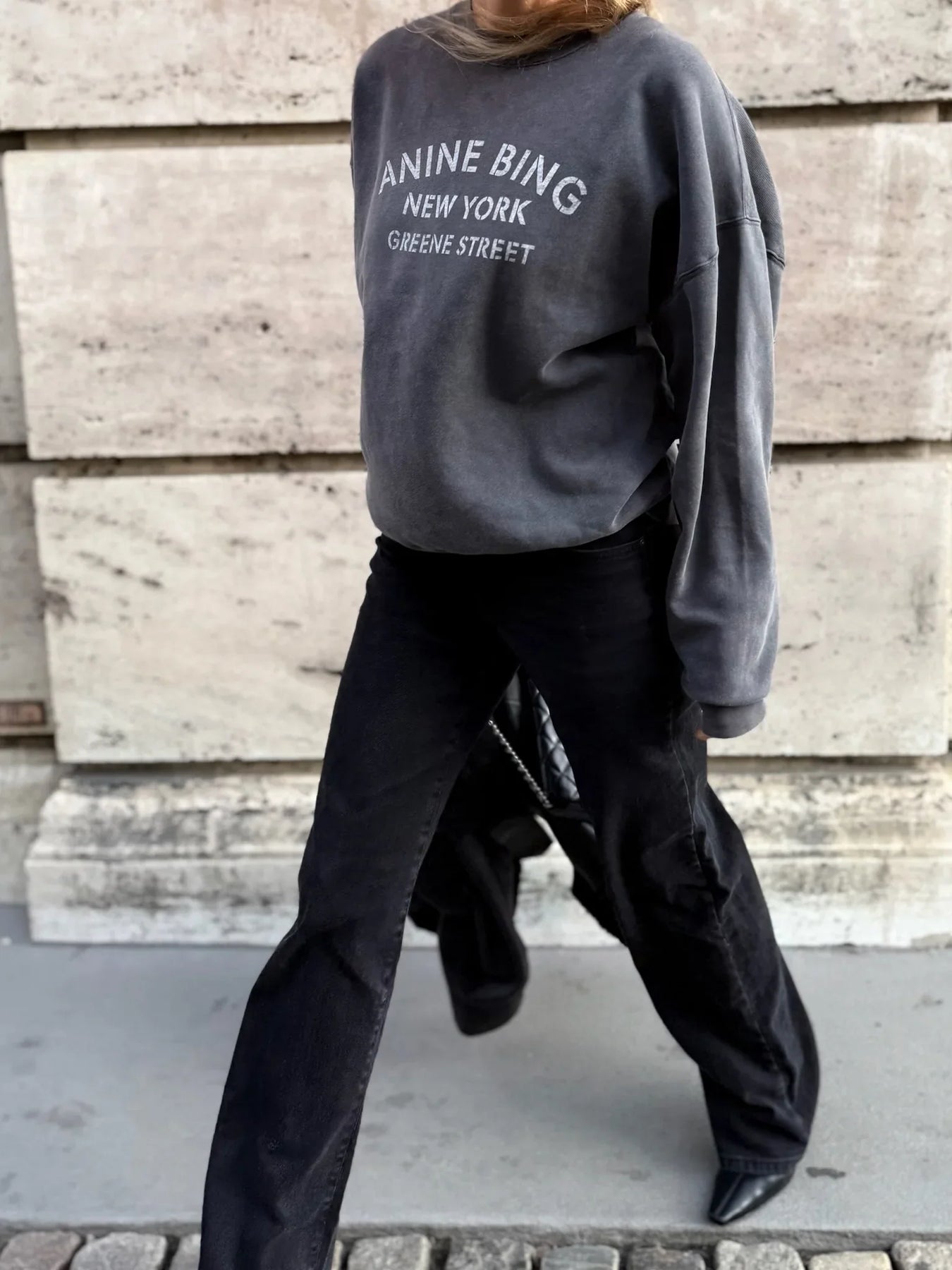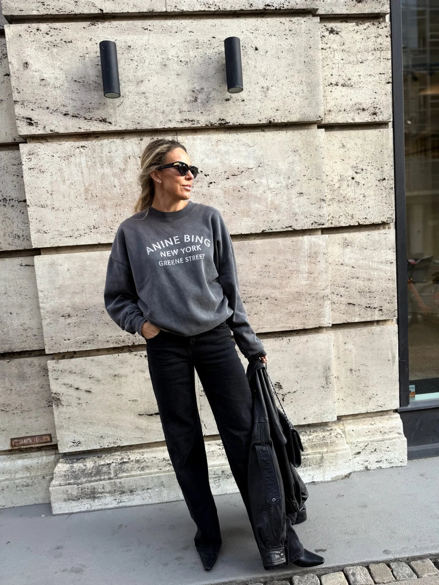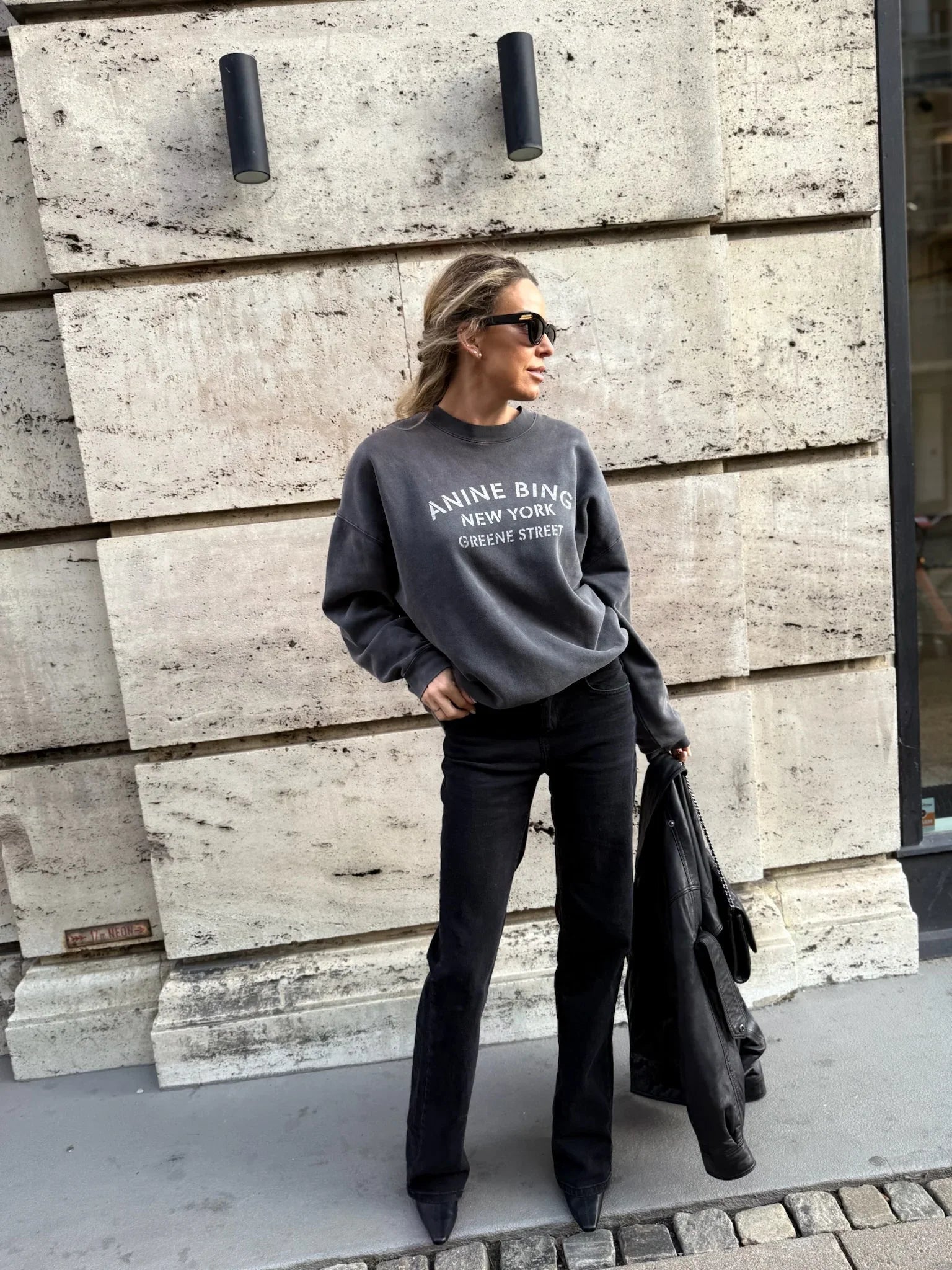 Sweatshirten prydes af et specialdesignet ANINE BING-logo, efterfulgt af New York og Greene Street – en hyldest til brandets ikoniske base og urbane æstetik.