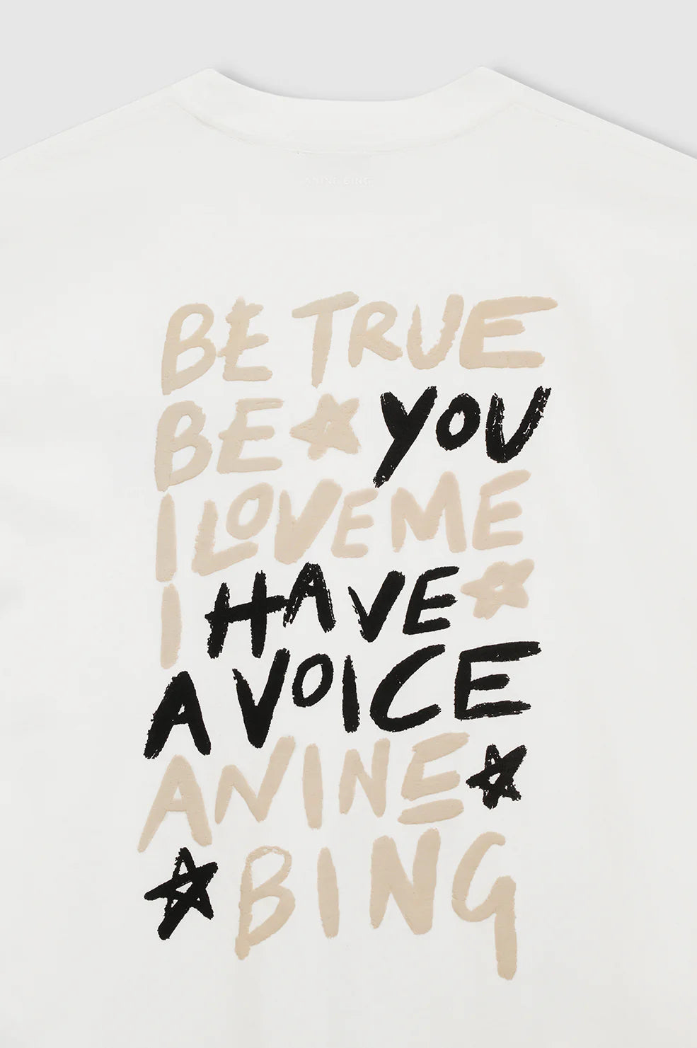 Walker Tee Empowerment fra Anine Bing er en klassisk T-shirt i blød, ivoryfarvet bomuld med en afslappet, let oversized pasform. Foran har den et lille, håndskrevet Anine Bing-logo på brystet, mens ryggen er dekoreret med et iøjnefaldende, håndmalet statement-print i sort og beige med et stærkt, empowering budskab. T-shirten har rund hals og korte ærmer og er nem at style til både jeans, bukser eller nederdel for et cool og casual look med kant.