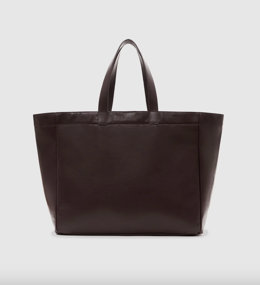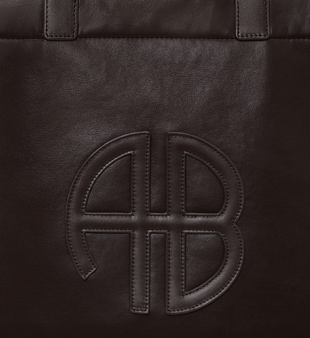Rummelig taske i mørkebrun regenereret læder med to praktiske håndtag. Tasken er indvendigt foret med bomulds-twill, der giver en behagelig og holdbar finish. Det prægede AB-monogram på forsiden tilføjer et diskret designelement.
