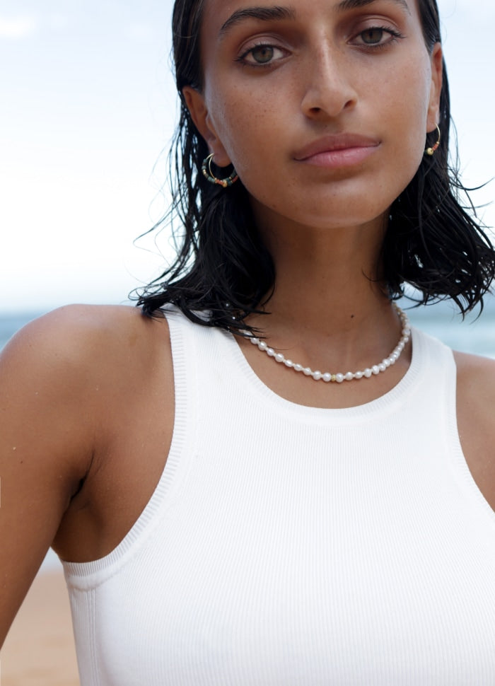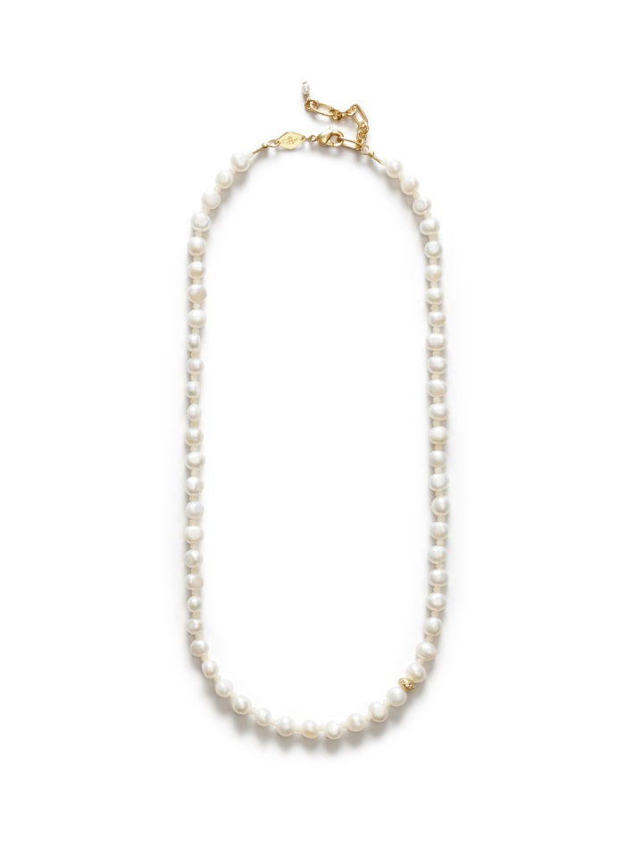 Denne håndlavede halskæde kombinerer messing med 18-karat guldbelægning og kultiverede ferskvandsperler. De små glasperler skaber en fin balance mellem det klassiske og det moderne udtryk.