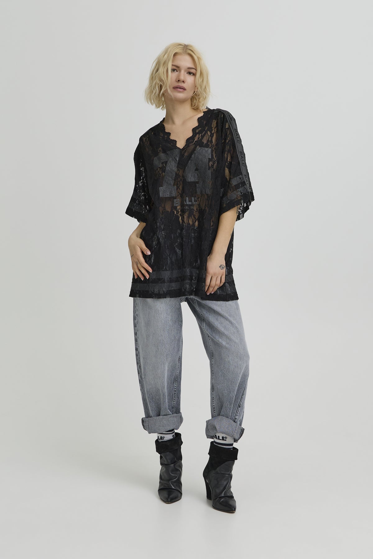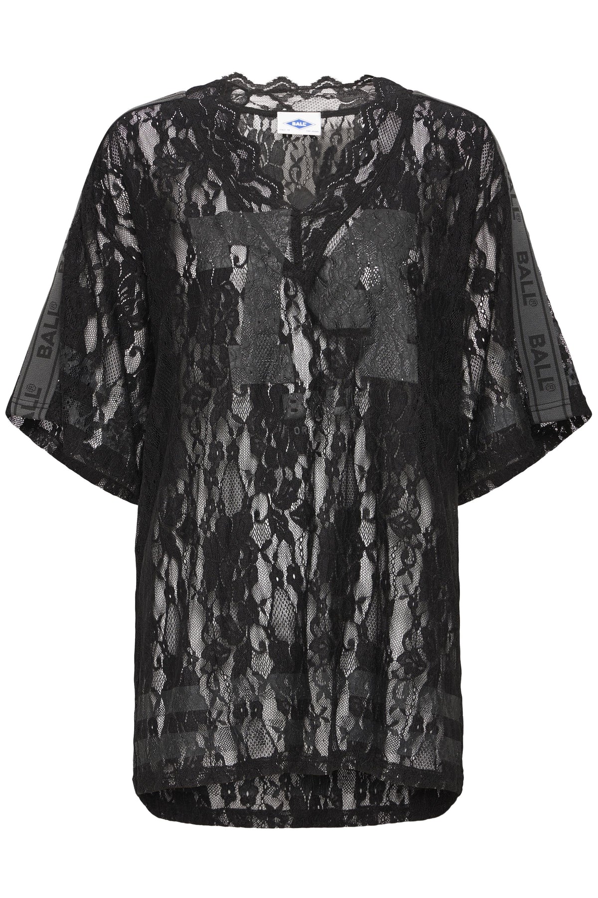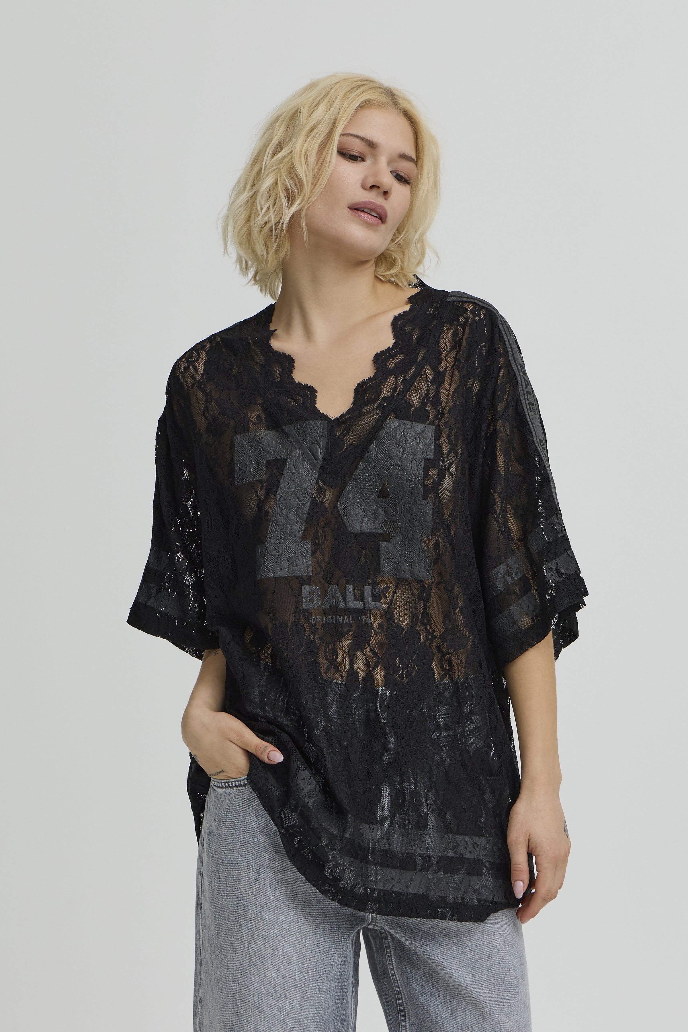 Transparent BAFine lace tee fra BALL, designet i et let og luftigt blondemateriale, der giver et feminint og edgy udtryk. T-shirten har en løs, oversized pasform med korte ærmer og en dyb V-udskæring med bølget blondekant, som fremhæver det elegante look.