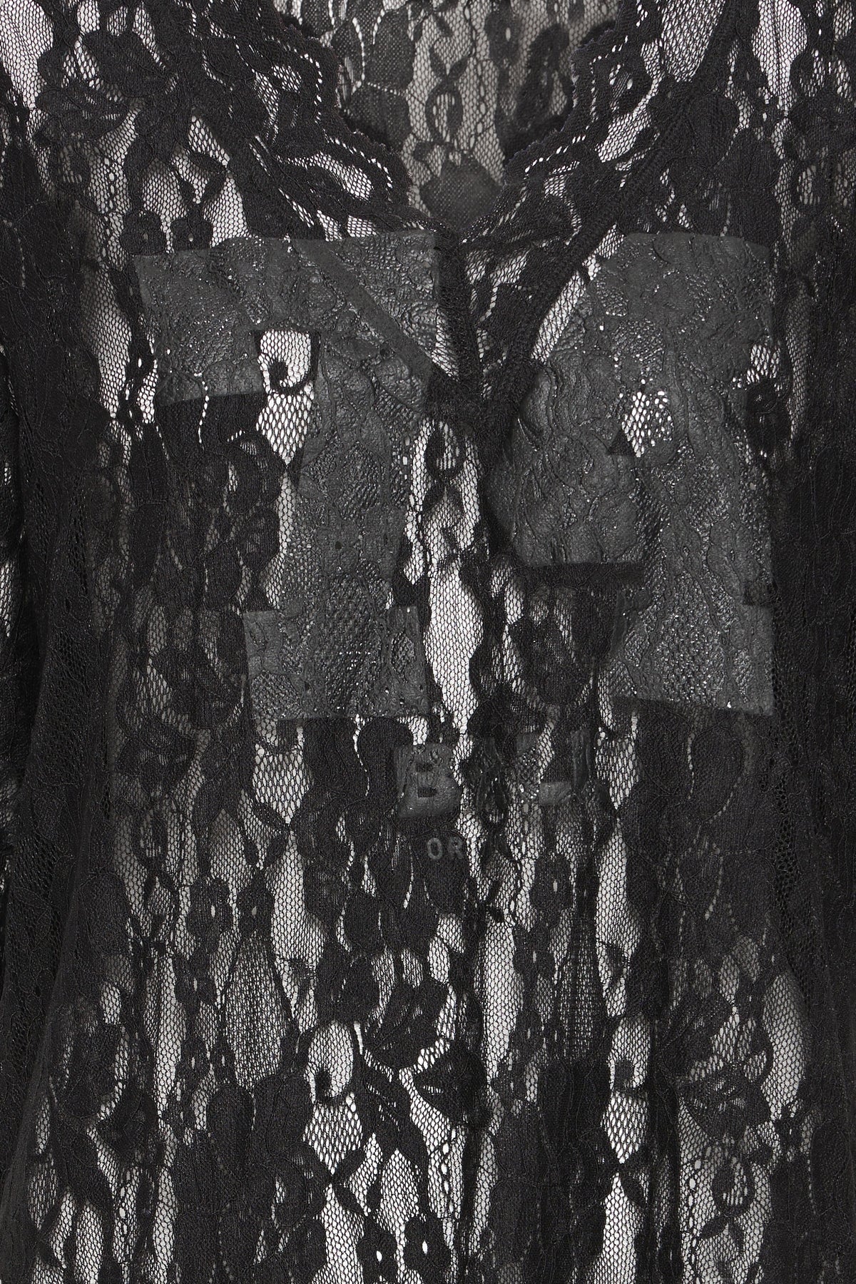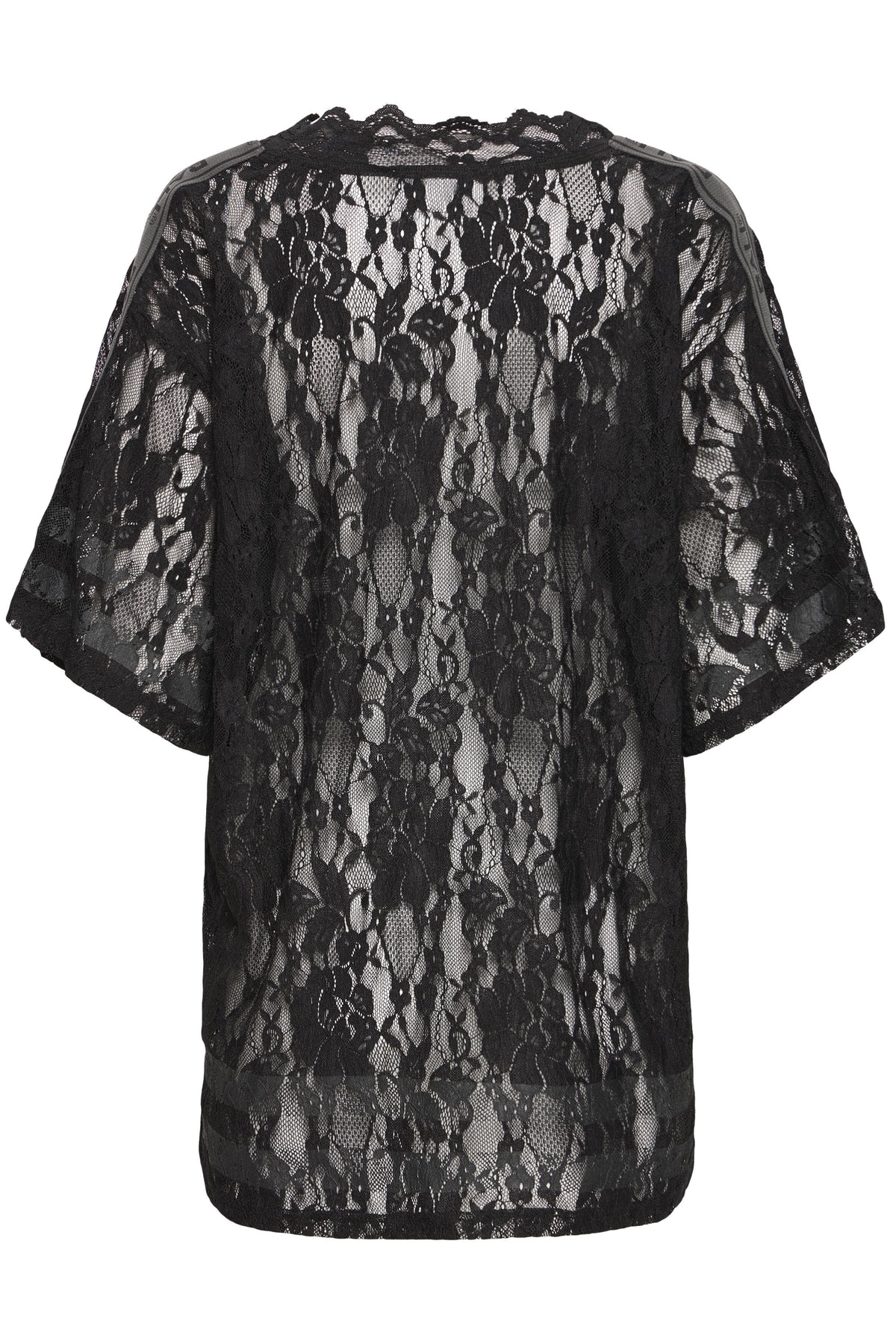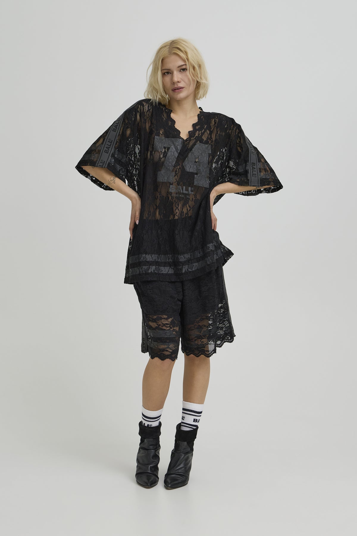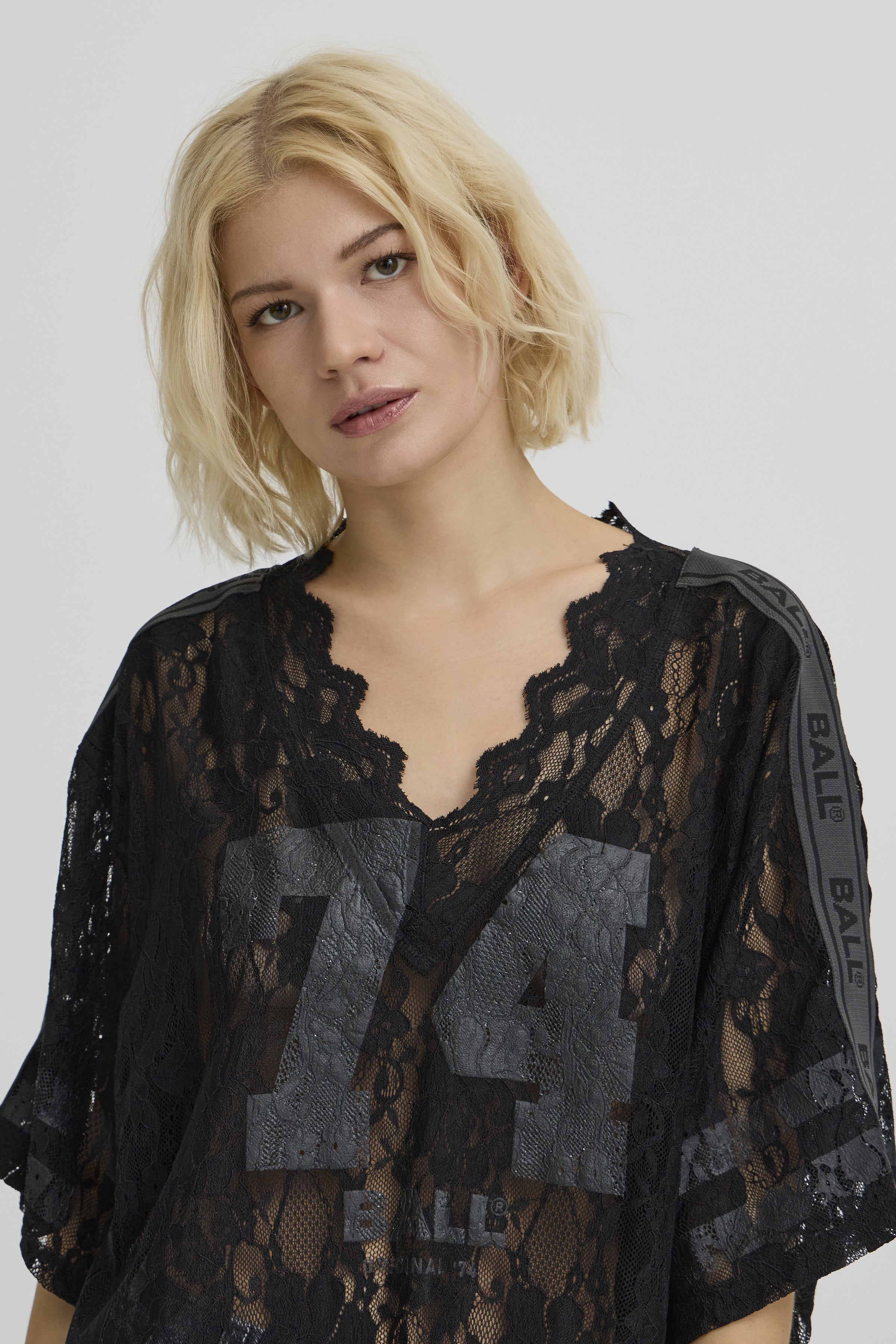 Transparent BAFine lace tee fra BALL, designet i et let og luftigt blondemateriale, der giver et feminint og edgy udtryk. T-shirten har en løs, oversized pasform med korte ærmer og en dyb V-udskæring med bølget blondekant, som fremhæver det elegante look.