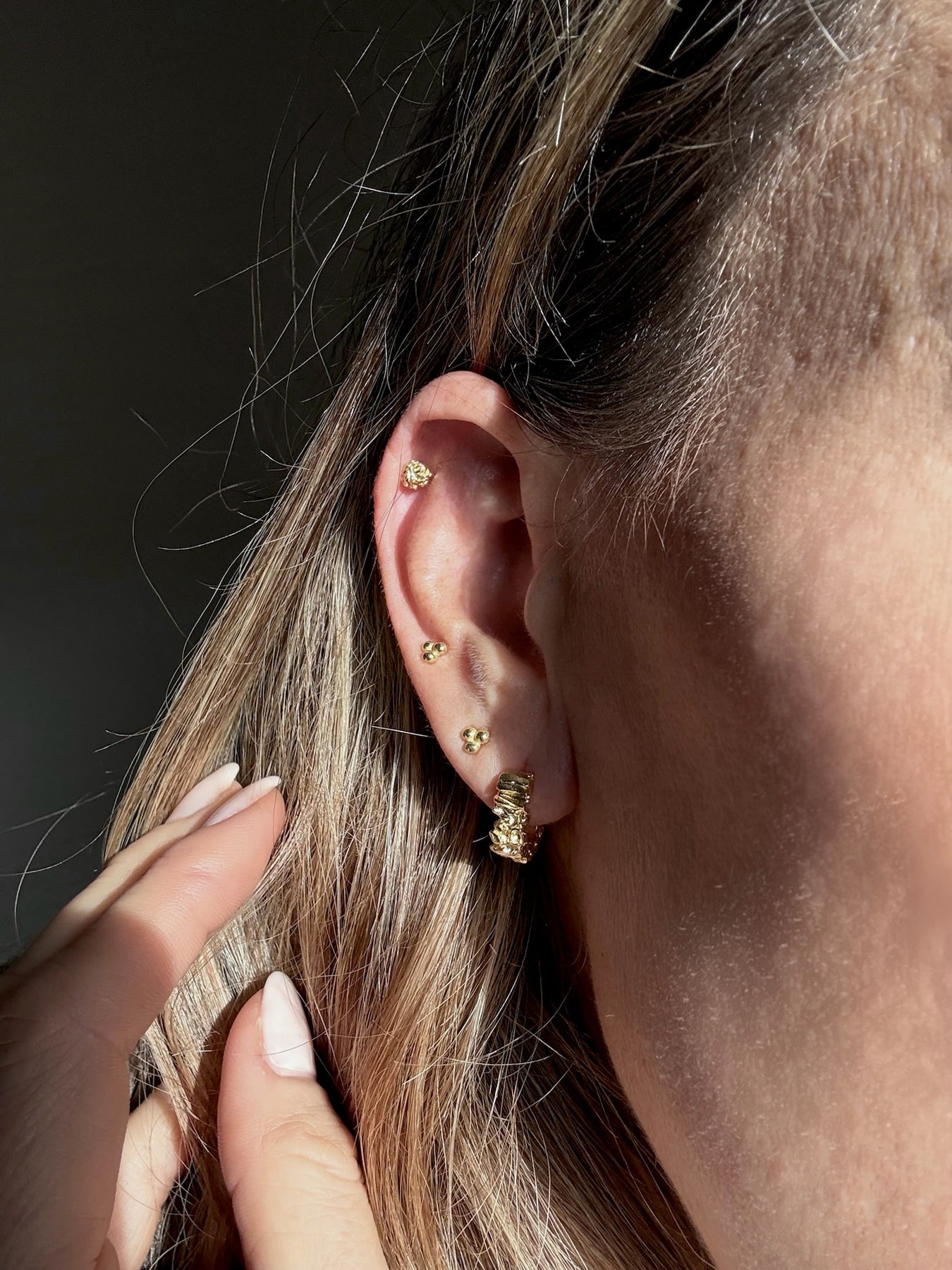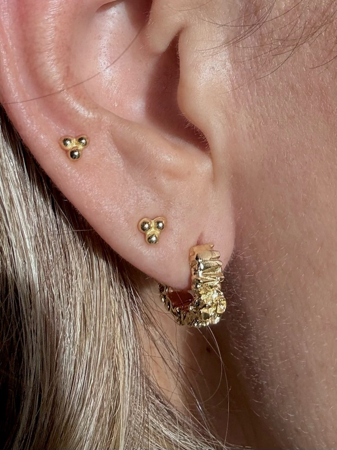 Eva-øreringe fra Andcopenhagen har et karakteristisk kantet design med tekstureret overflade. Det strukturerede udtryk gør dem til et kunstnerisk valg, der skaber opmærksomhed omkring festlige outfits.