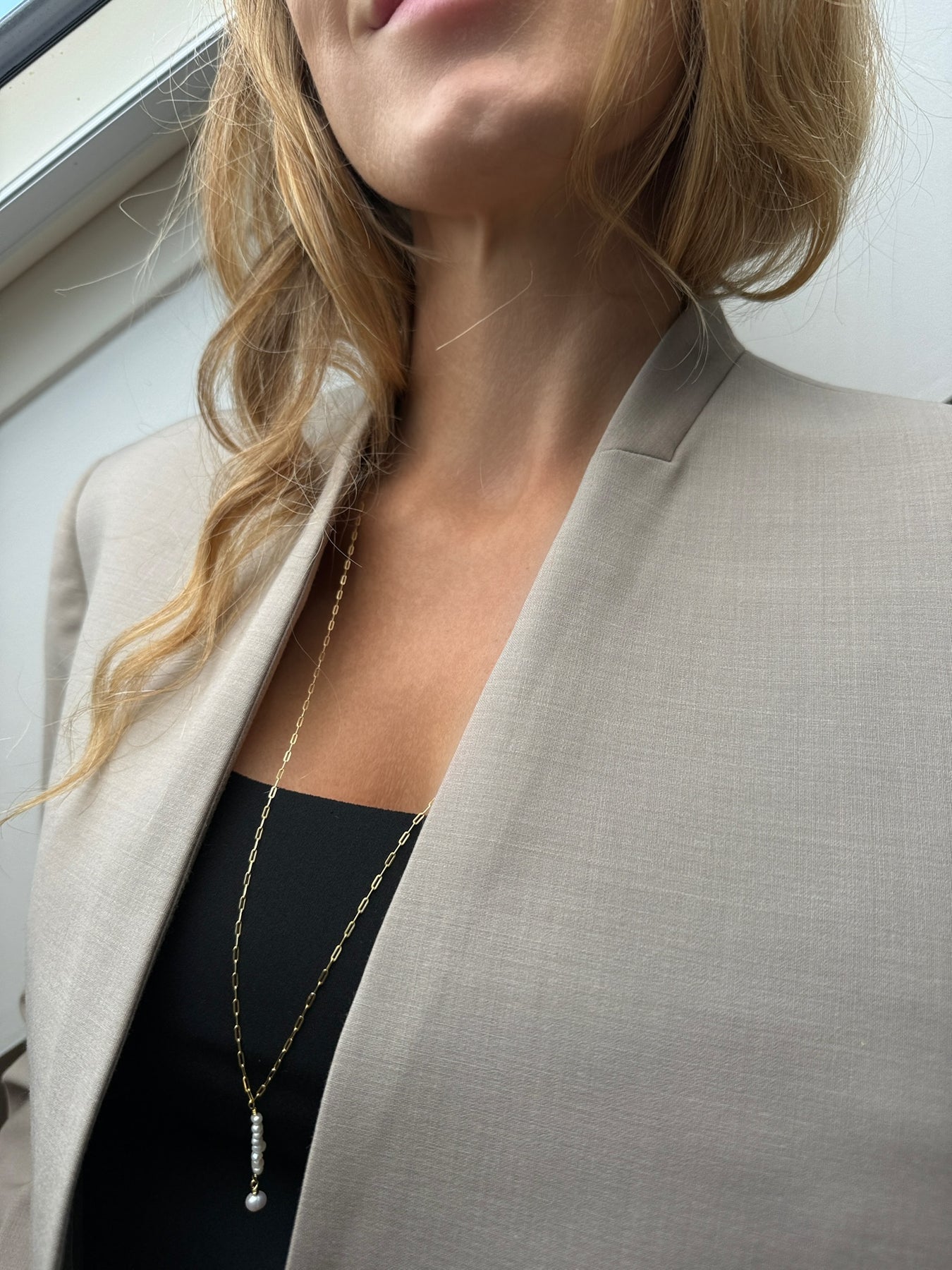 Ida Long-halskæden fra Andcopenhagen har aflange led og et særpræget vedhæng med små perler og en større perle. Den justerbare længde giver dig mulighed for at tilpasse den til forskellige outfits.