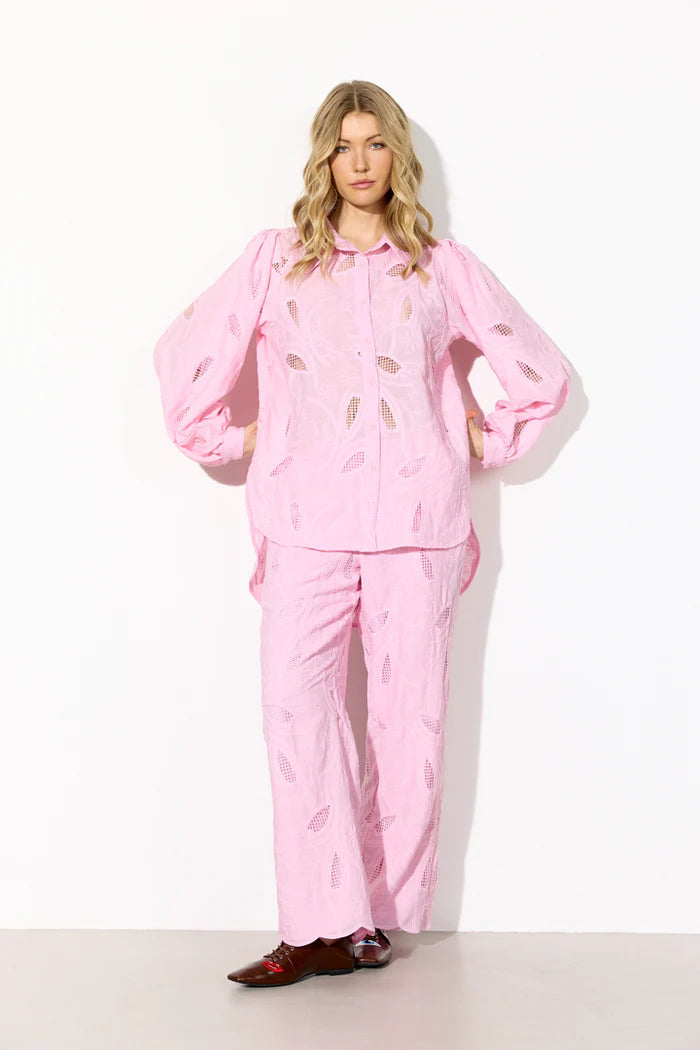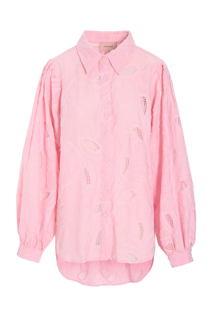 Orla skjorten fra Hunkøn er en feminin og markant skjorte i en lys rosa nuance med et dekorativt, broderet stof. Materialet har udskårne detaljer, som giver et let transparent udtryk og tilfører både tekstur og dybde til designet.