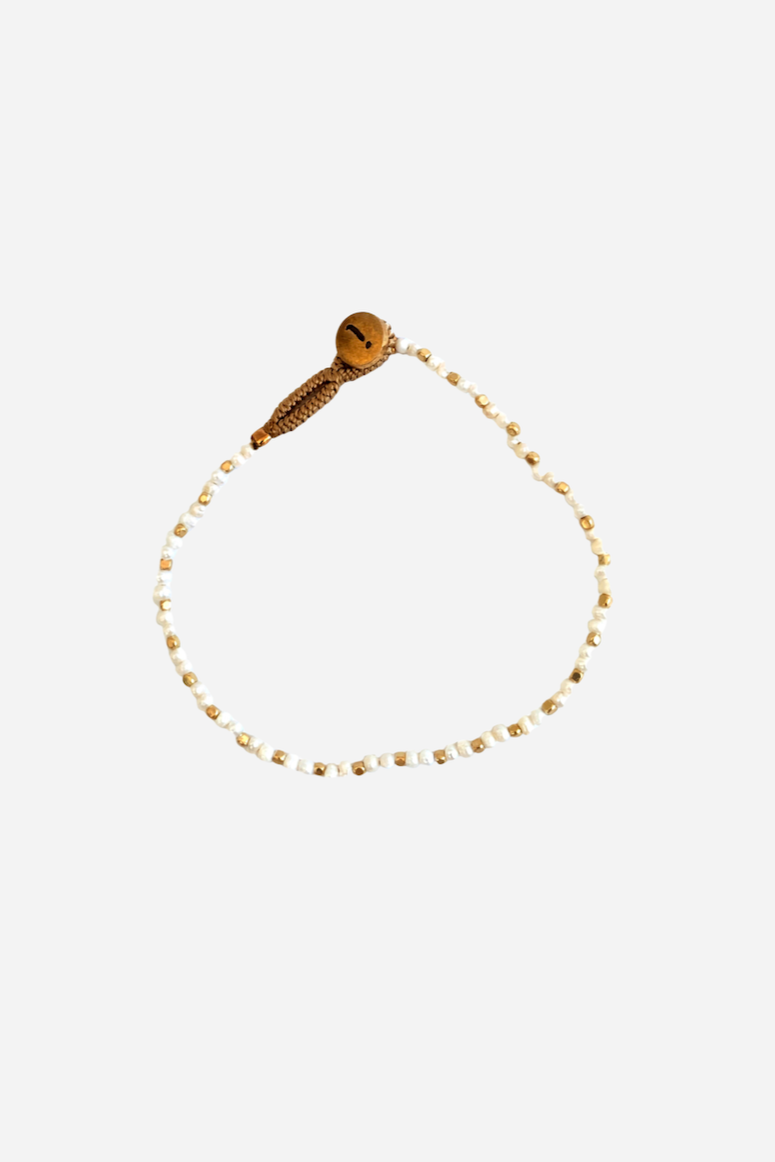 Dette håndlavede Ibu Jewels-armbånd kombinerer hvide og gyldne perler i et diskret design. Med justerbar størrelse fra 16,5 til 18 cm sikres en god pasform til forskellige håndledsstørrelser.