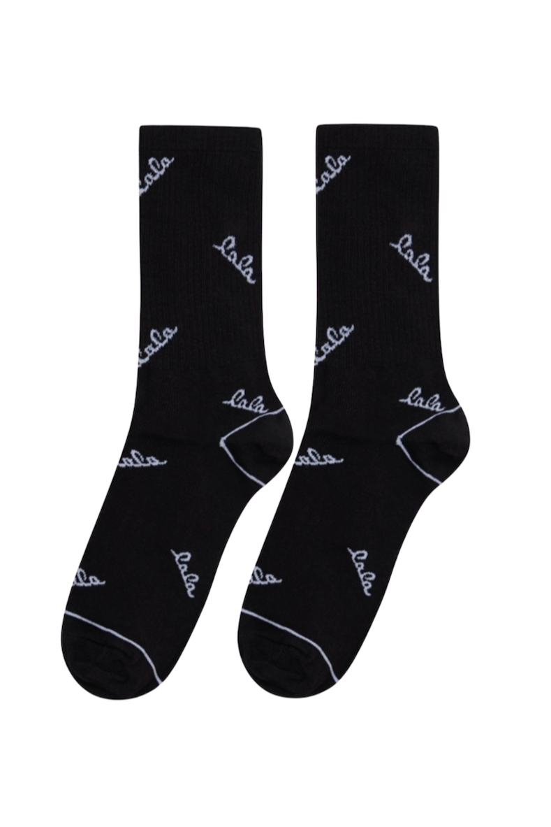 Sorte strømper fra LALA BERLIN med karakteristisk hvidt logoprint. Den høje bomuldsandel gør strømperne behagelige til afslappende stunder derhjemme, mens den vandafvisende behandling giver ekstra funktionalitet.