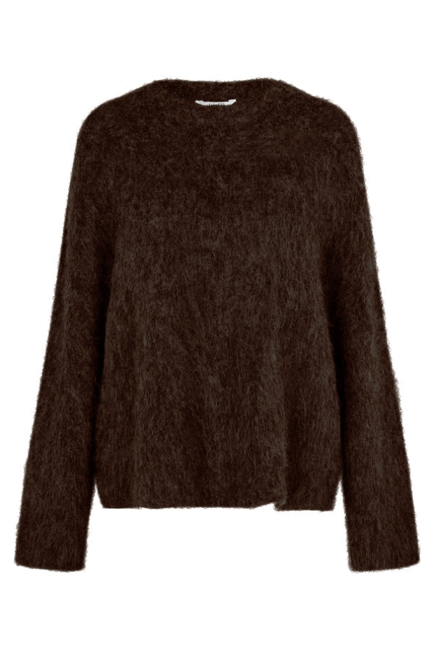 Denne oversized striktrøje fra MbyM har en karakteristisk fuzzy tekstur, der giver en behagelig og varm følelse. Den brune farve er nem at style med jeans eller leggings til et afslappet hverdagslook.
