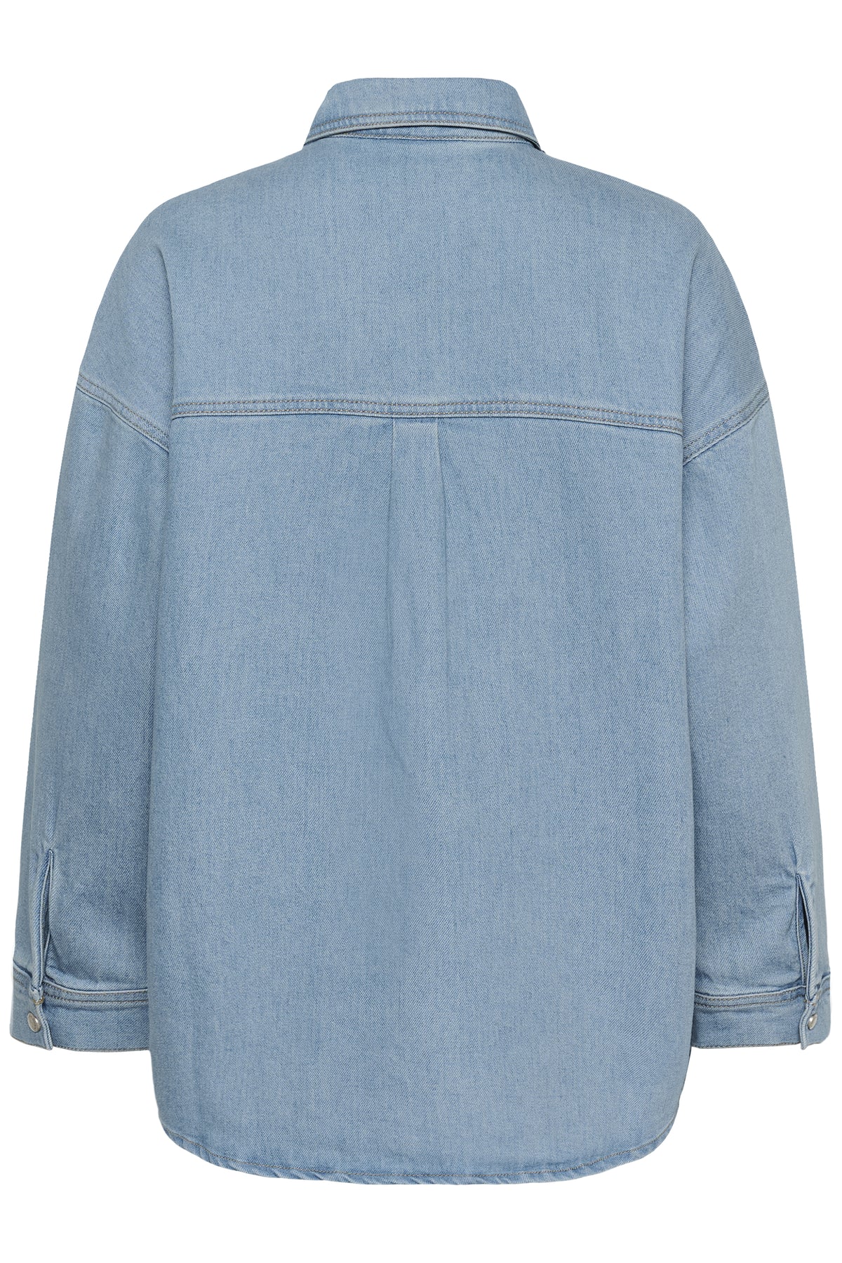 Oversize denimskjorte i en lys blå vask med kontrastdetaljer. Skjorten har klassisk krave, trykknaplukning foran og brede 3/4-ærmer, der giver et afslappet og moderne udtryk. De to markante brystlommer i mørkere denim skaber et cool, patchwork-inspireret look.