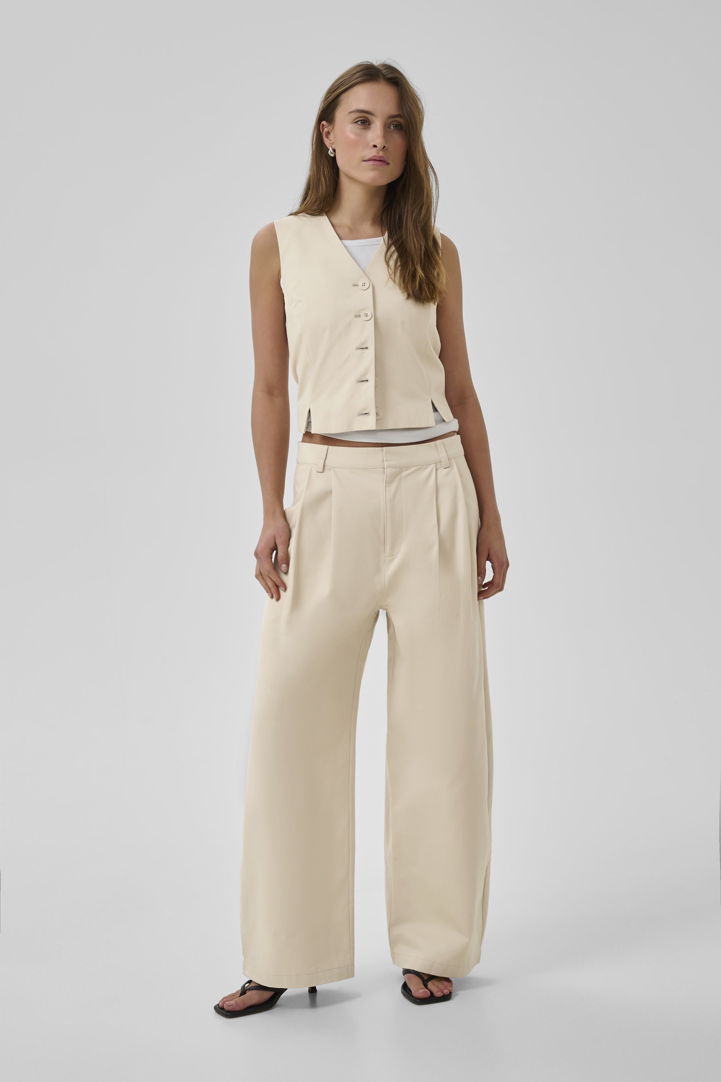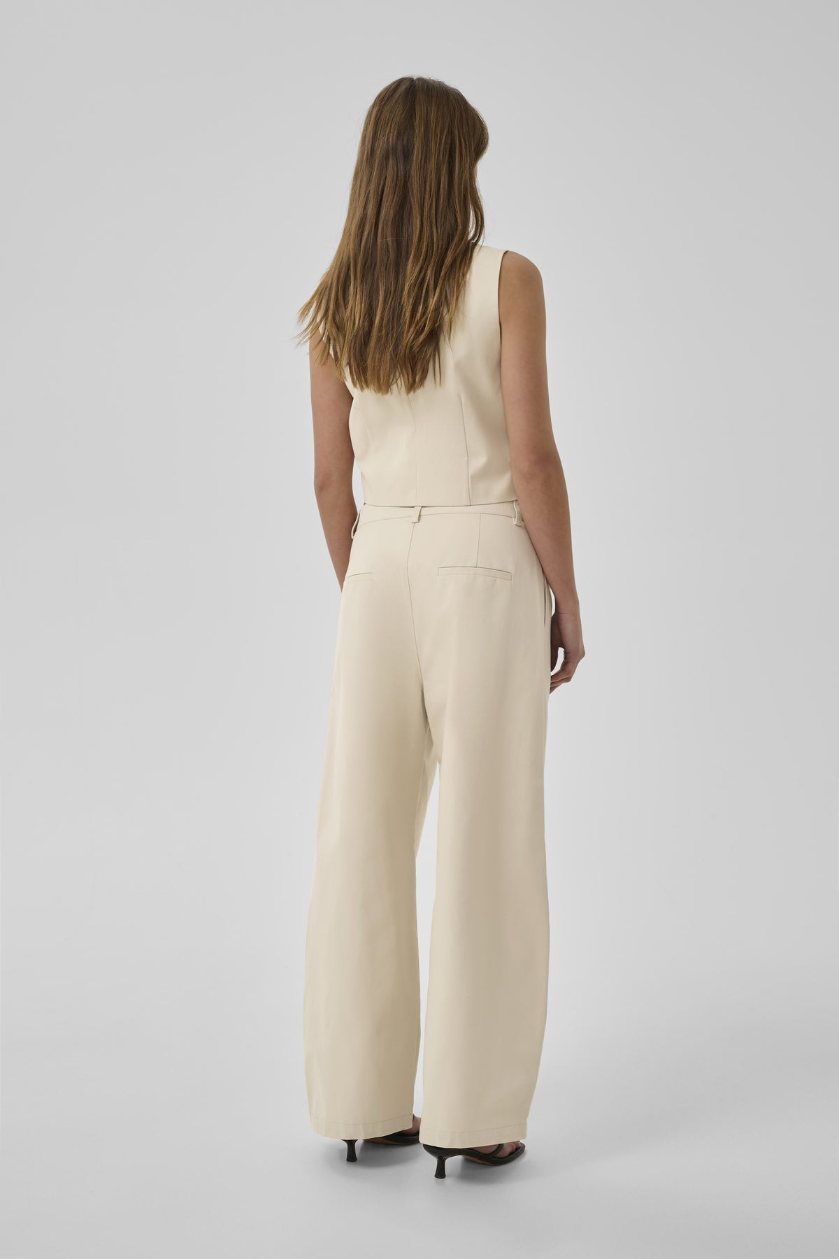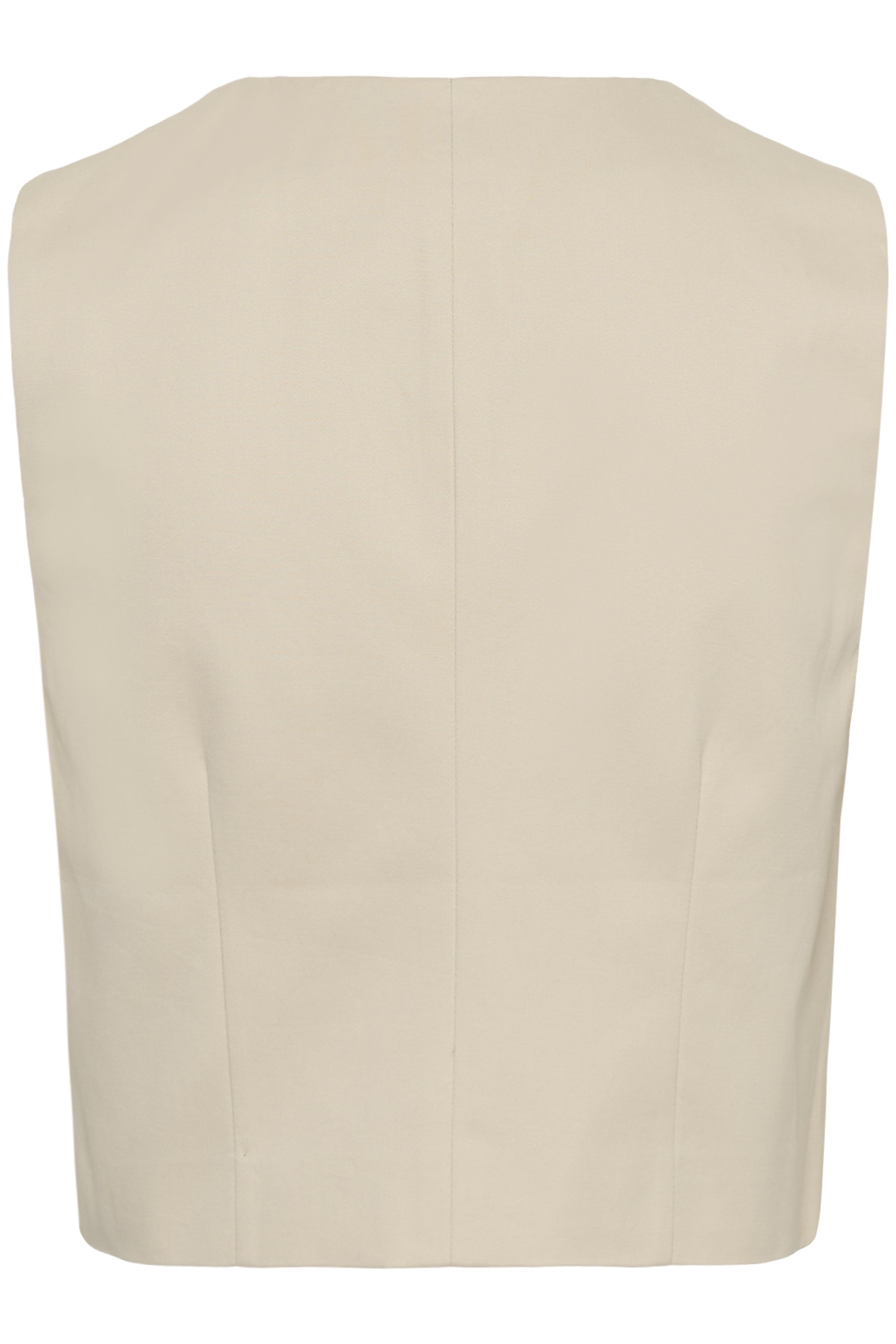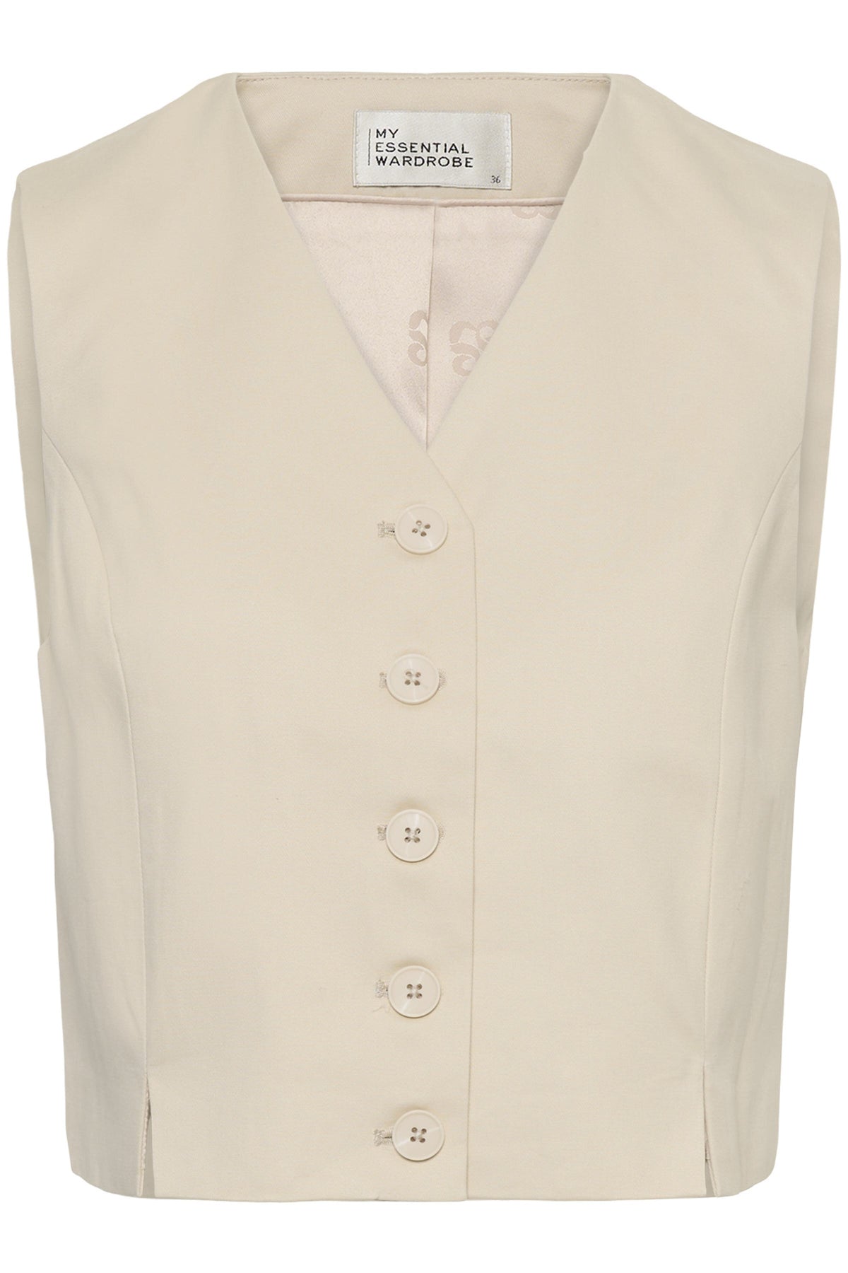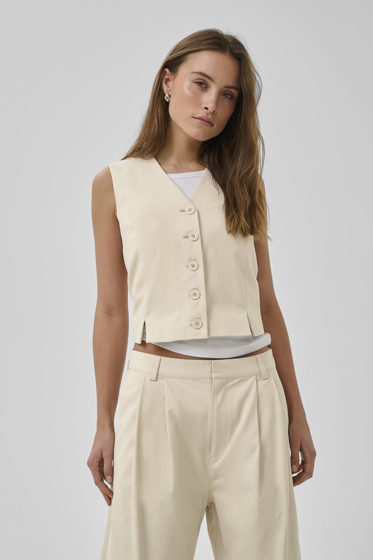 Gisva Vest fra My Essential Wardrobe er en stilren og moderne vest i en blød, lys beige nuance. Designet er enkelt og elegant med en klassisk V-udskæring og gennemgående knaplukning foran, som giver et sofistikeret udtryk. Den ærmeløse silhuet og let figursyede pasform fremhæver kroppen på en flatterende måde, mens de diskrete slidser i siderne sikrer bevægelsesfrihed og komfort.