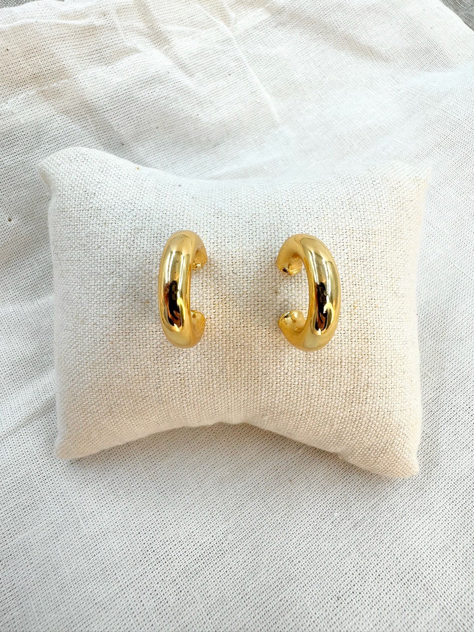 Disse NINE Mira Small øreringe har et buet design i 18 karat guldbelagt rustfrit stål. Med en diameter på 3 cm og en vandtæt konstruktion er de velegnede til både hverdag og fest.