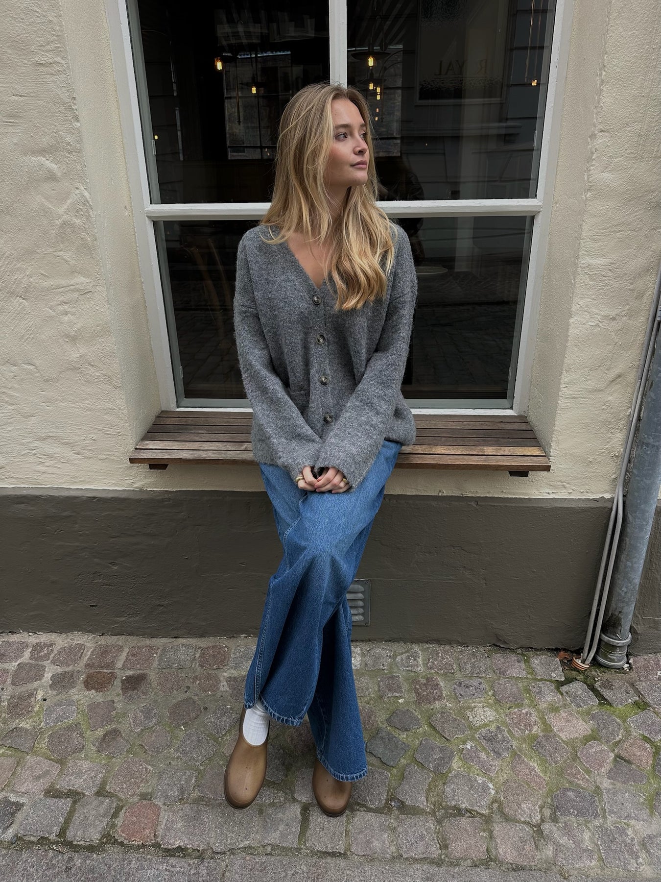 Lang og blød cardigan fra Noisy May. Strikken har en dyb v-udskæring, knapper foran og to lommer. Derudover er den i en løs pasform.