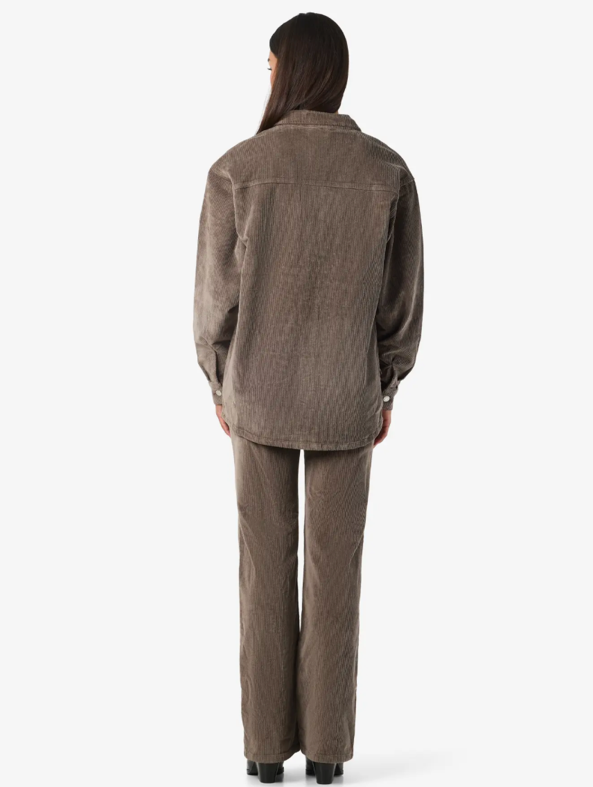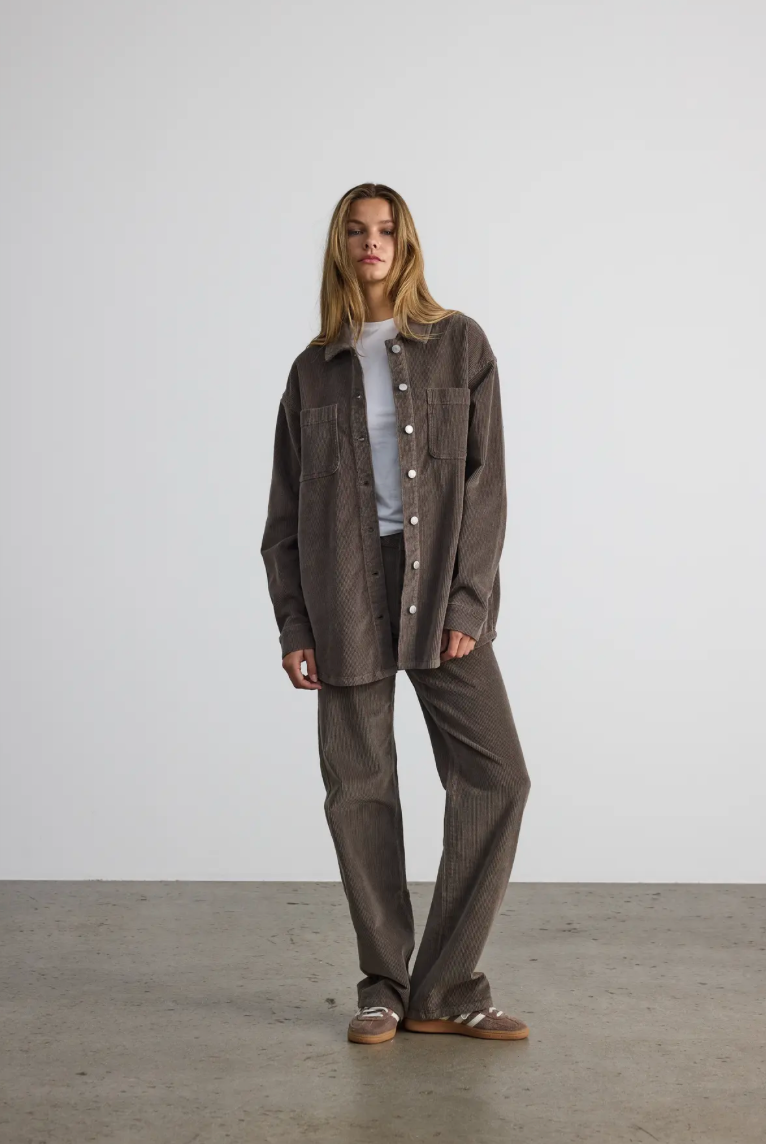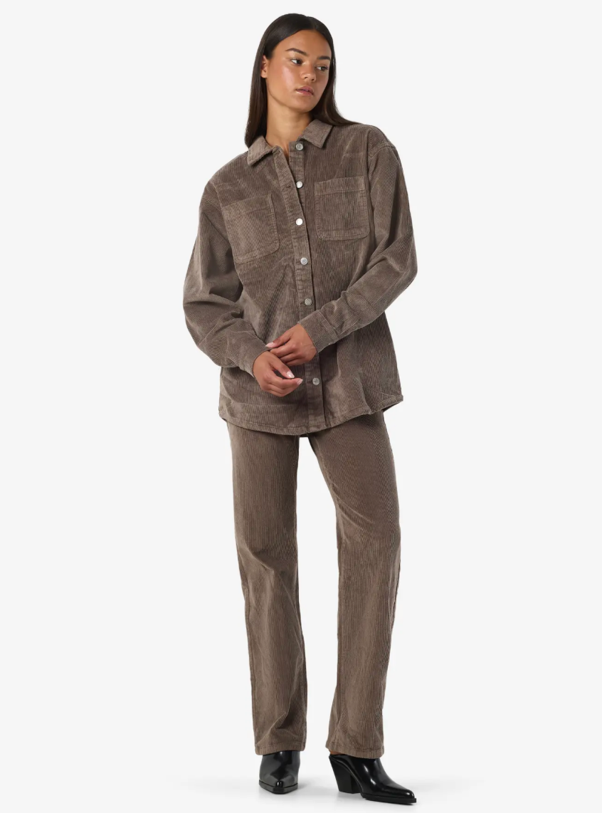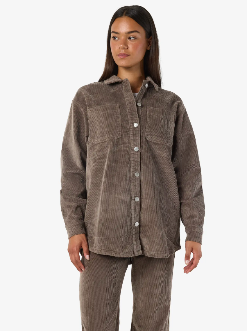 En brun jakke fra Noisy May med løs, oversize pasform. De store forlommer giver både praktisk opbevaring og et casual udtryk. Knaplukningerne foran gør det nemt at justere jakken efter behov.