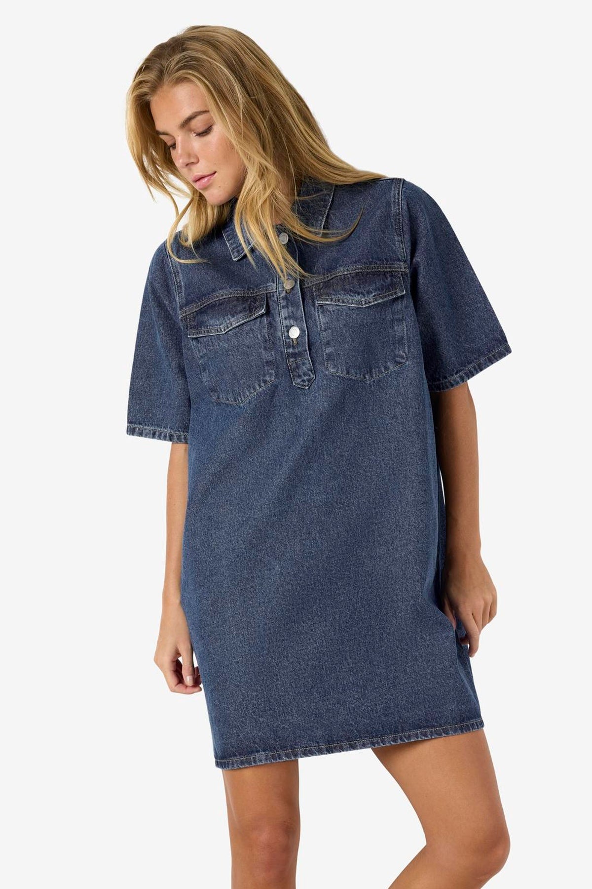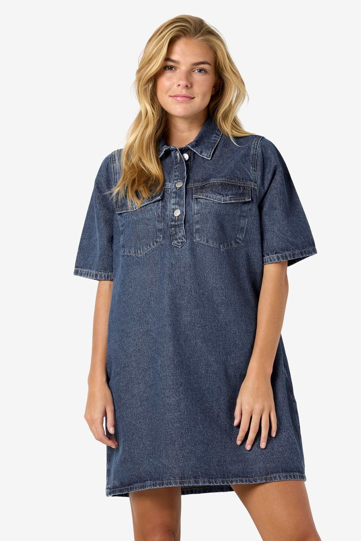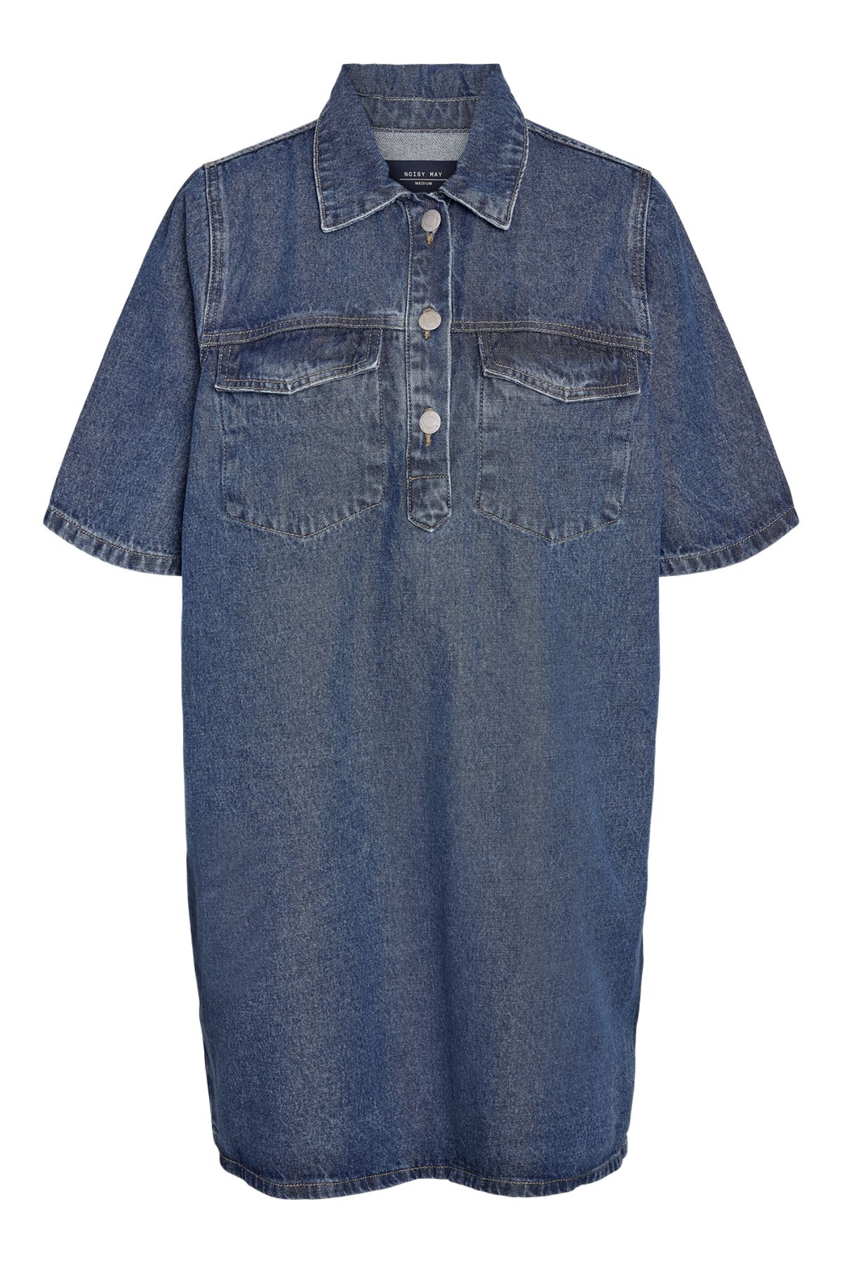 Denne korte denimkjole i medium blå denim kombinerer et klassisk skjortekrave-design med korte ærmer og en regulær pasform, hvilket gør den til et alsidigt valg til enhver garderobe. Kjolen her fra Noisy May har knaplukning foran og praktiske lommer både på brystet og foran. Den bløde fornemmelse skyldes en enzymvask, der også giver en diskret falmet effekt, perfekt til et afslappet og stilfuldt look.