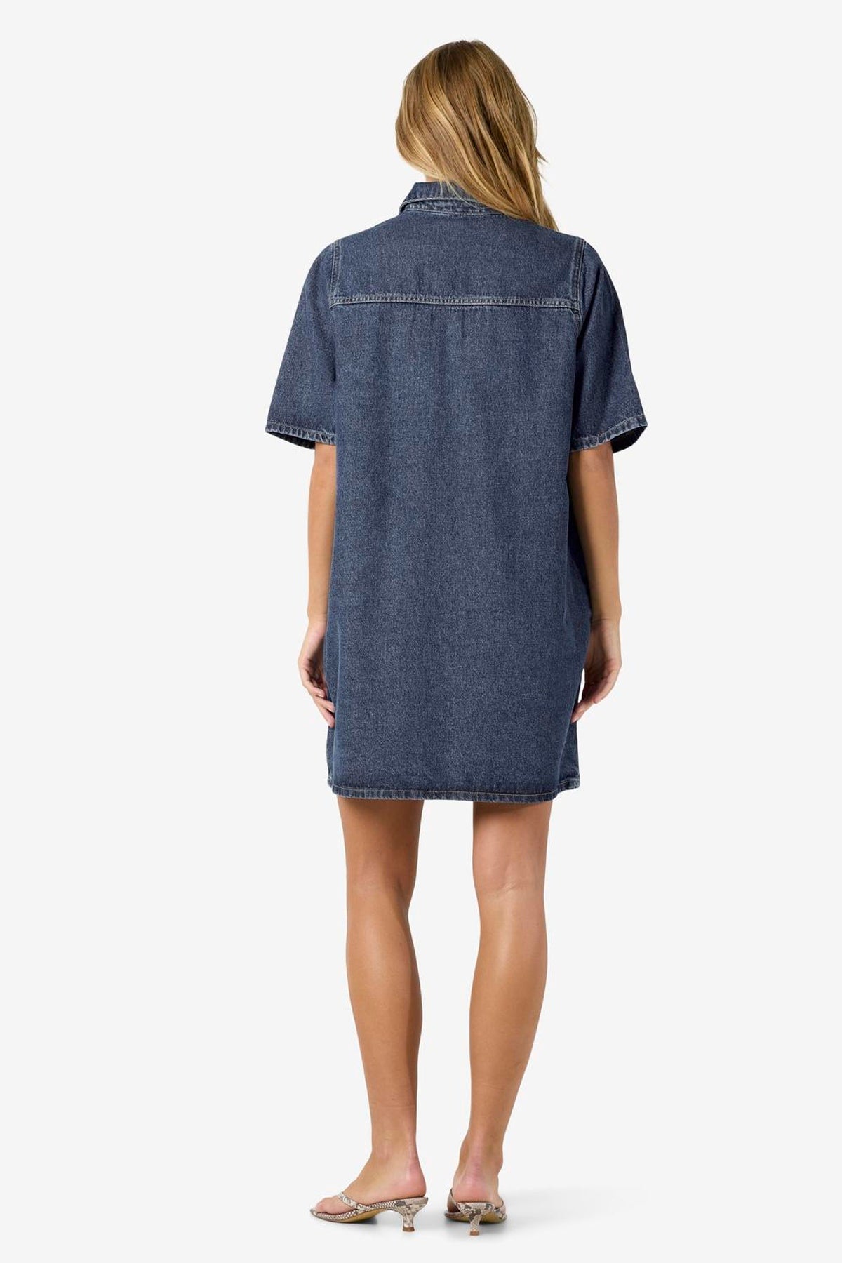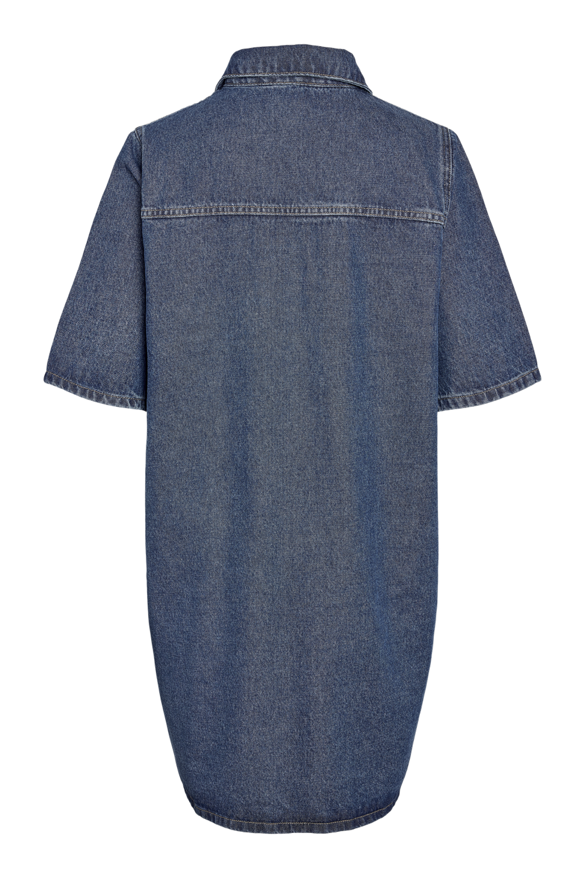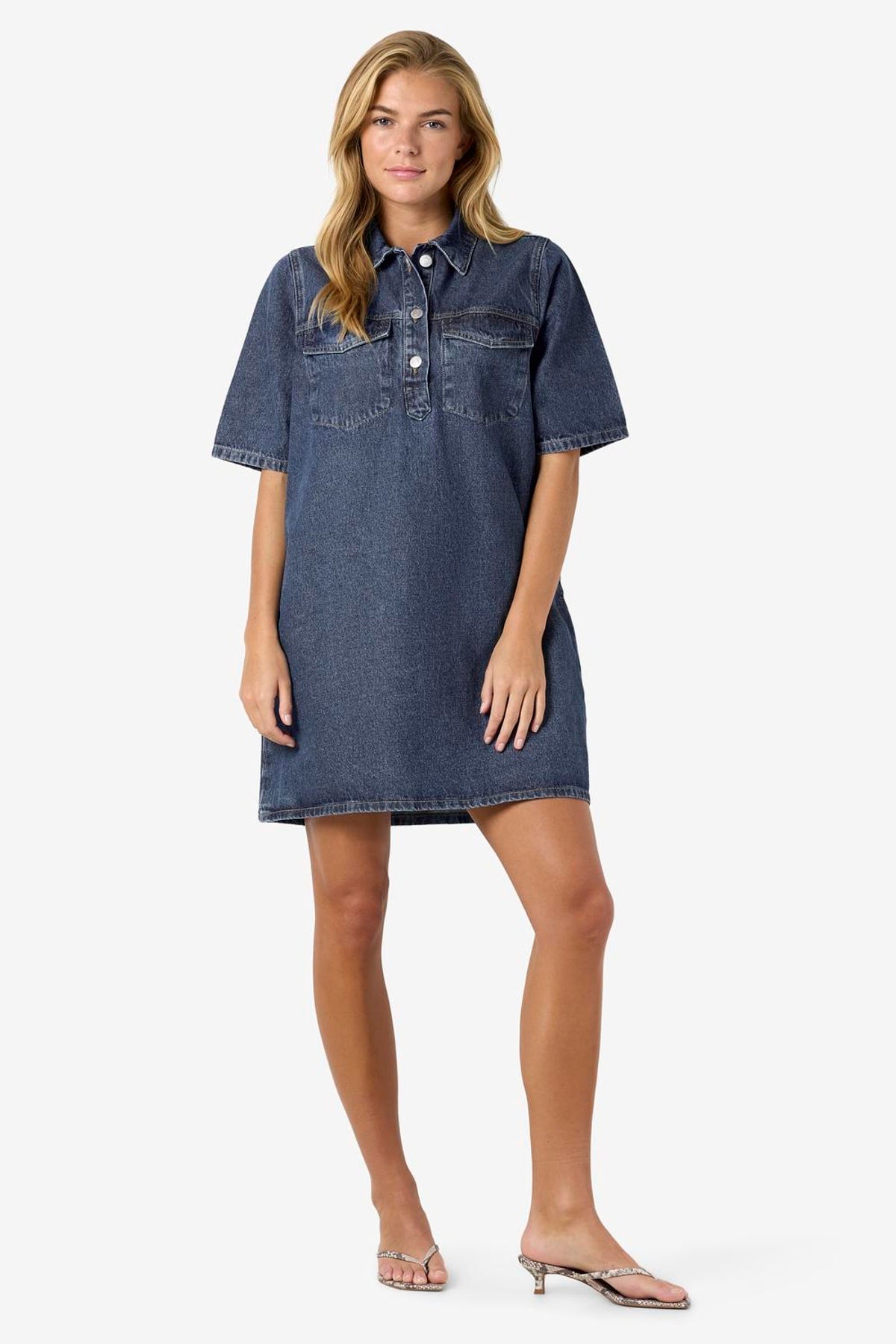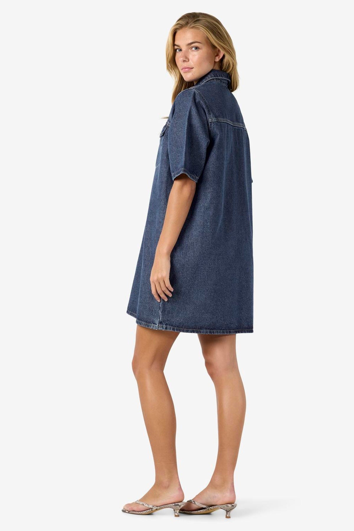 Denne korte denimkjole i medium blå denim kombinerer et klassisk skjortekrave-design med korte ærmer og en regulær pasform, hvilket gør den til et alsidigt valg til enhver garderobe. Kjolen her fra Noisy May har knaplukning foran og praktiske lommer både på brystet og foran. Den bløde fornemmelse skyldes en enzymvask, der også giver en diskret falmet effekt, perfekt til et afslappet og stilfuldt look.