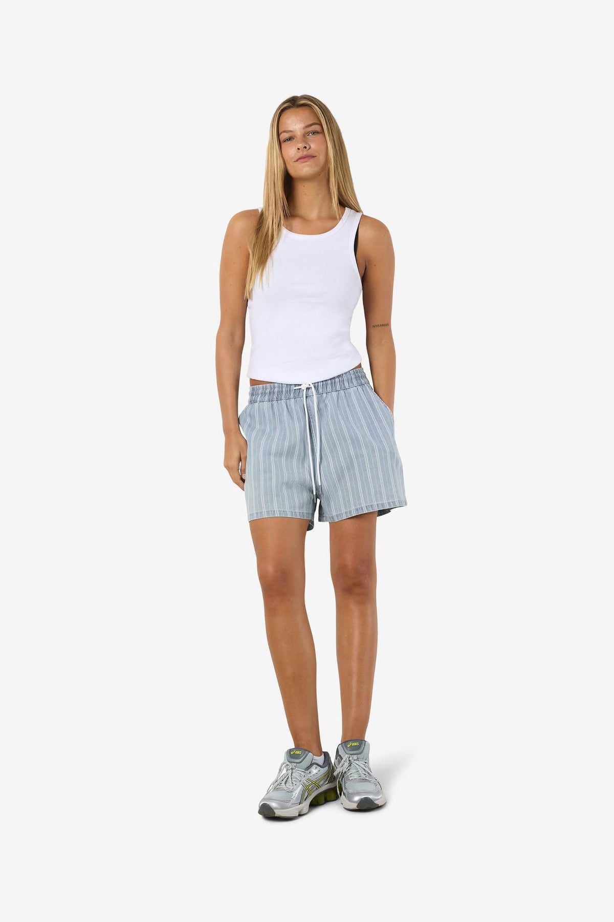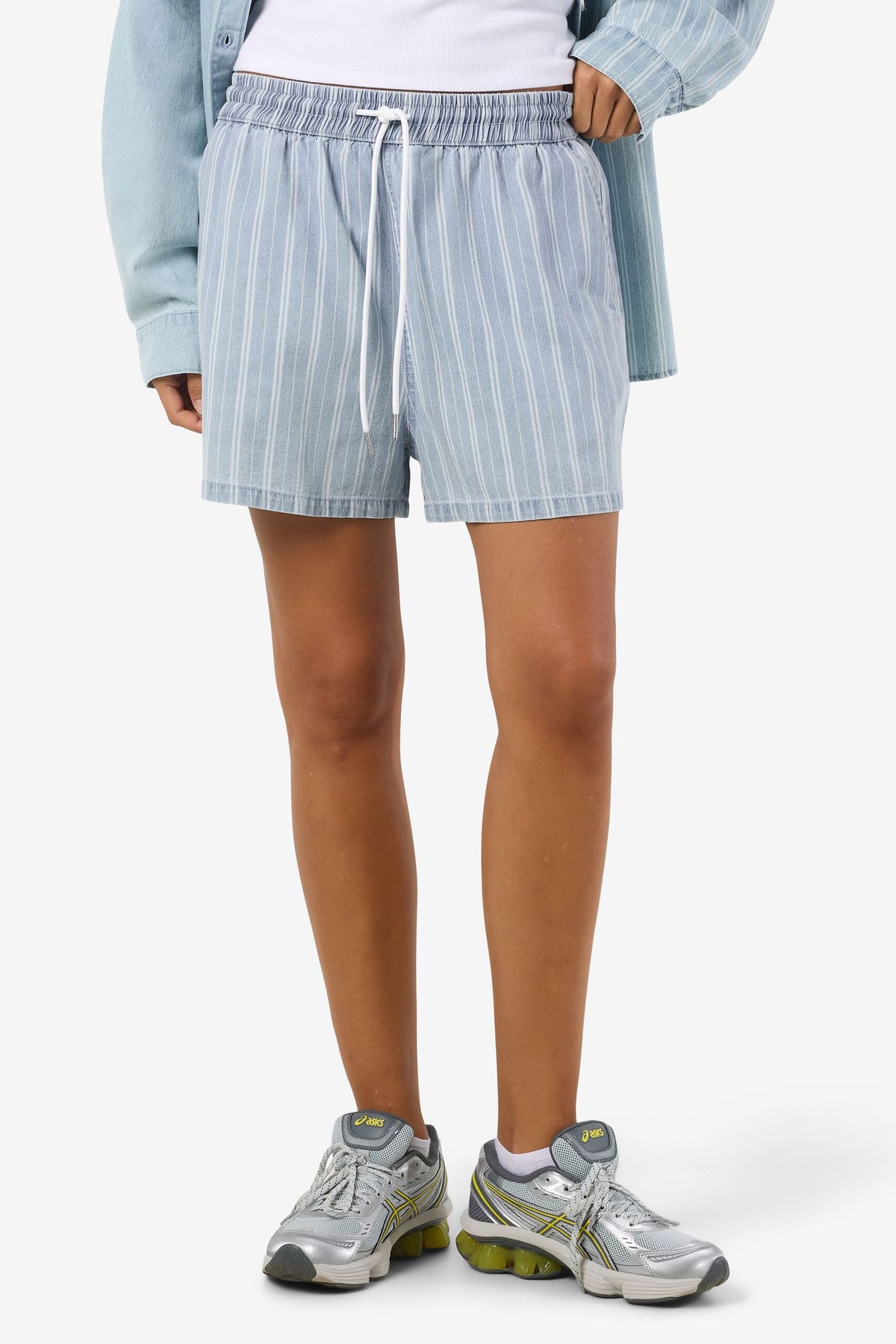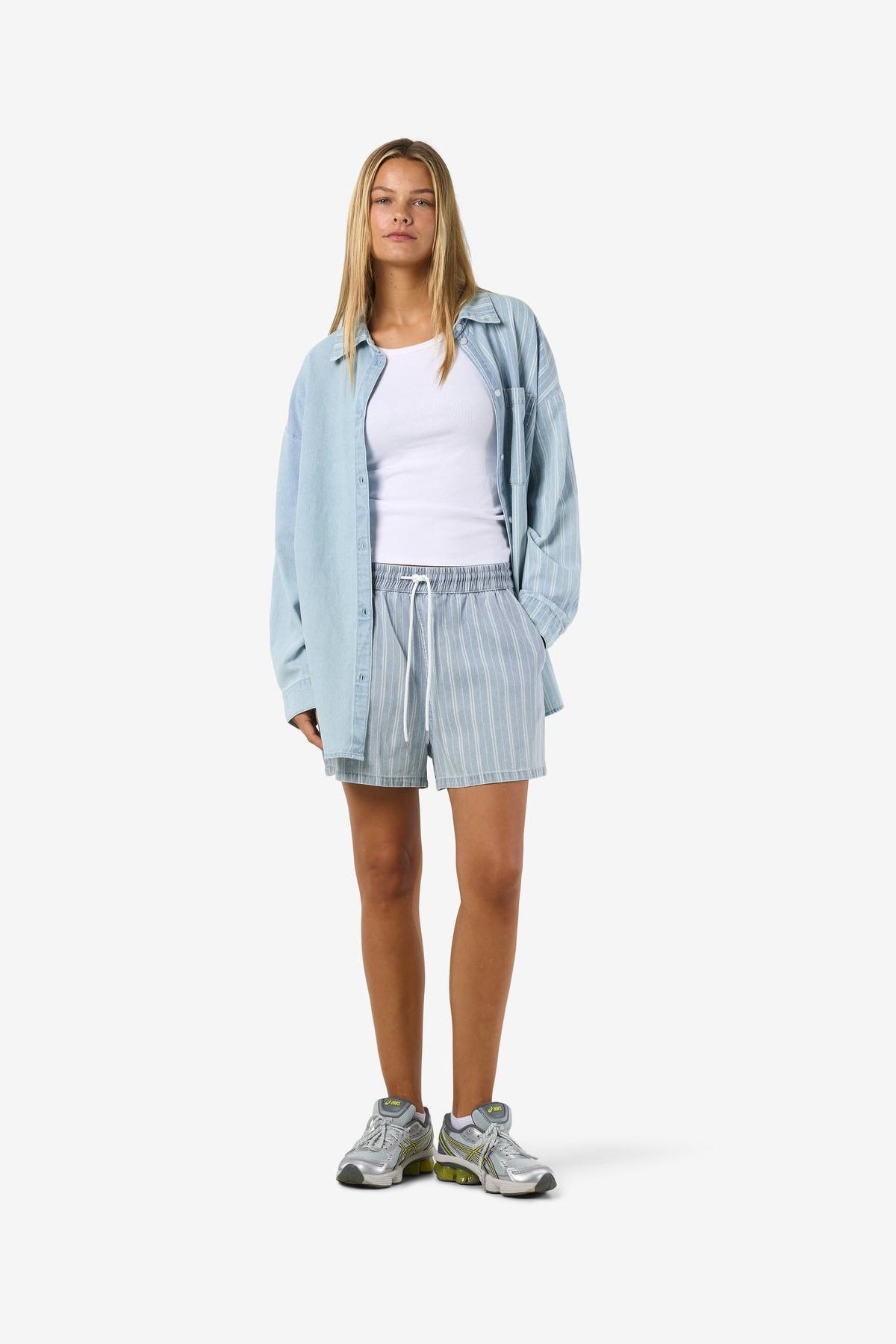 Disse elastikshorts kombinerer komfort med et afslappet look, ideelle til hverdagens aktiviteter. Shortsen er lavet af en blød blanding af 80% bomuld og 20% genanvendt bomuld, hvilket giver både åndbarhed og et bæredygtigt touch. Den løse pasform sikrer bevægelsesfrihed og et afslappet fit, mens den mellemblå farve gør dem lette at style med forskellige overdele.