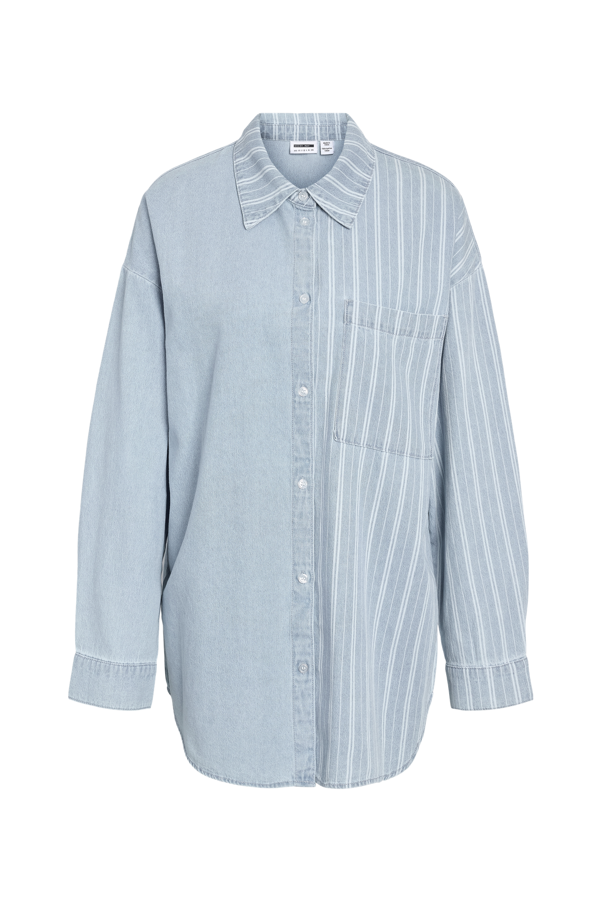 Denne oversized skjorte i medium blå denim kombinerer klassisk design med et moderne, afslappet snit. Den er fremstillet i en blød blanding bestående af 80% bomuld og 20% genanvendt bomuld, hvilket giver både komfort og et mere bæredygtigt valg. Den lange ærmelængde og den traditionelle skjortekrave understreger det tidløse look, der passer godt til forårsbrug.