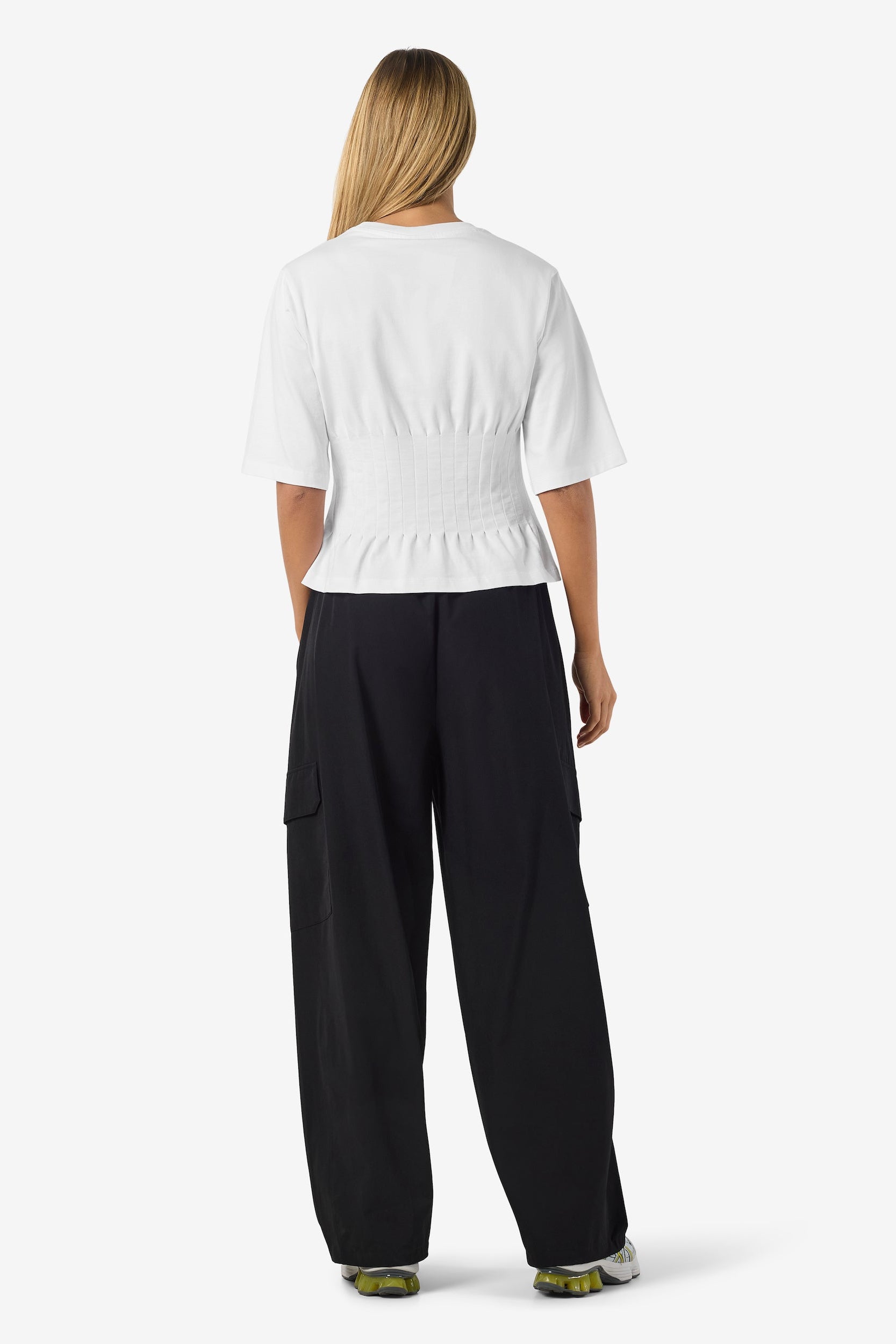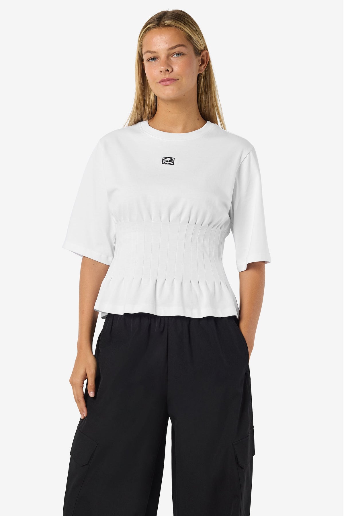 Denne hvide T-shirt fra Noisy May kombinerer klassisk komfort med et feminint og moderne twist. Den er fremstillet i 100 % økologisk bomuld i blød single jersey, som giver en let og åndbar kvalitet, perfekt til både hverdag og fritid.