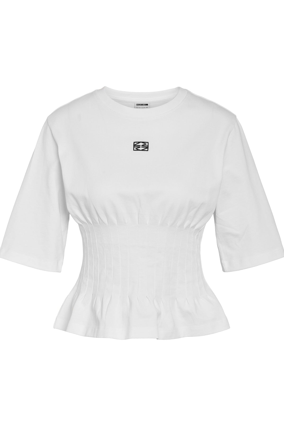 Designet har et elastisk og struktureret livstykke, der fremhæver taljen og skaber en flatterende silhuet. De korte ærmer og den runde hals giver et afslappet udtryk, mens den lille Noisy May-logo-detalje på brystet tilføjer et stilrent touch.