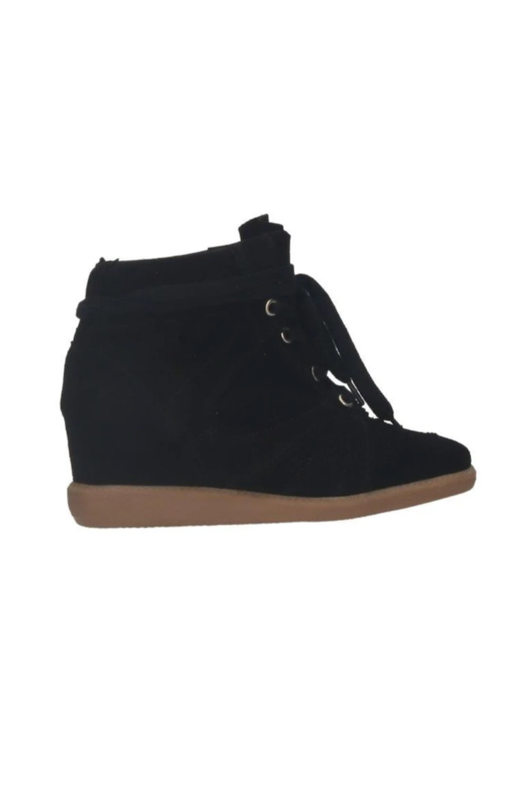 Sort ankelstøvle fremstillet i ruskind med en indvendig plateauhæl. Den er dekoreret med syninger og seje detaljer rundt om støvlen. Snør støvlerne med de lange snørebånd, som kan bindes på forskellige måder.