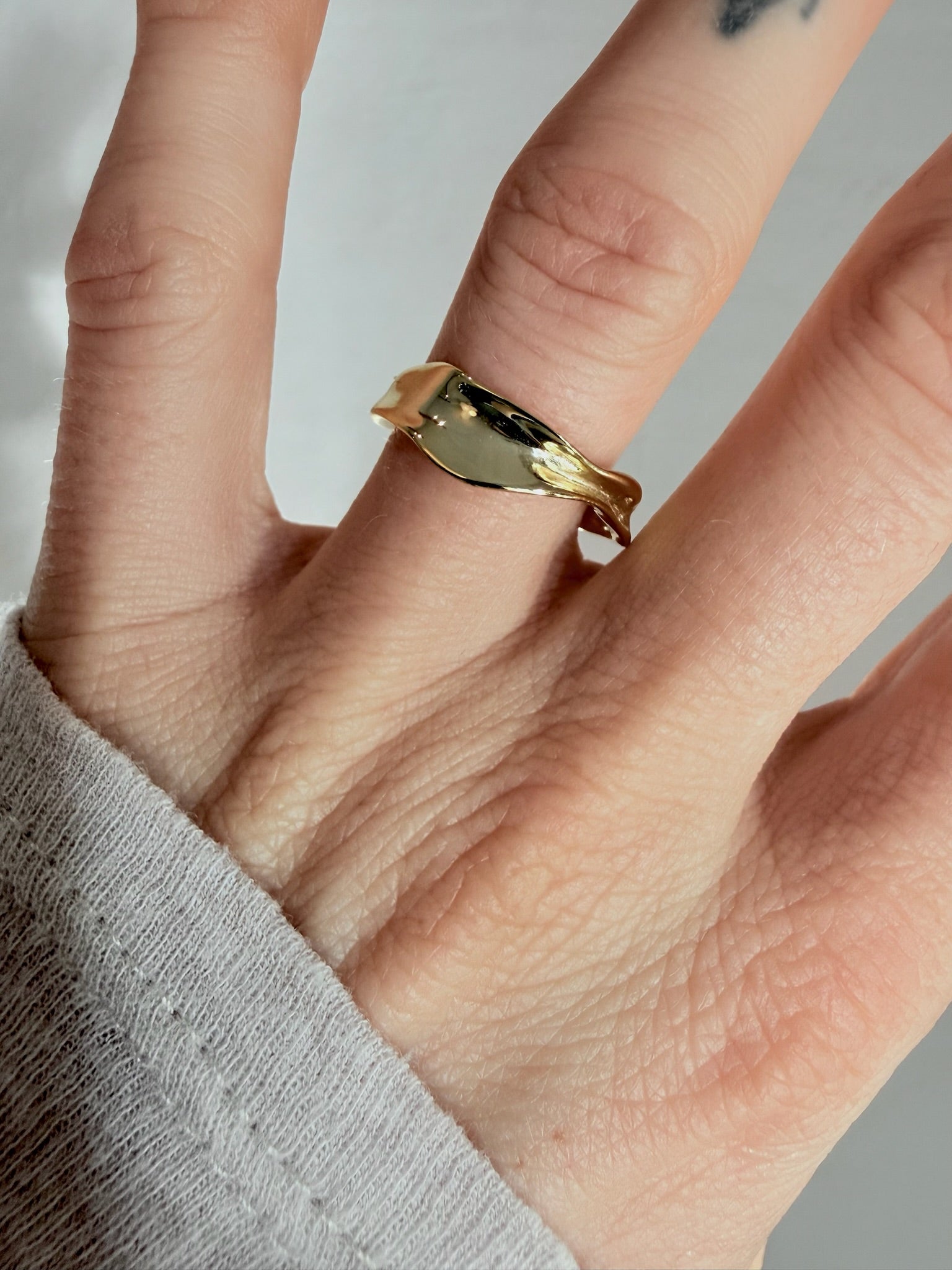 Denne justerbare ring fra Andcopenhagen har en særpræget, snoet form med flere dimensioner. Den skinnende overflade giver et stilfuldt udtryk, der passer til både hverdag og fest.