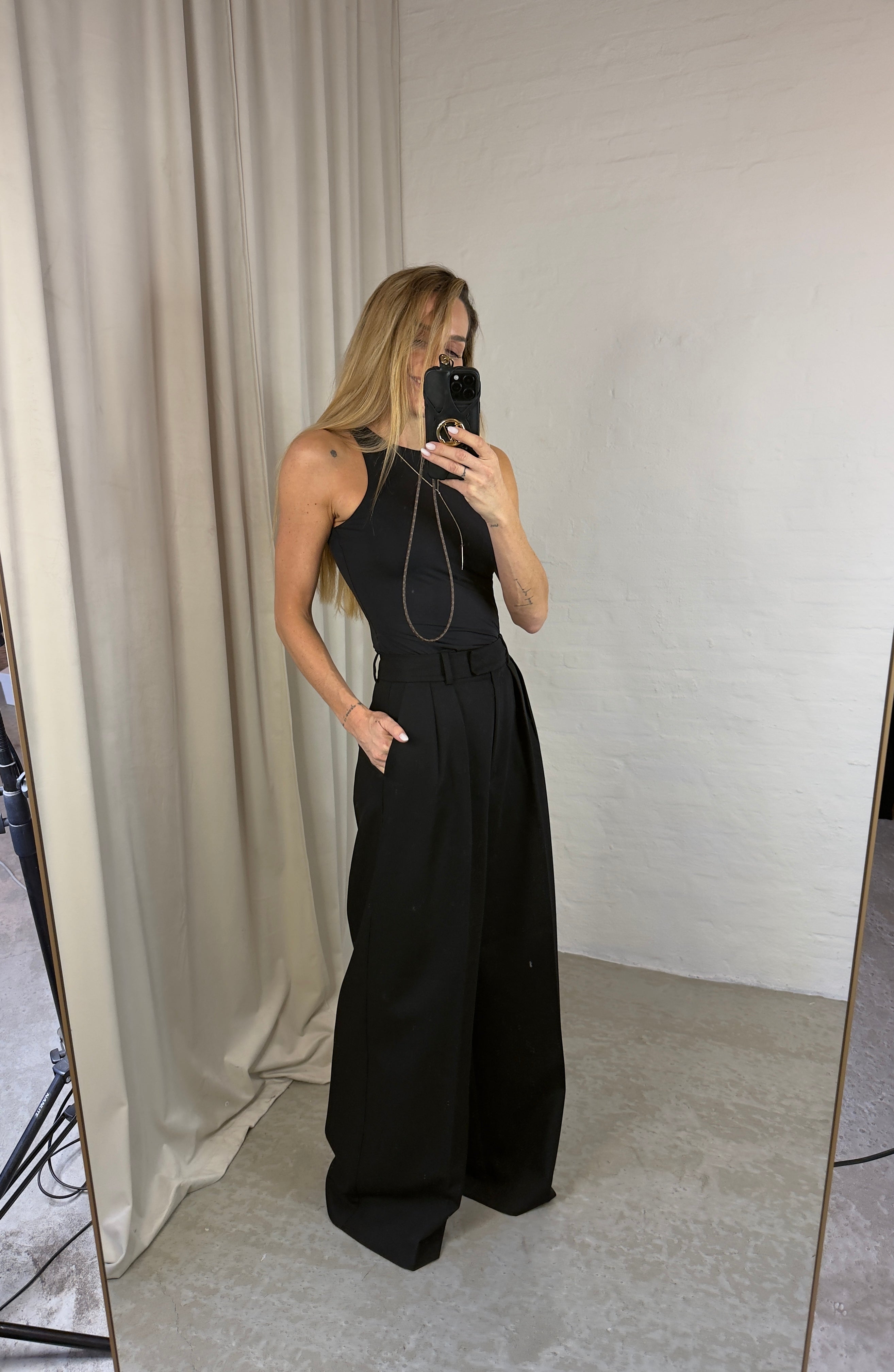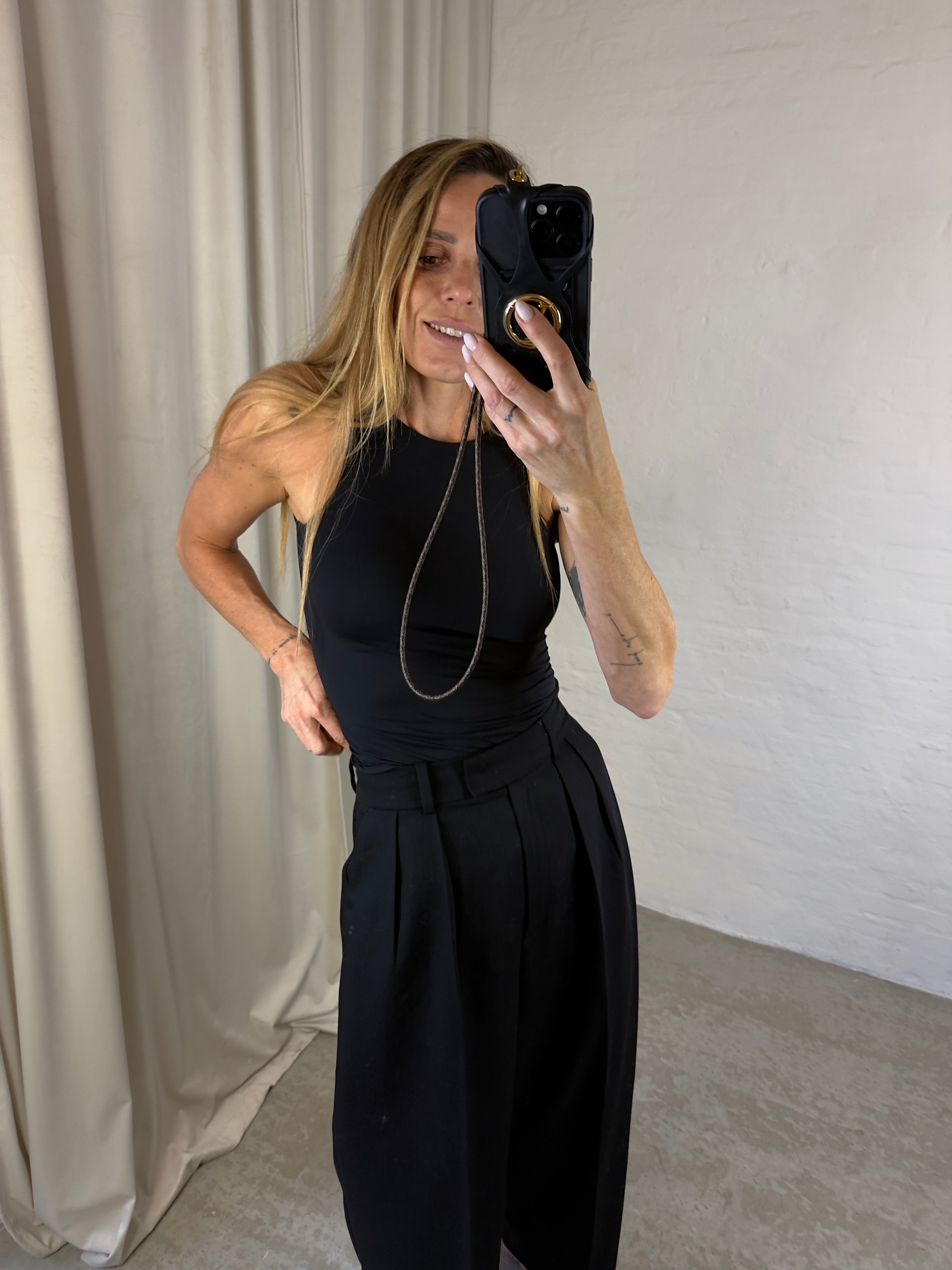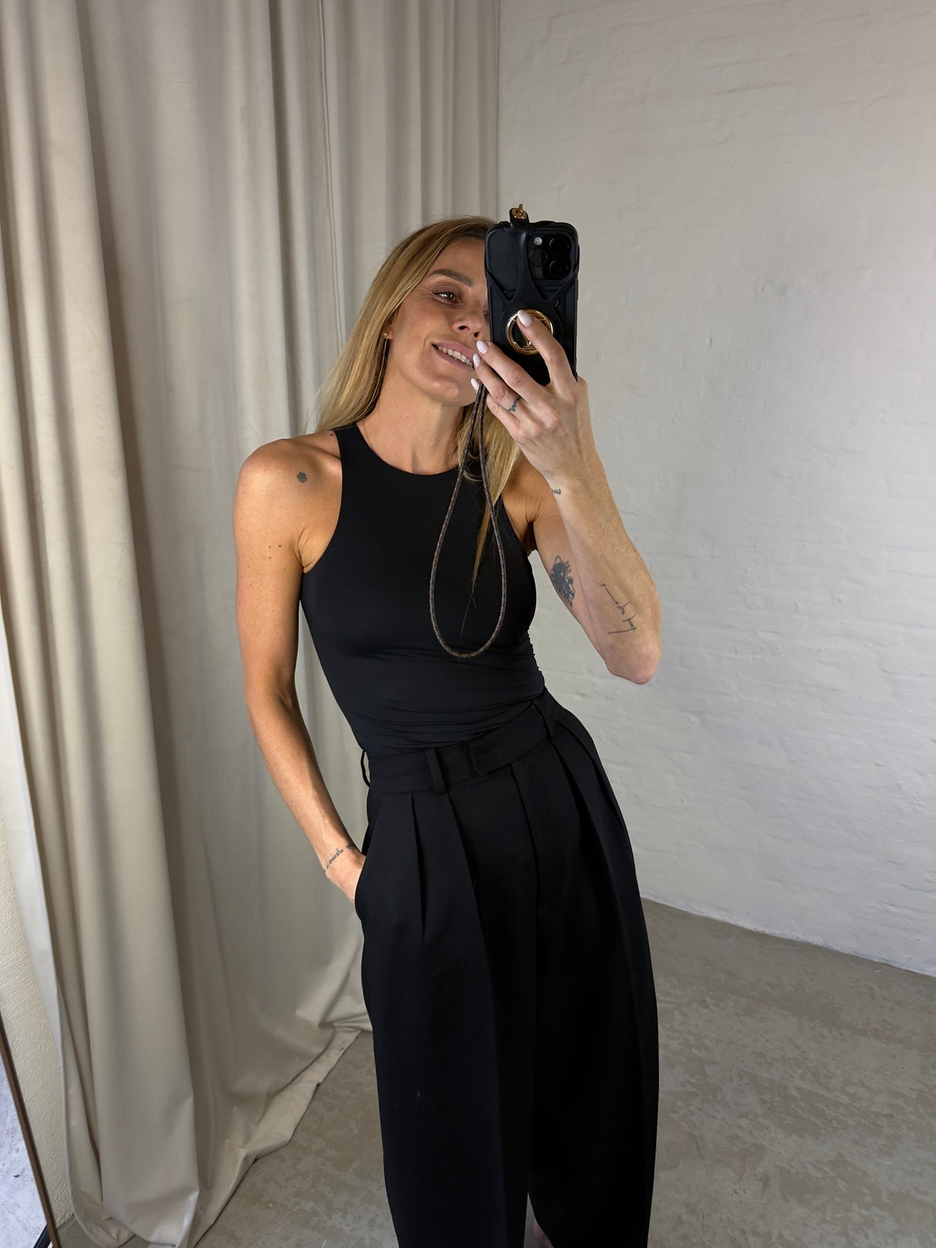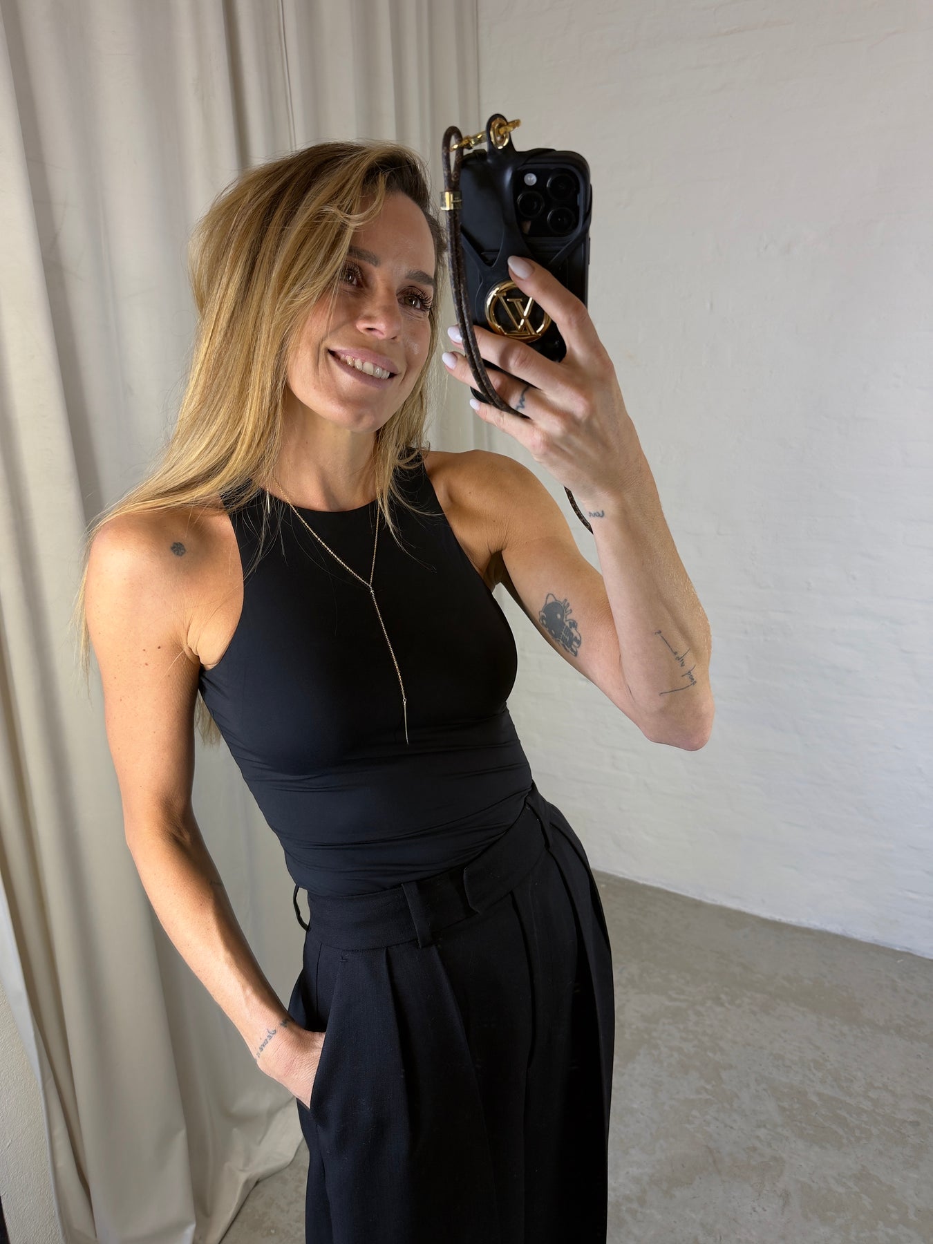 Denne stilrene sorte body fra Sassy Copenhagen kombinerer et moderne design med maksimal komfort. Bodyen har en elegant high-neck udskæring, som giver et minimalistisk og eksklusivt udtryk, perfekt til både hverdag og festlige looks. Snittet er glat og figurformende, og den højt skårne benudskæring giver et flot, langstrakt visuelt udtryk.
