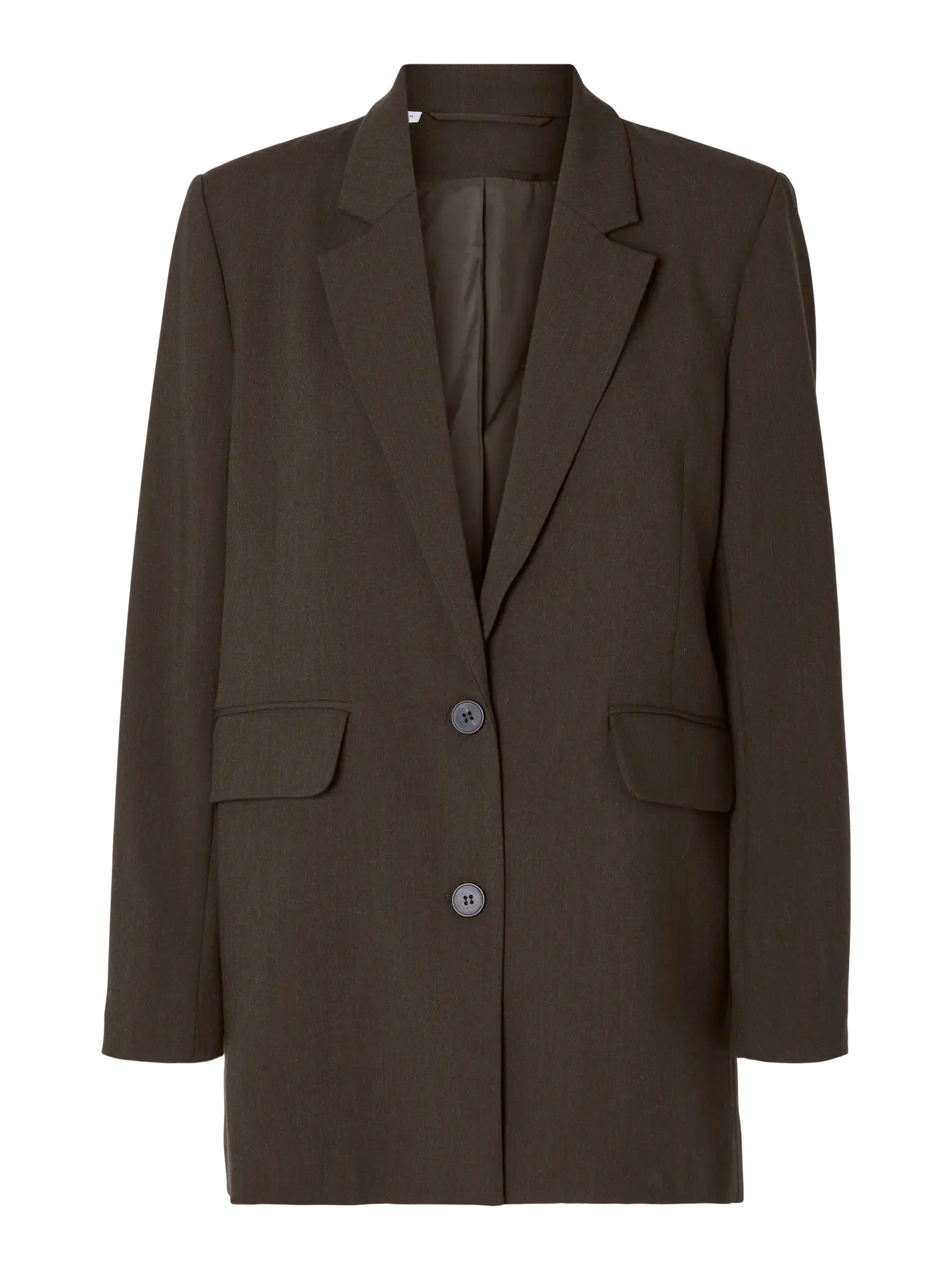 Rita-blazeren fra Selected Femme har en løs pasform, der giver dig frihed til bevægelse gennem lange arbejdsdage. To-knappers lukning og klaplommer tilføjer praktisk funktionalitet, mens skulderpuder skaber en struktureret silhuet.