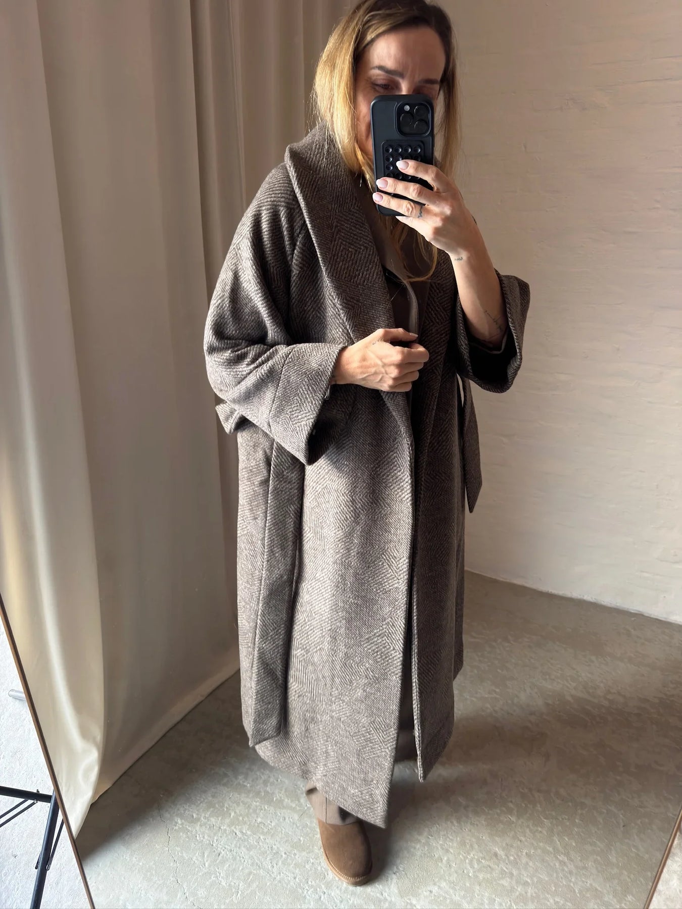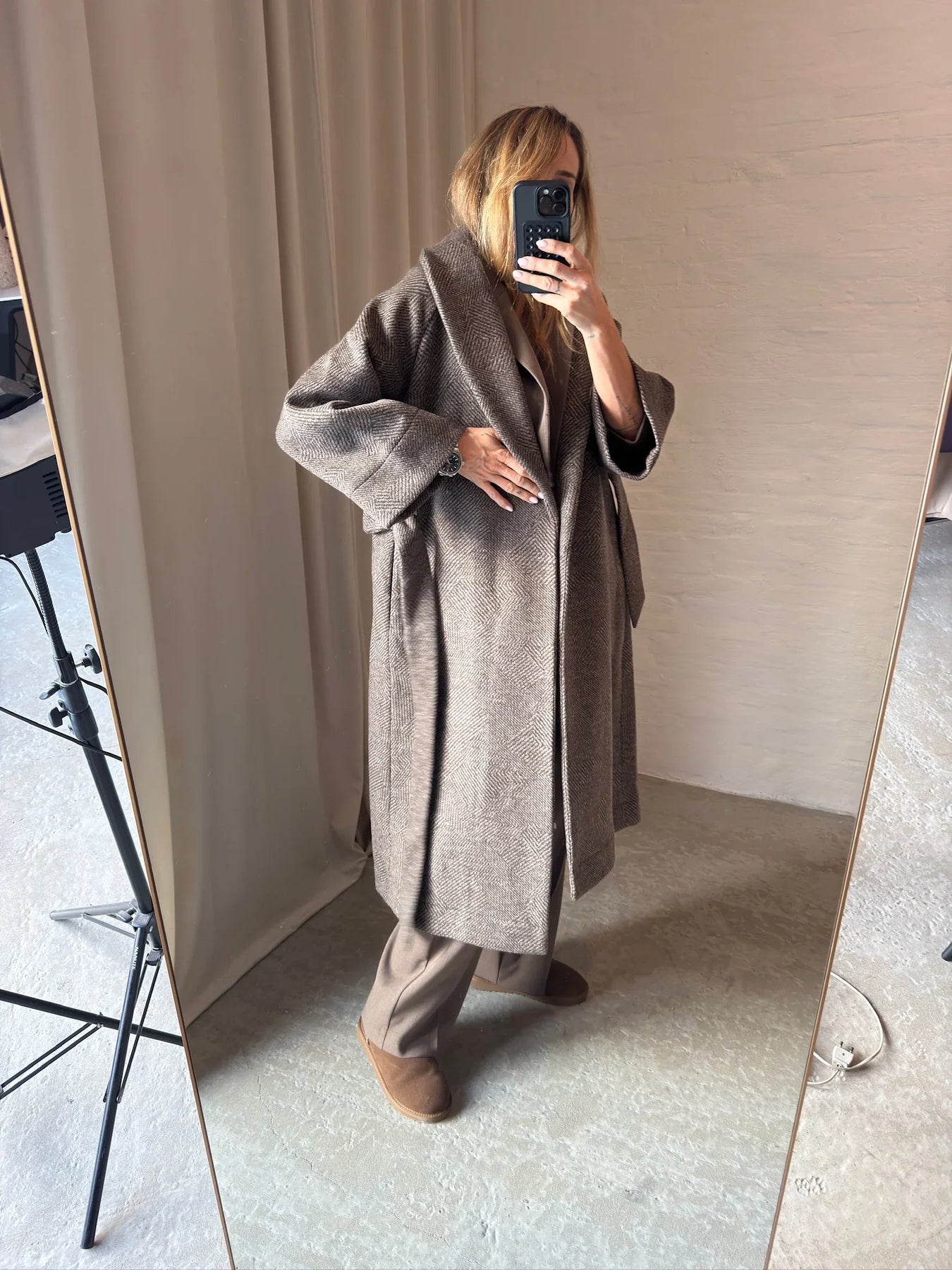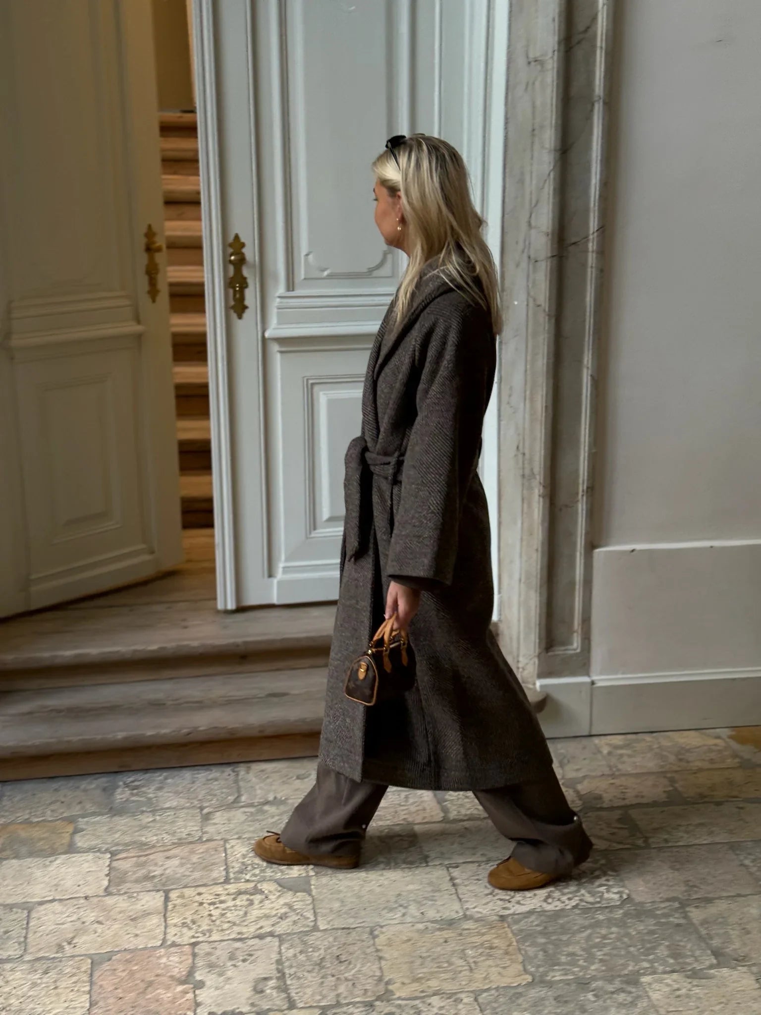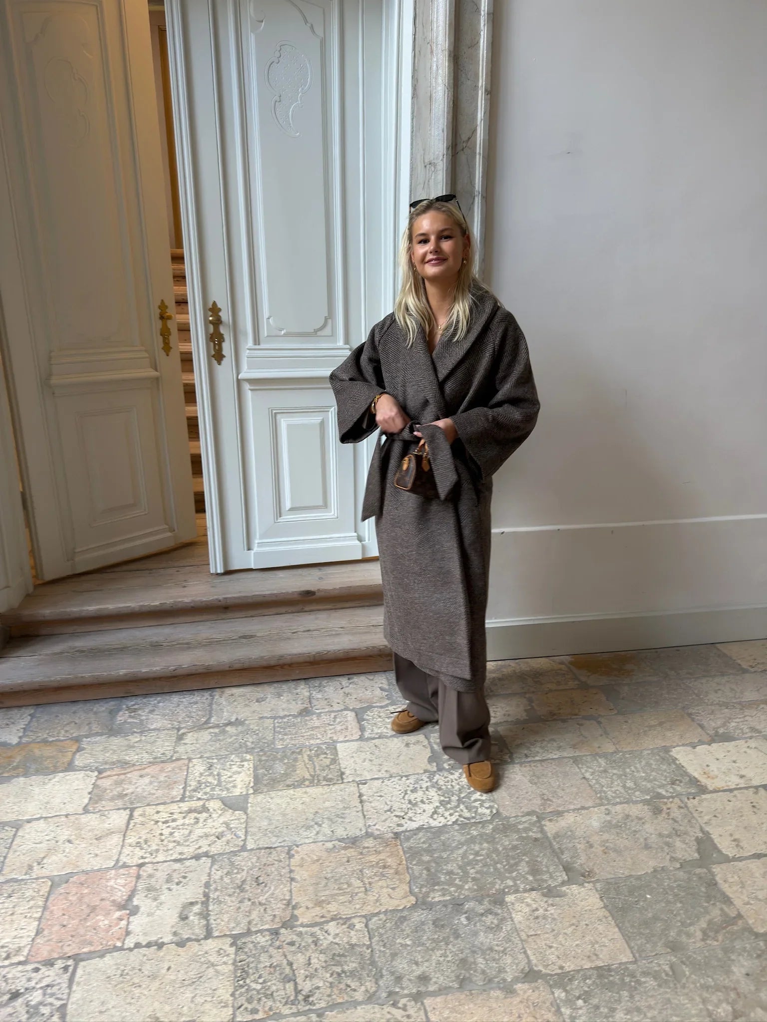 Denne lange uldjakke fra Selected Femme, perfekt til efterår og vinter. Trenchcoaten har en smuk brun nuance med lysere striber, der giver et elegant og tidløst look. Den har et bindebælte i taljen, praktiske lommer i siderne og en klassisk V-udskæring, som fremhæver overkroppen på en flatterende måde.