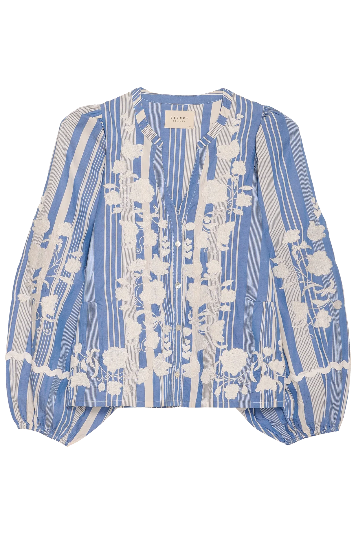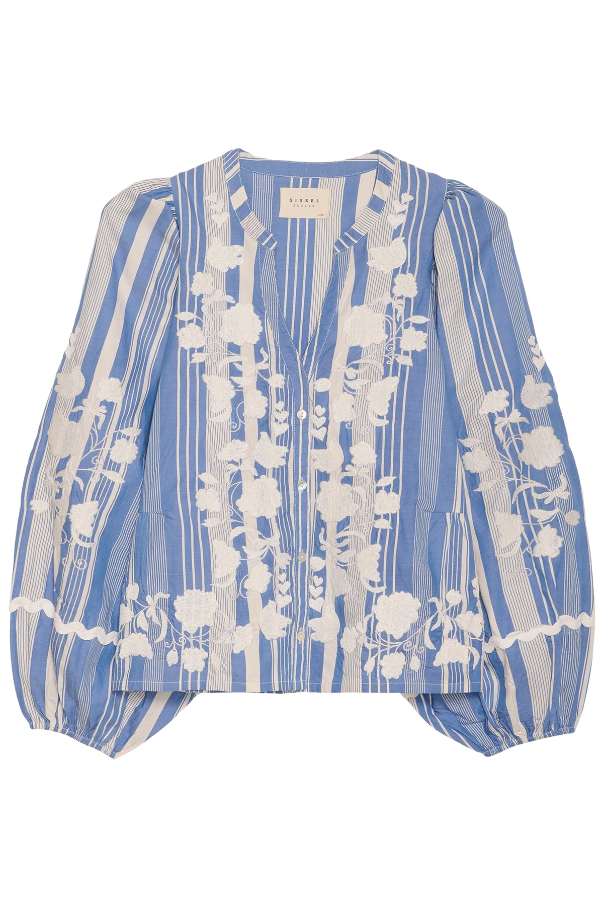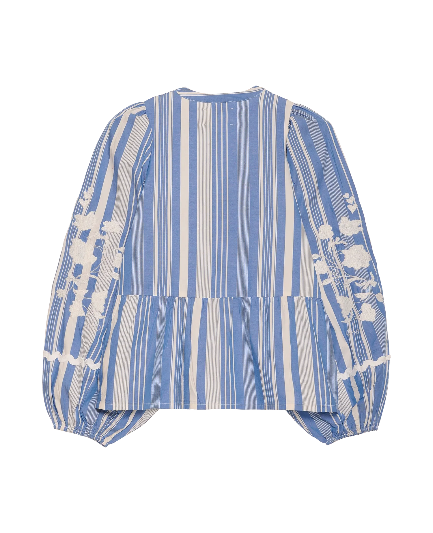Denne skjorte har et friskt blå-hvidt stribet mønster, som er smukt brudt af hvidt blomsterbroderi, der giver et romantisk og let udtryk. Den har en elegant V-udskæring med smal kinakrave og knaplukning foran, som gør den nem at style både til hverdag og mere pæne anledninger.