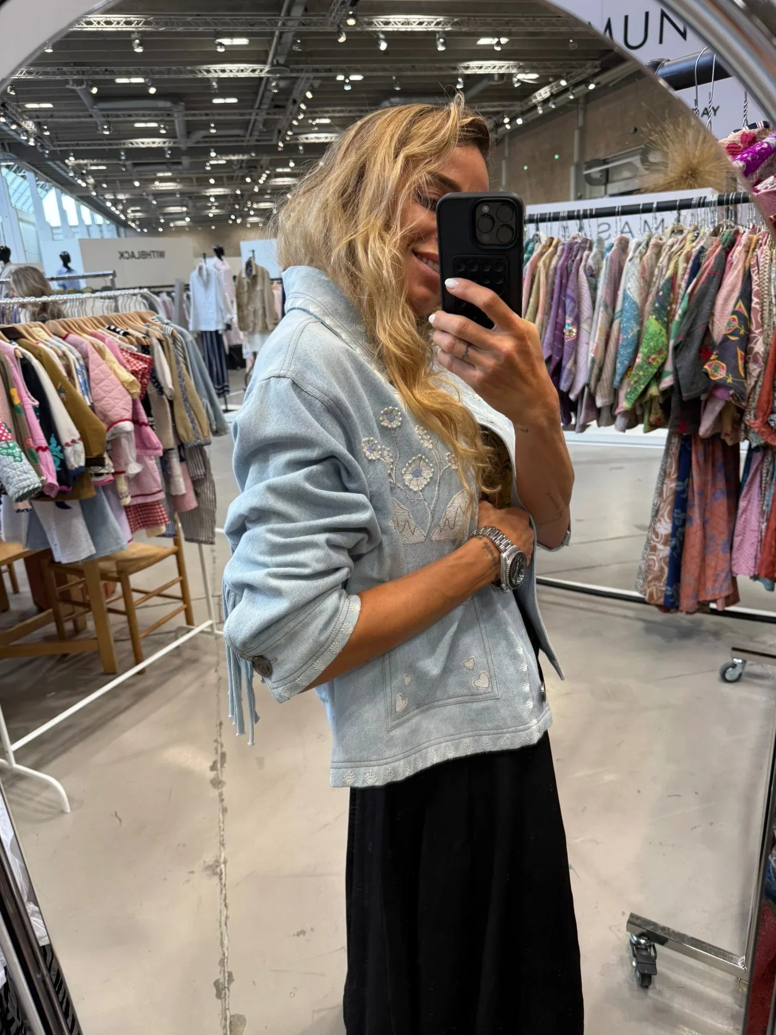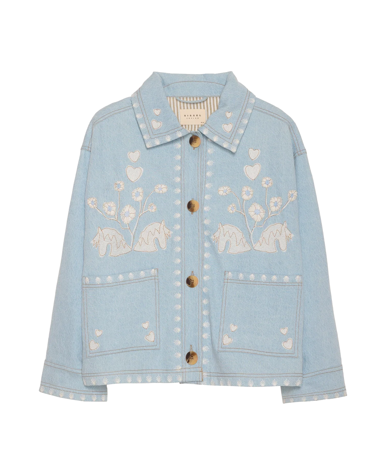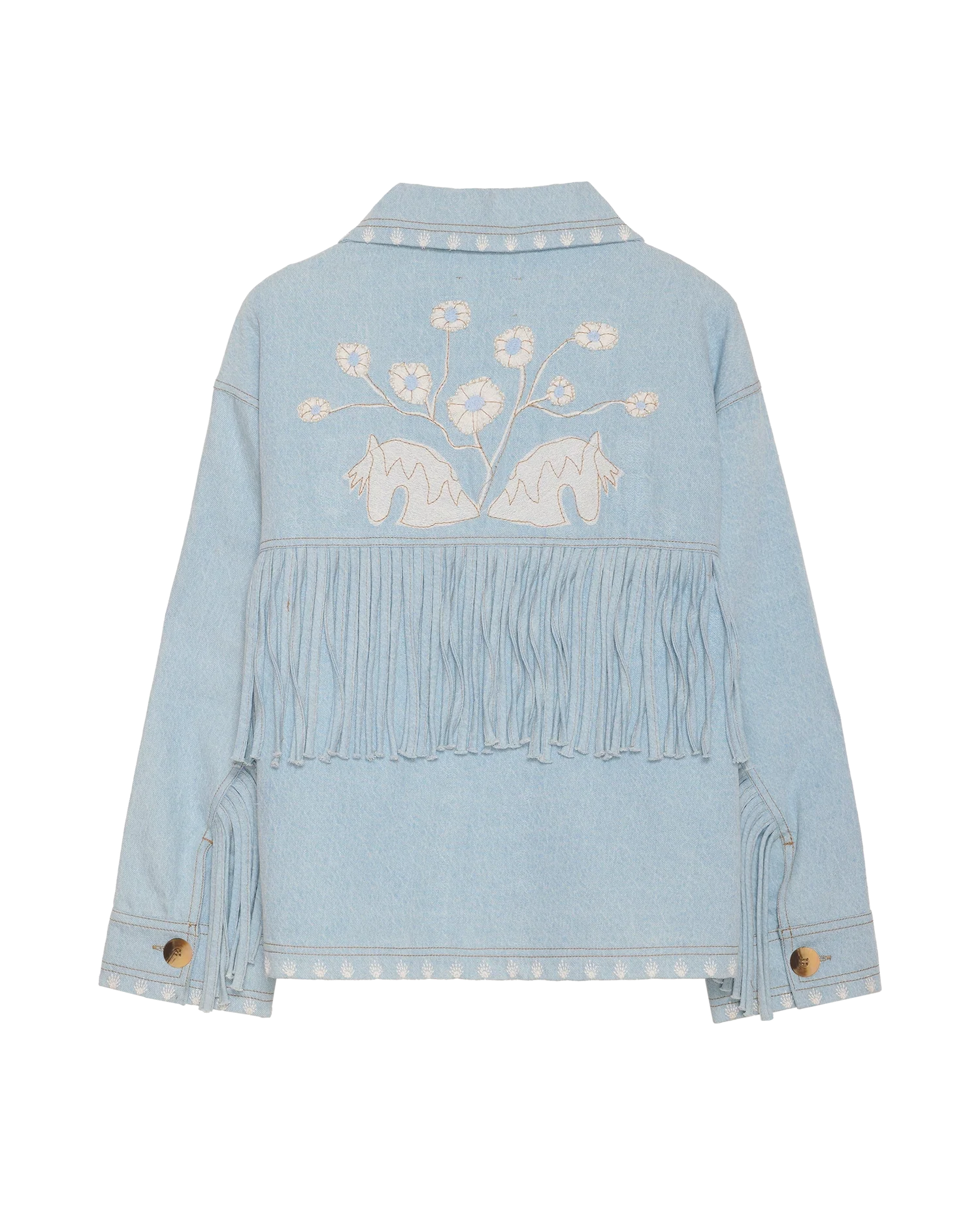 Dekorative frynser i matchende denim løber langs rygstykket og ærmesømmene og giver et legende udtryk. Den er smukt udsmykket med poetisk broderi og fine perledetaljer. Indvendigt er jakken foret med stribet leftover bomuld for et gennemført finish.