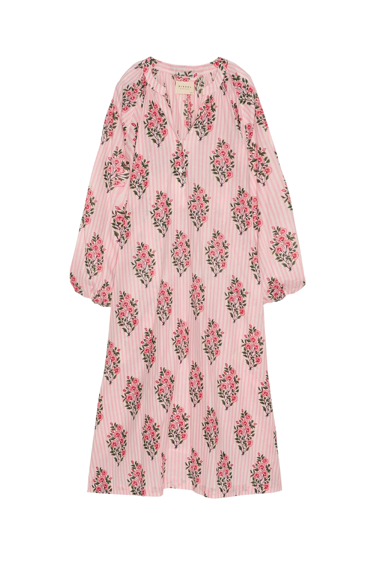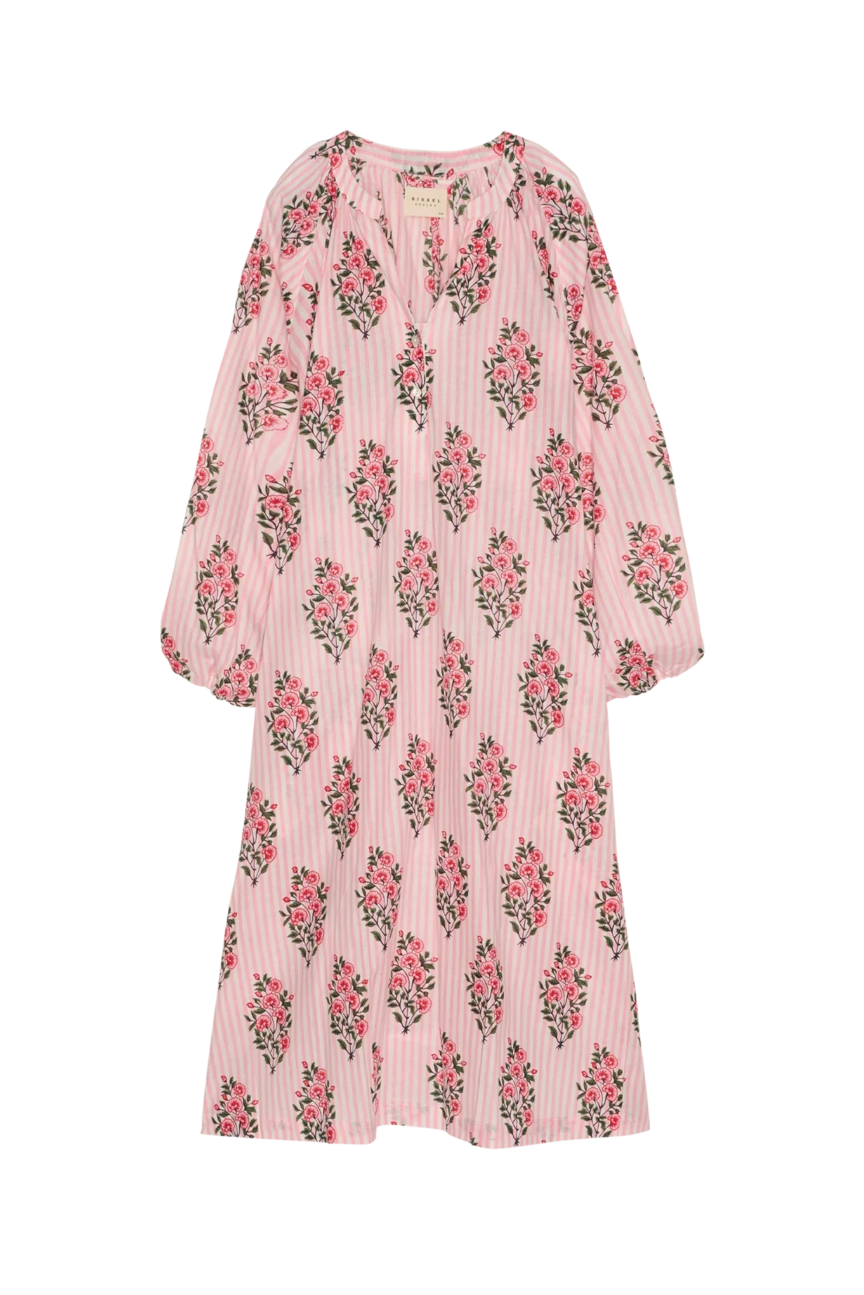 Print fra Sissel Edelbo er håndlavet af dygtige håndværkere ved brug af block print-teknik, hvilket betyder, at små variationer og unikke detaljer kan forekomme – en del af kjolens charme og autenticitet.