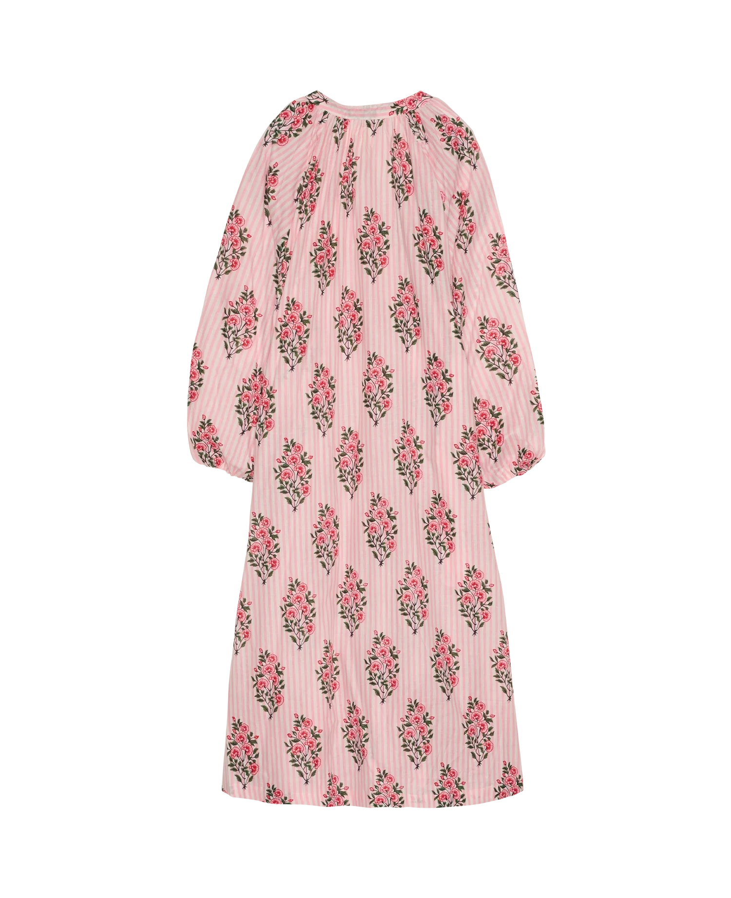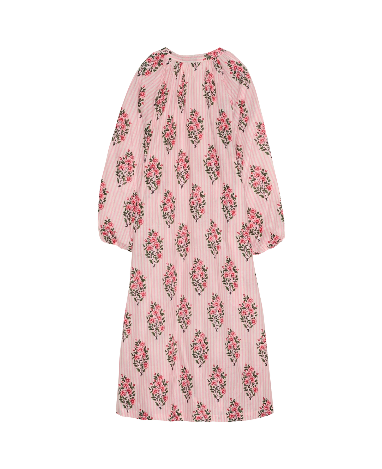 Lara lang kjole er fremstillet i 100% økologisk bomuld og prydet med et smukt all-over håndlavet print i bløde rosa nuancer. Kjolen har en feminin V-udskæring med slids foran, afsluttet med stolpelukning og fine perlemorsknapper.