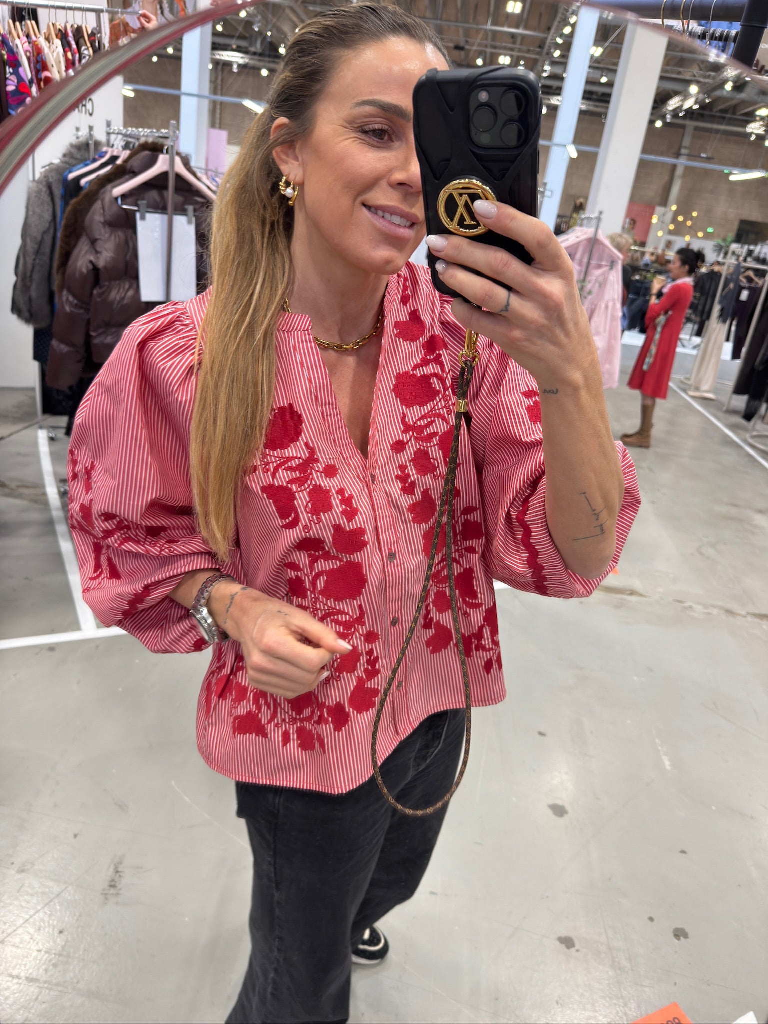Blusen har voluminøse ballonærmer, der er rynket og afsluttet med elastik ved ærmeåbningen. Den er desuden pyntet med zig-zag bånd og delikat blomsterbroderi placeret smukt langs fronten og på ærmerne.