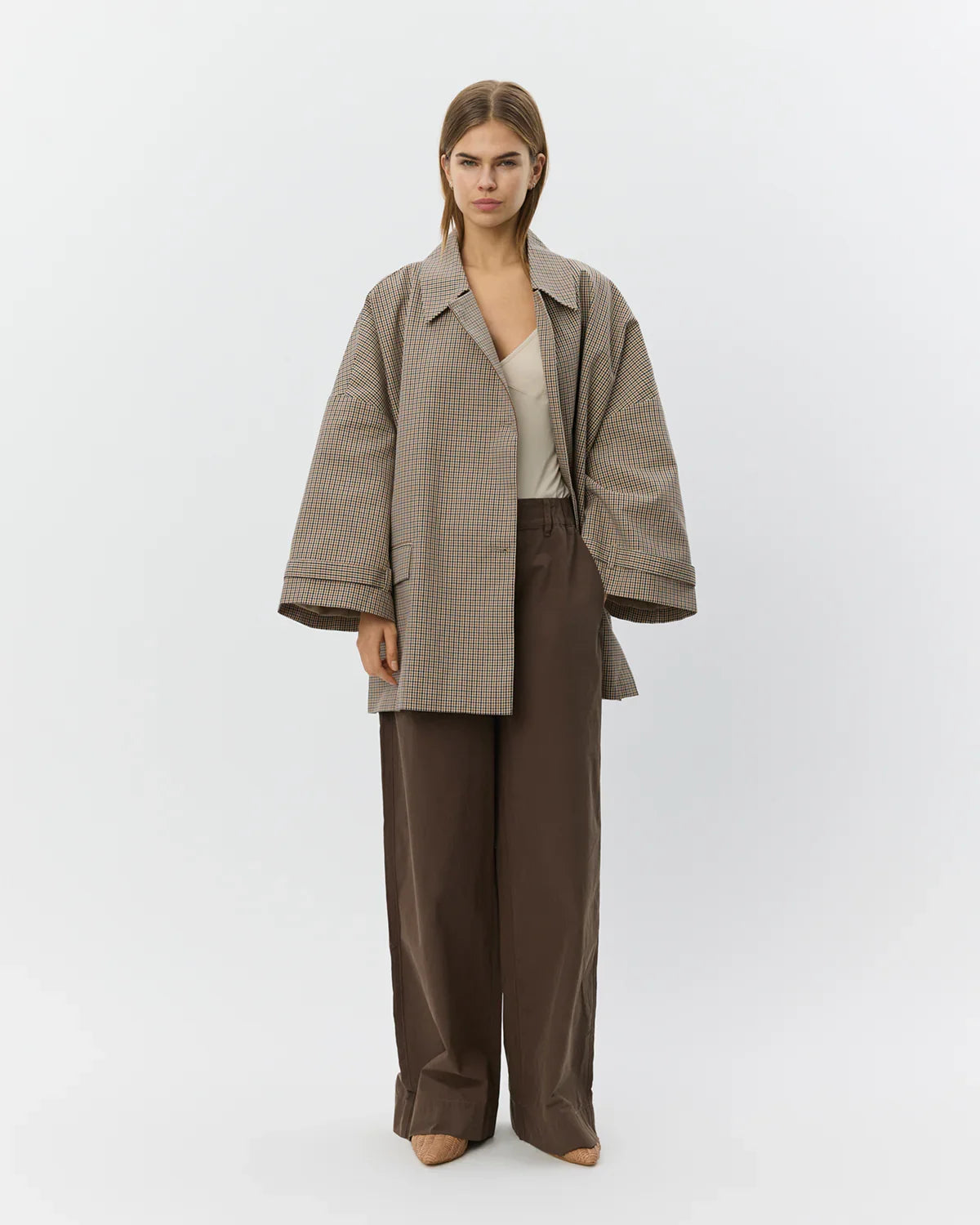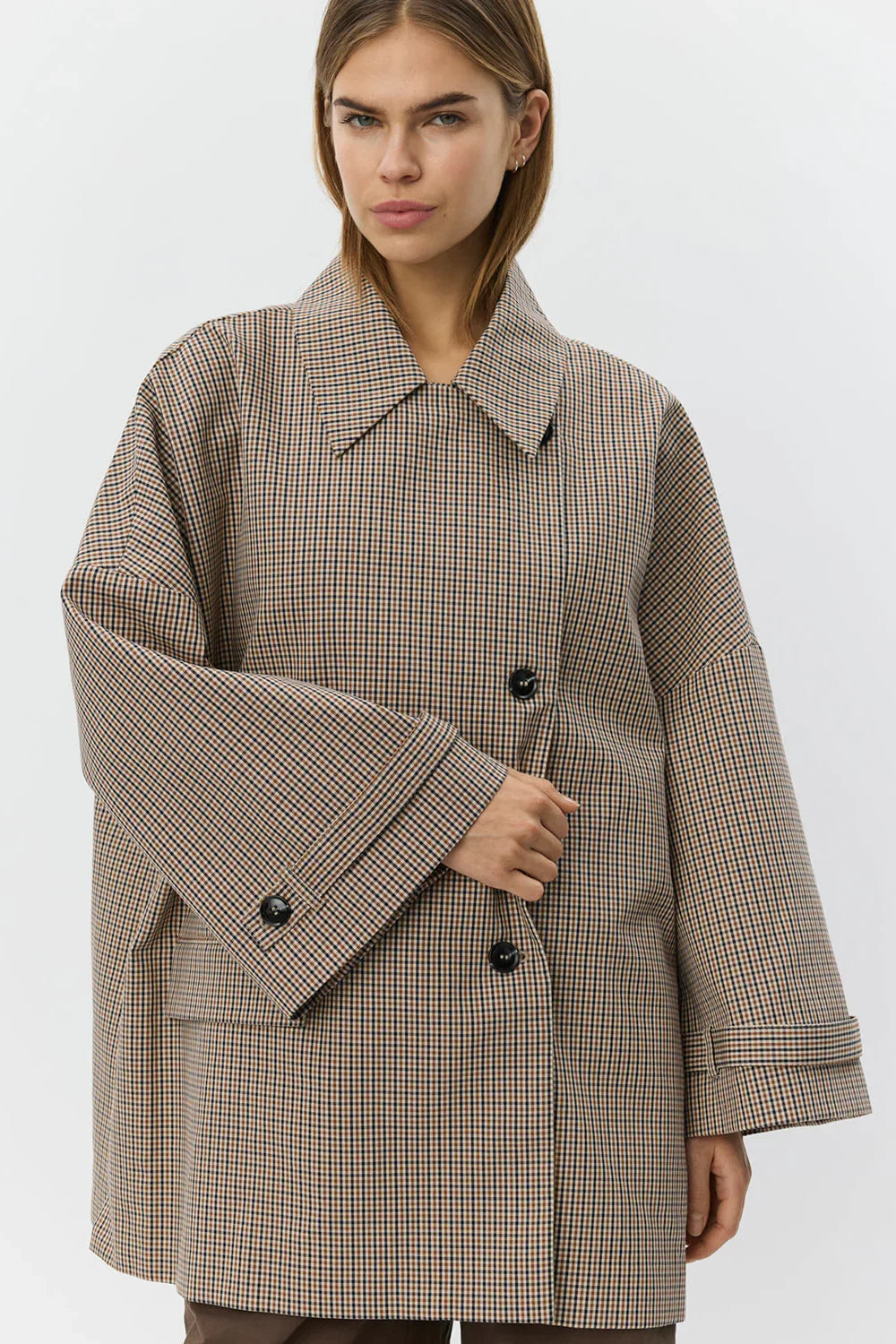 Selina er en oversized ternet jakke i farven check, der kombinerer et moderne udtryk med et tidløst snit. Jakken har et oversize fit og en let A-formet silhuet, som giver et afslappet og elegant fald. Den er designet med klassisk krave og knaplukning foran, der understreger det rene, stilfulde look. En enkelt lomme med flap tilfører et diskret, funktionelt detail, som fuldender designet. Perfekt som overgangsjakke og nem at style til både hverdag og arbejde.