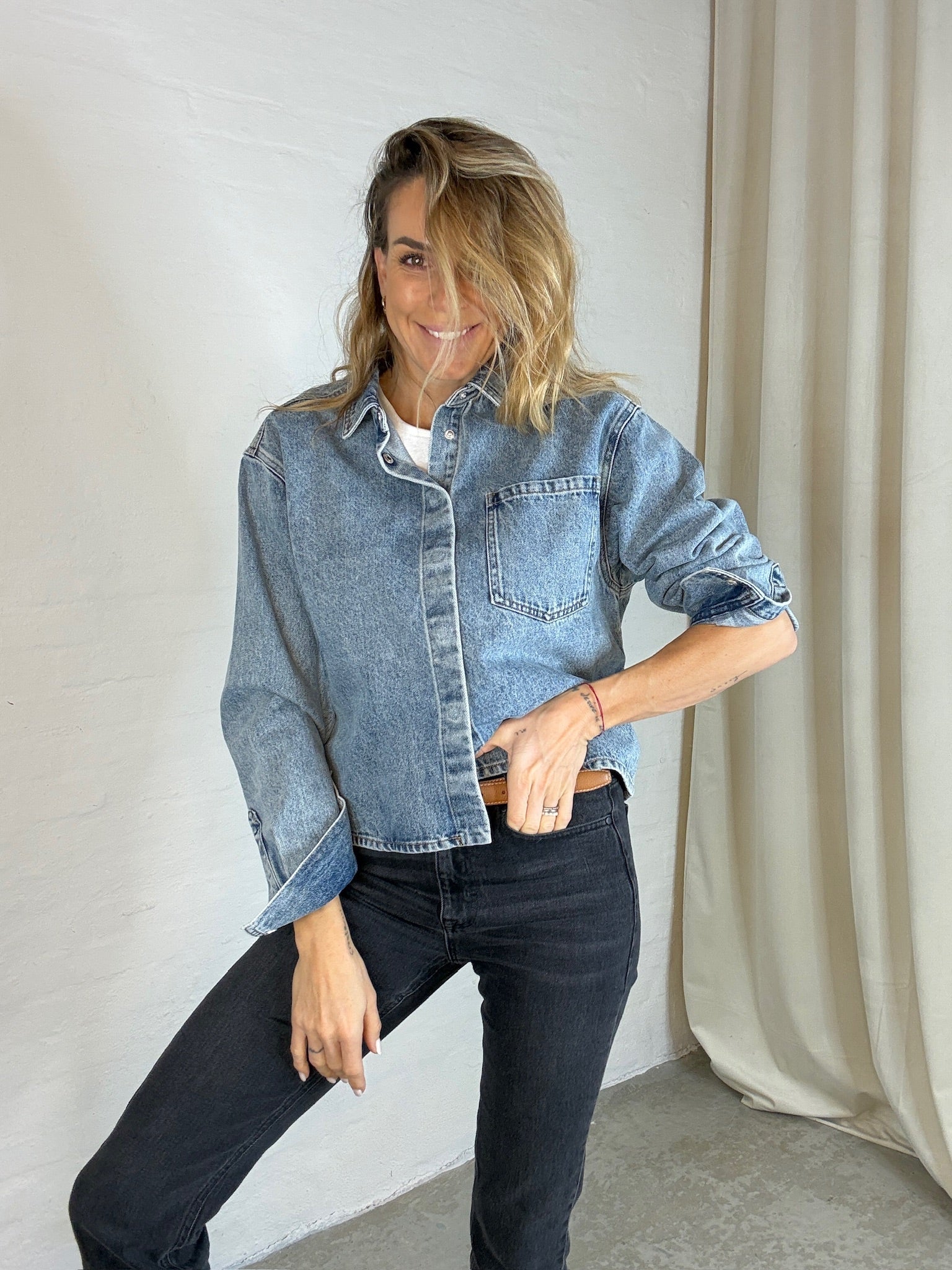 Nash denim jakke fra Sofie Schnoor er en moderne denimjakke i vasket blå denim med et afslappet og tidløst udtryk. Jakken har en let cropped, boxy pasform med dropped shoulders, klassisk skjortekrave og skjult knaplukning. Den store brystlomme og manchetter med trykknapper fuldender det cool design.