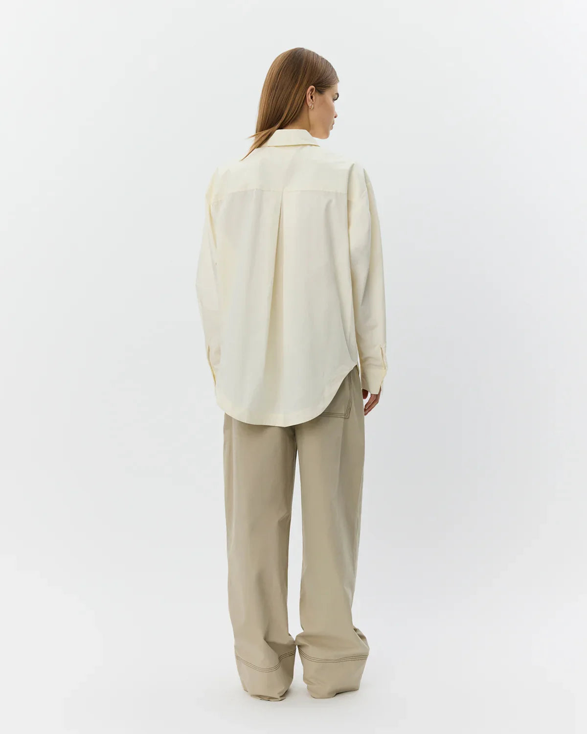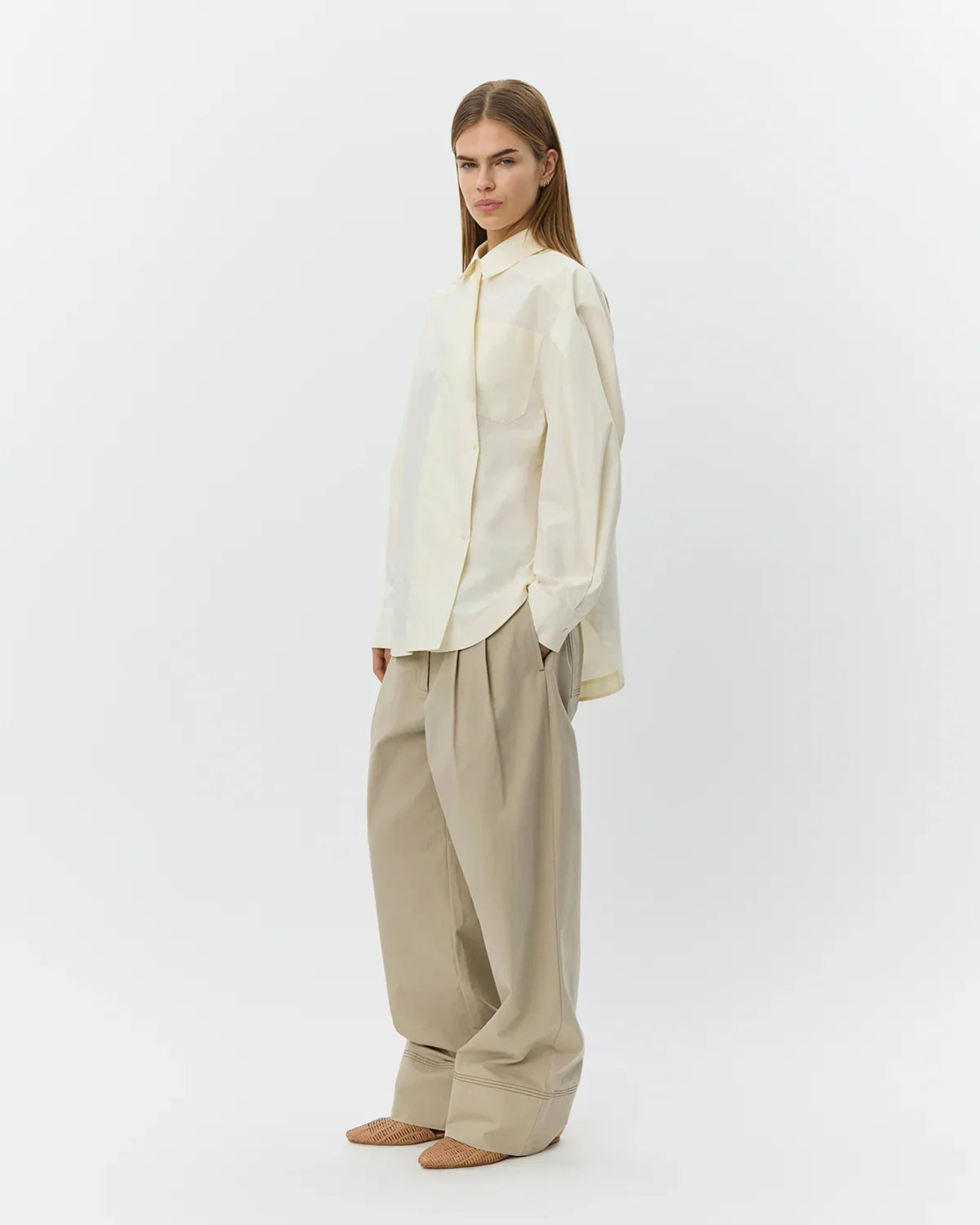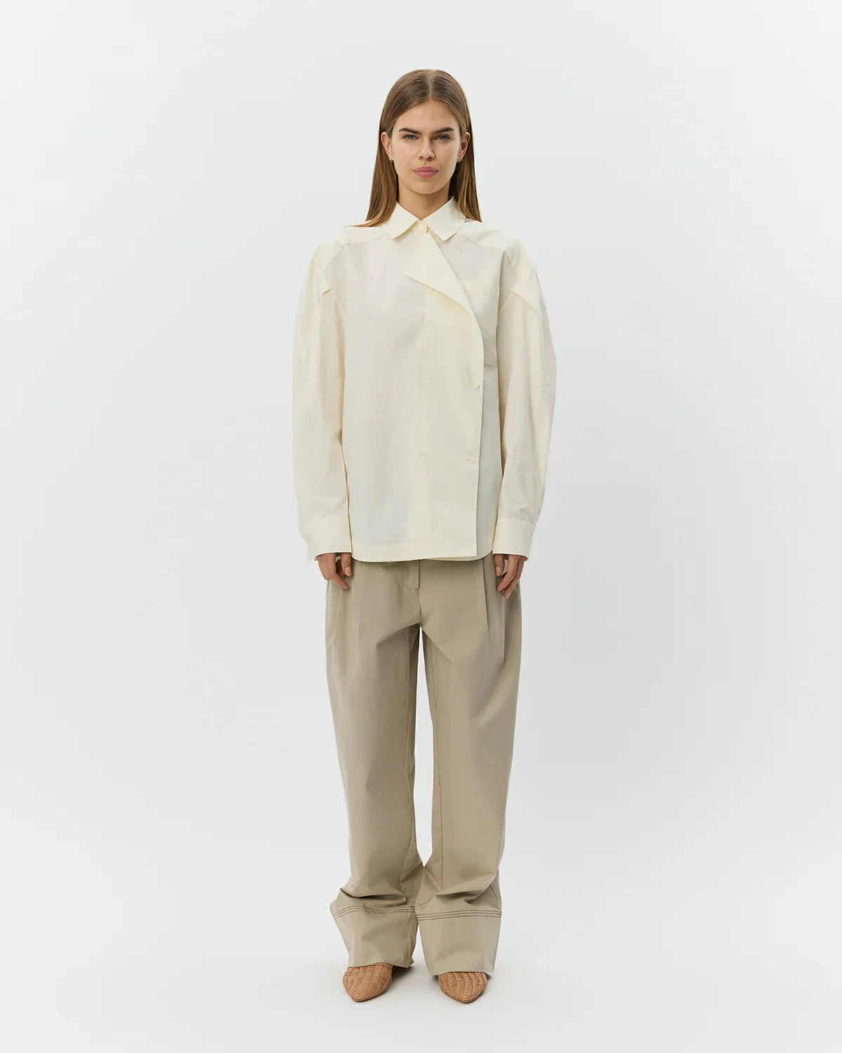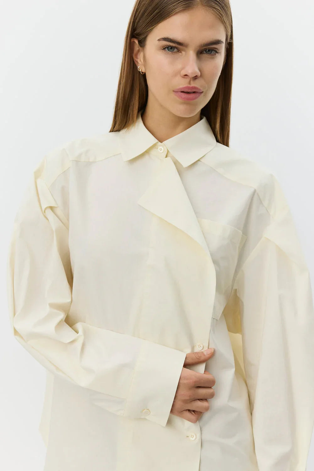 Denne oversize skjorte har en afslappet pasform med en asymmetrisk front, der sammen med den indbyggede draperede detalje giver et skarpt og moderne udtryk. Den klassiske skjortekrave og den skjulte knaplukning bidrager til et rent og sofistikeret look, mens den påsyede brystlomme tilfører et diskret, funktionelt element. Skjorten her fra Sofie Schnoor er let at style og fungerer både til hverdagsbrug og mere velklædte anledninger.