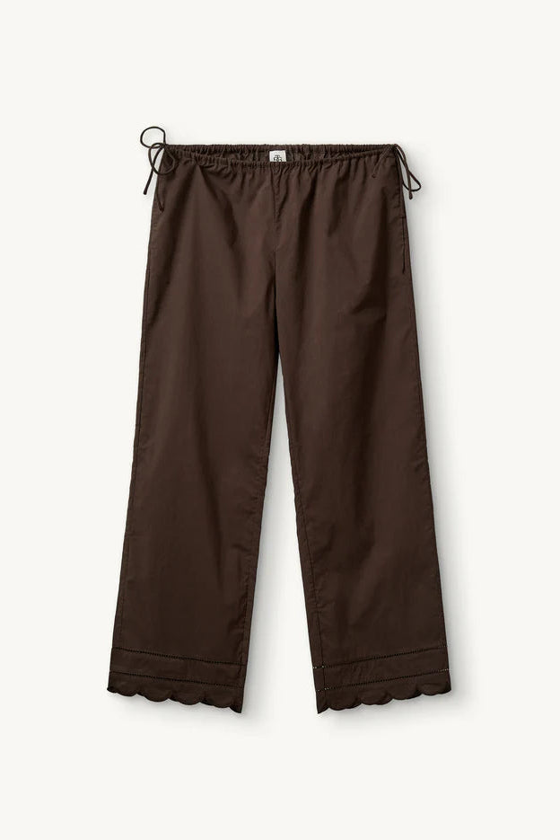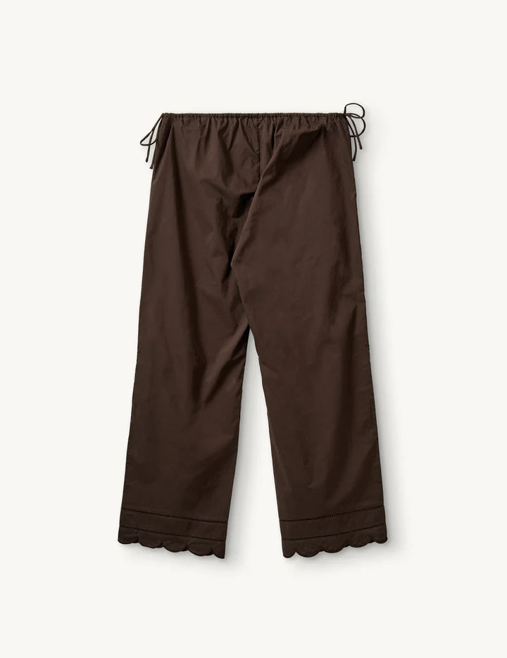 Den afslappede silhuet kombineres med en justerbar elastisk talje og fine bindebånd, som sikrer en fleksibel og personlig pasform. Det enkle design understreges af den dybe, varme Chocolate-tone, der tilfører et eksklusivt og tidløst udtryk.