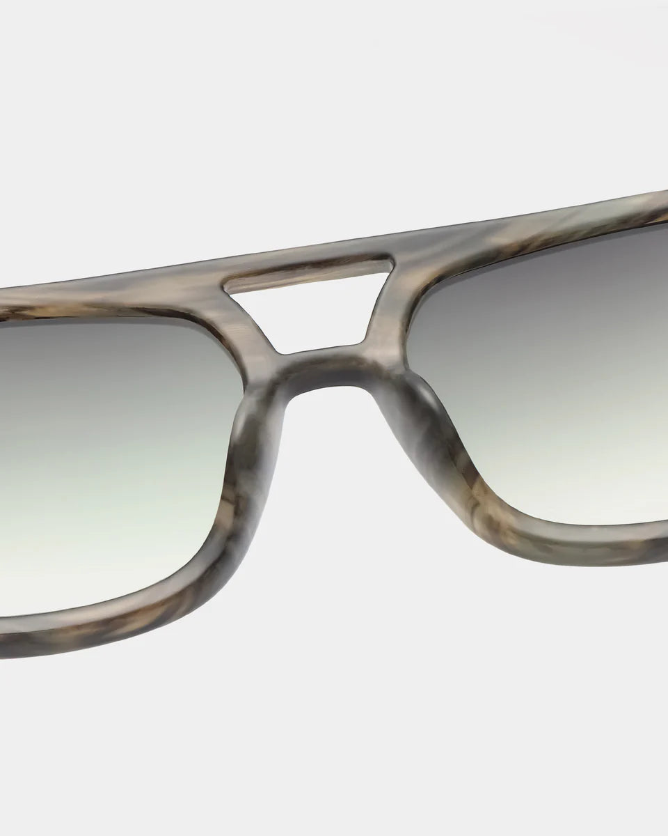 Farven er en marmoreret horn-look i brunlige og grå nuancer, som giver en eksklusiv og naturlig dybde. Glassene er tonede med en gradient fra mørkere øverst til lysere nederst, hvilket både er funktionelt og bidrager til det stilrene udtryk.