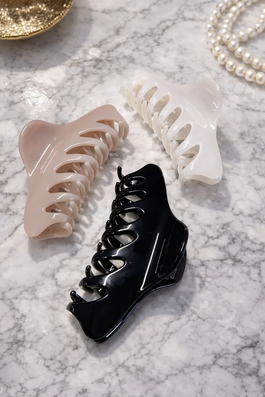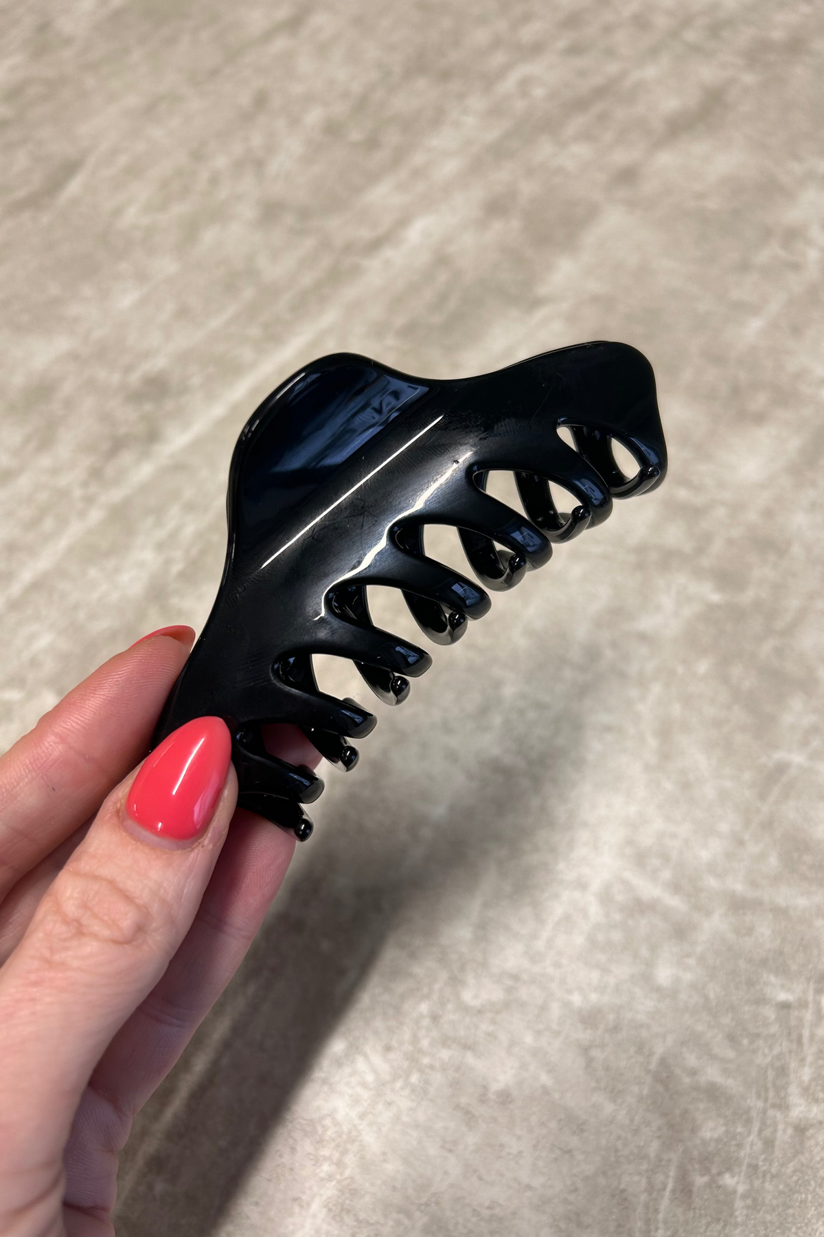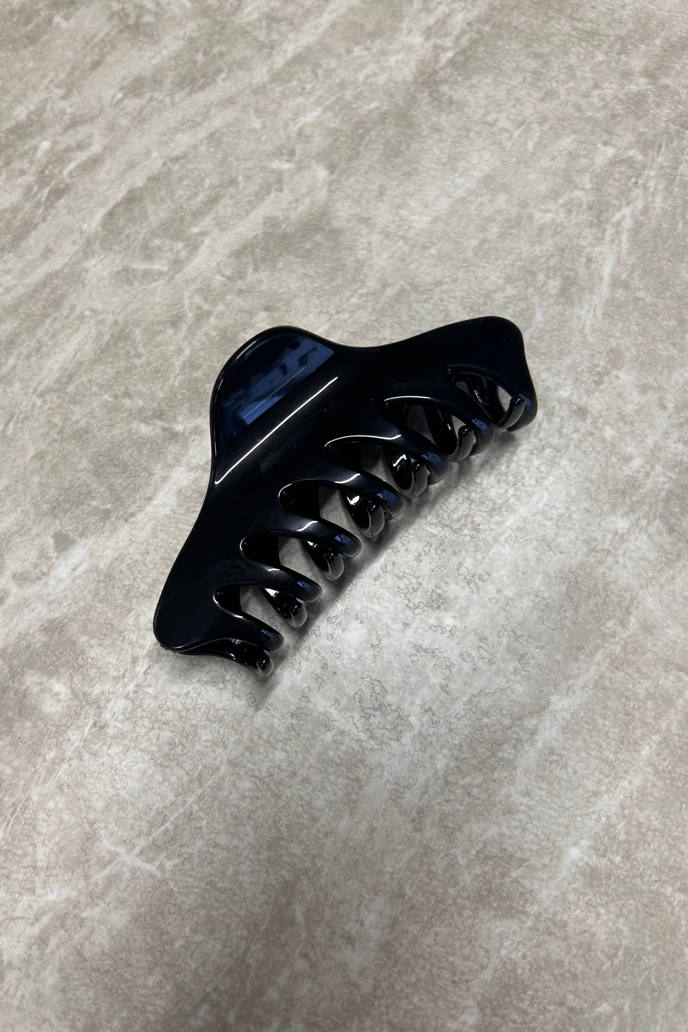Den sorte hårklemme har et tidløst udtryk med en glansfuld overflade, der giver et rent og elegant look. Den buede form sikrer et godt greb i håret, samtidig med at designet fremstår let og raffineret. Perfekt til både hverdagsbrug og mere styling, hvor detaljerne gerne må være diskrete, men eksklusive.