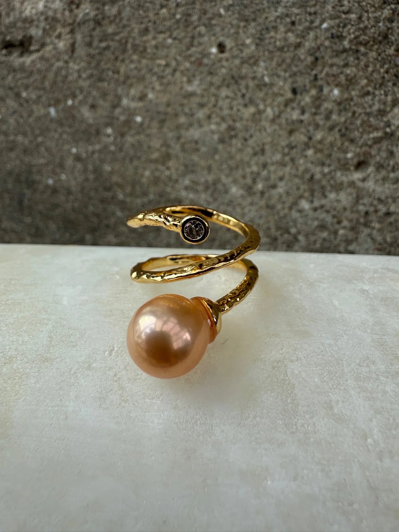 Twisted ring from Andcopenhagen with pink pearl and zircon. The organic design highlights the pearl's soft shades, while the zircon adds a subtle sparkle. The adjustable size makes the ring easy to adjust.