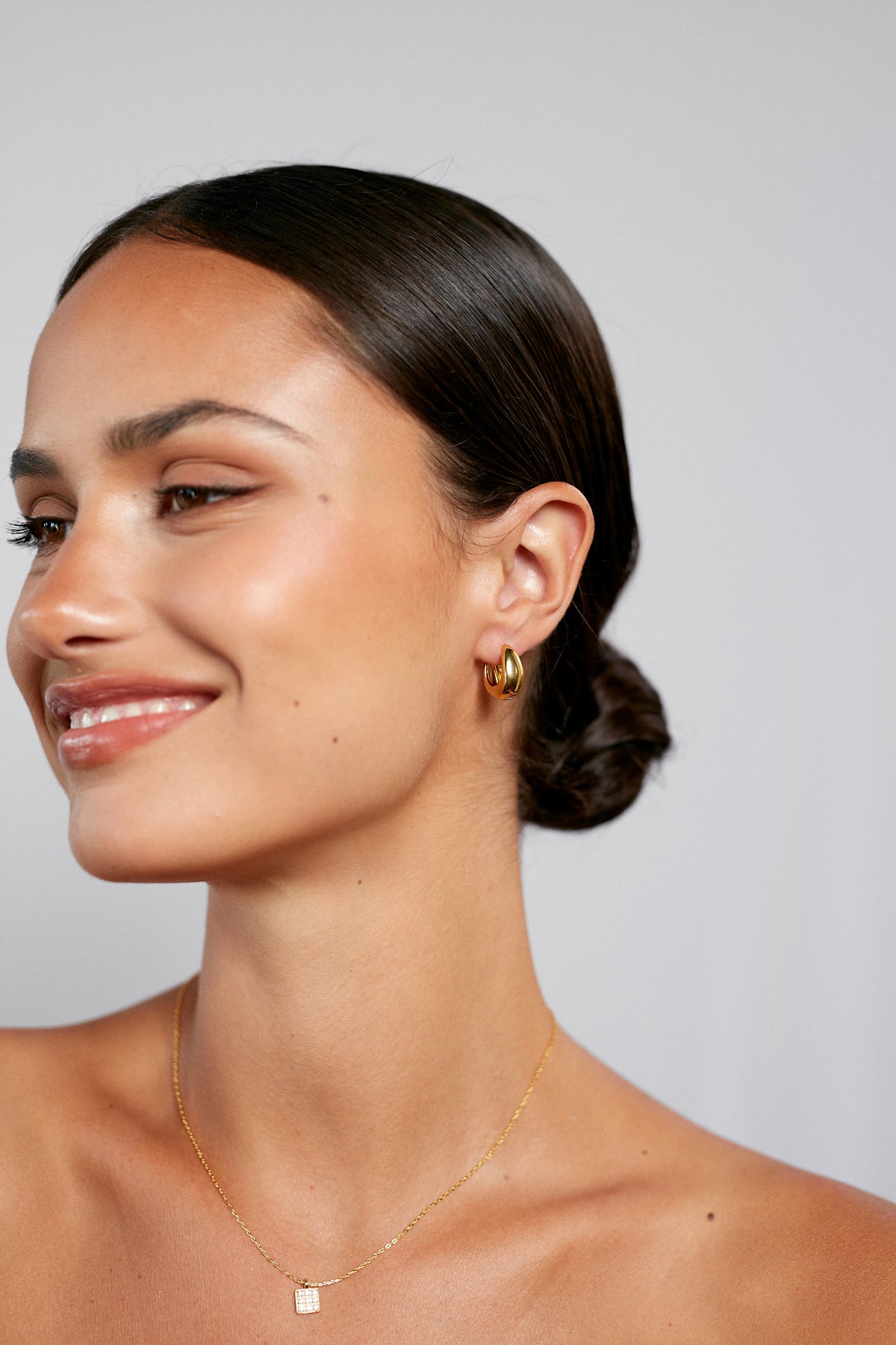 Golden Curve Hoops Petit indrammer ansigtet med polerede, bløde kurver og skaber et markant udtryk med varm glød og stærk tilstedeværelse. De fyldige, organiske former giver øreringene et moderne, skulpturelt look, der balancerer elegance og power i ét design.