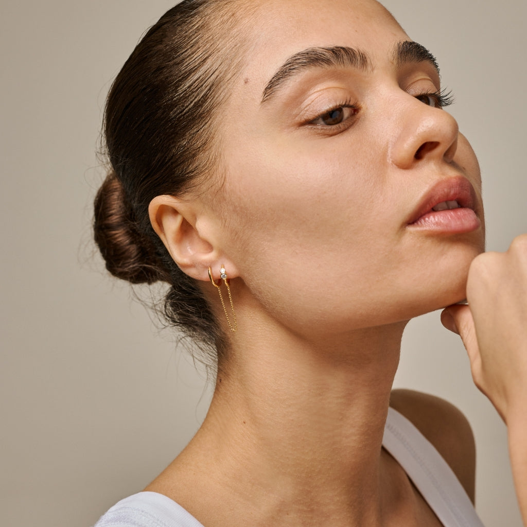 Delikat ringformet ørering med kædetalje fra Enamel, udført med fokus på enkelthed og glans. Den fine størrelse og den hvide cz-sten giver et diskret, elegant udtryk, der passer til både hverdag og fest. Designet er lavet i forgyldt genbrugssterlingsølv, hvilket giver en varm gylden tone uden at gå på kompromis med smykkets fine detaljegrad.