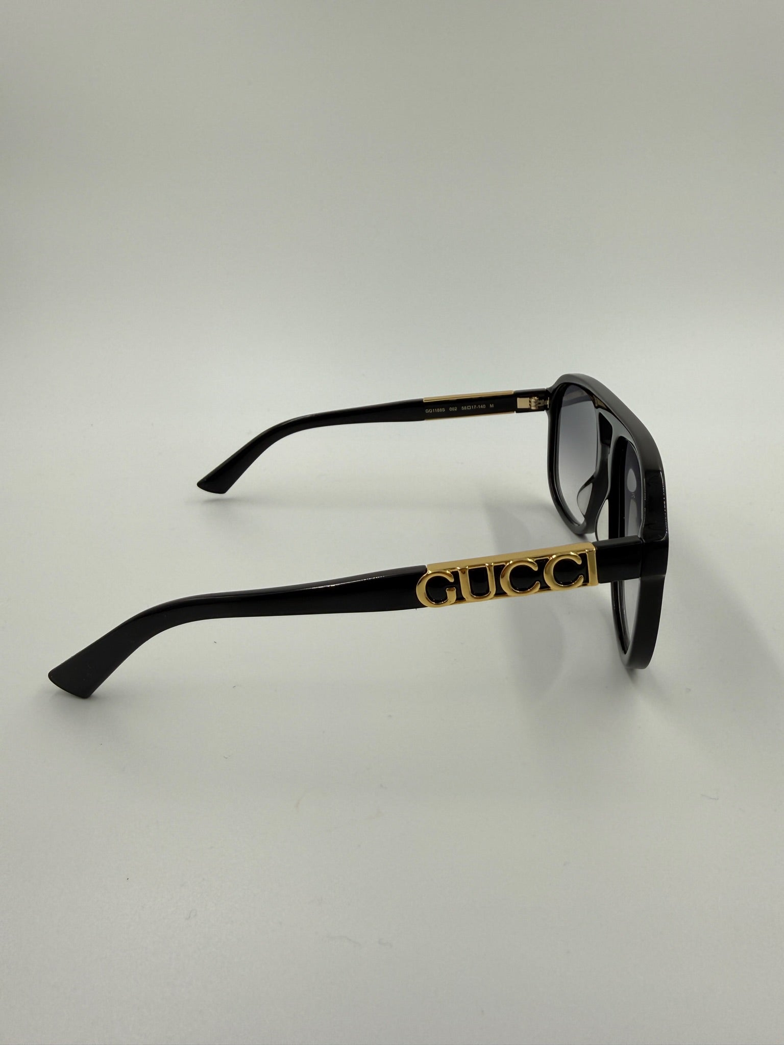 Eksklusive Gucci GG1188S solbriller i et markant og moderne design. Stellet er fremstillet i blank sort acetat med brede stænger, der giver et kraftfuldt og stilrent udtryk. På begge sider prydes stængerne af et stort, guldfarvet GUCCI-logo i metal, som tilfører et luksuriøst og iøjnefaldende finish.