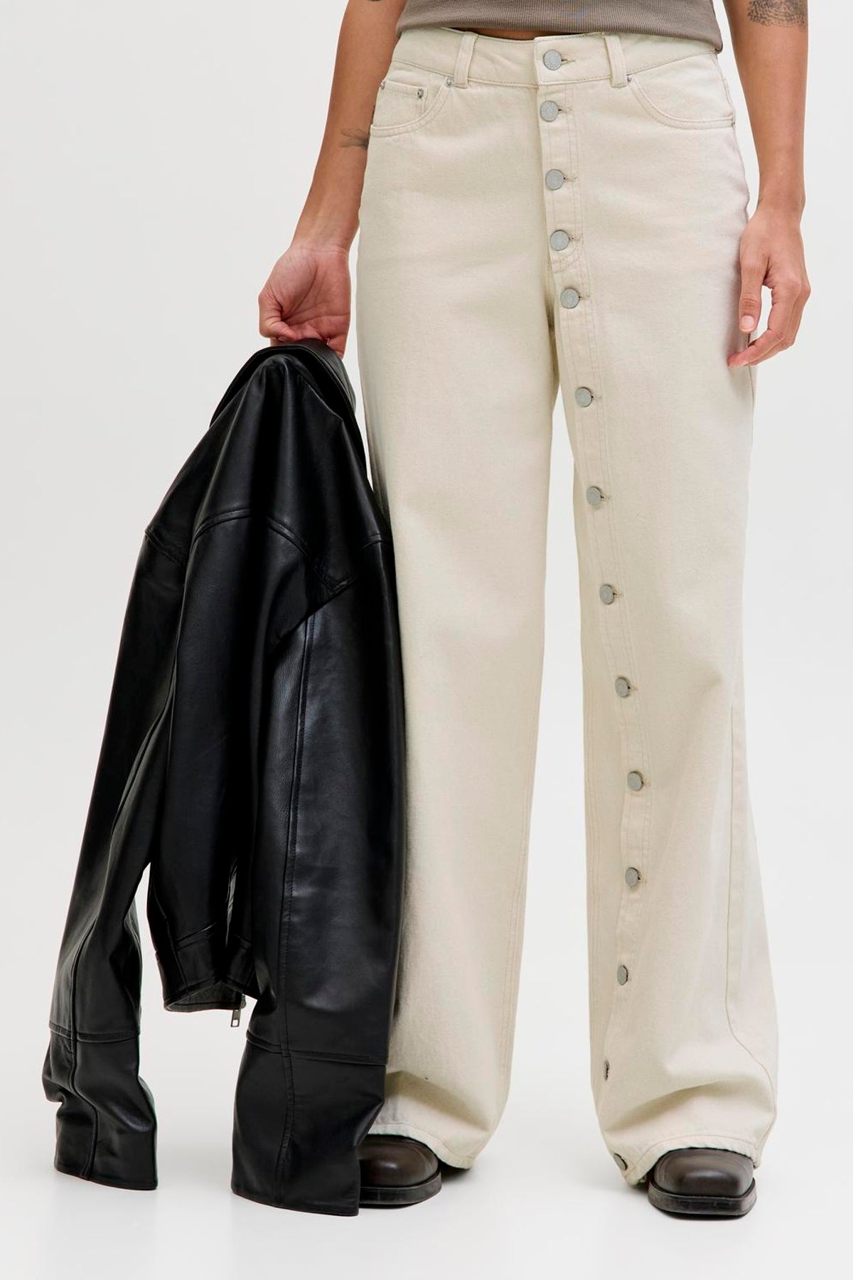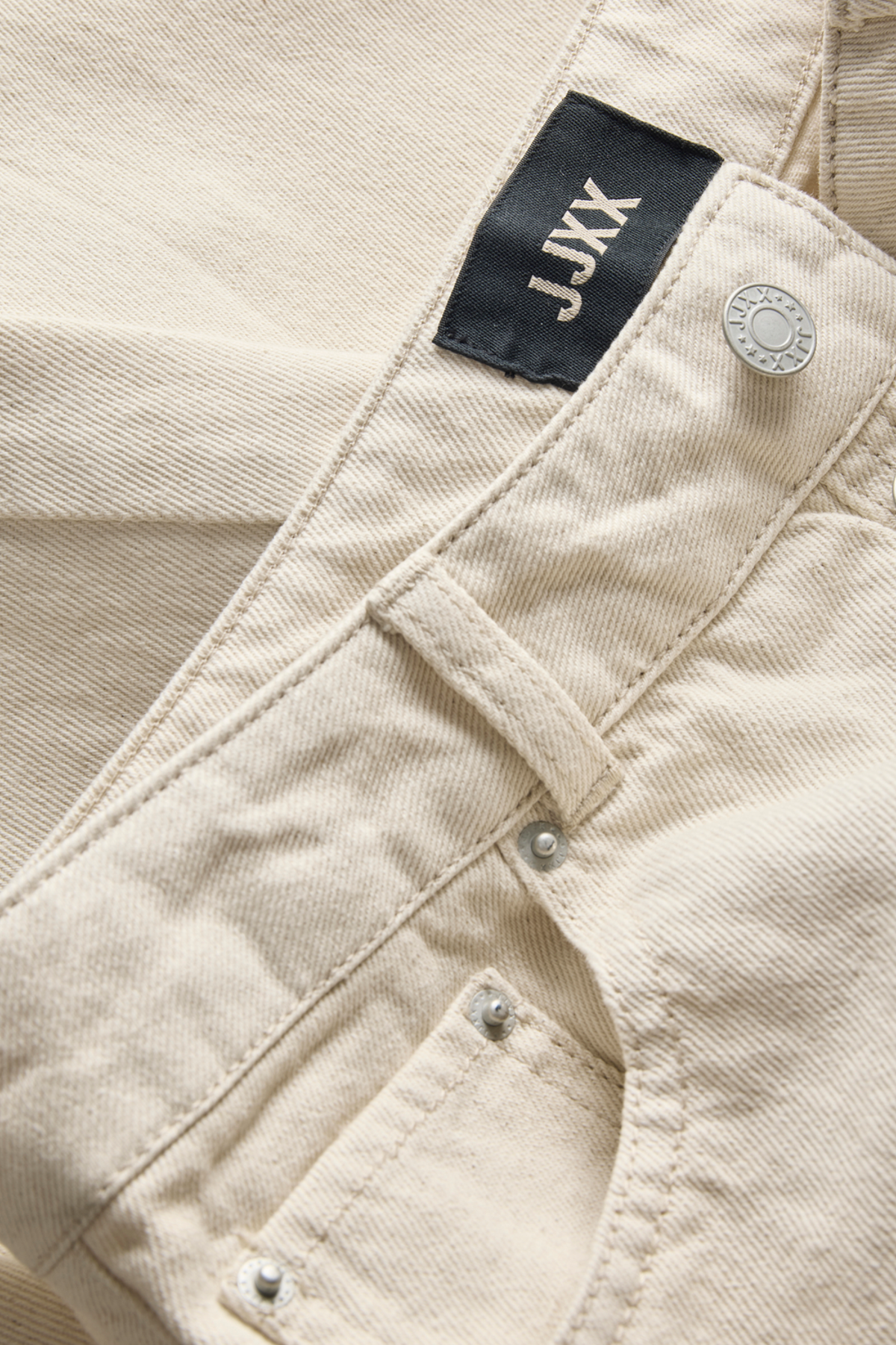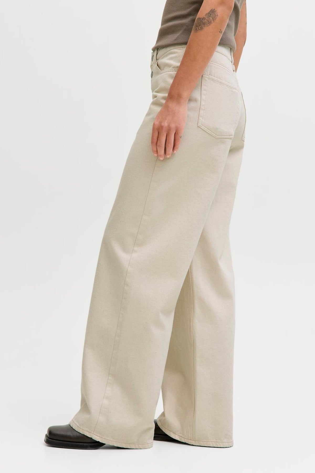 Disse wide-leg jeans med højtaljet pasform byder på en afslappet og komfortabel stil, perfekt til hverdagsbrug, arbejde eller rejser. Det lyse ecru-farvede stof kombinerer 80% bomuld med 20% genanvendt bomuld, hvilket sikrer et blødt og åndbart materiale med fokus på bæredygtighed. De har knappedetaljer ved lukningen og praktiske bag- og frontlommer, der understreger det funktionelle design fra JJXX.