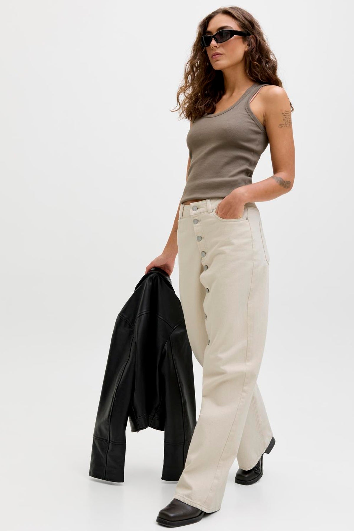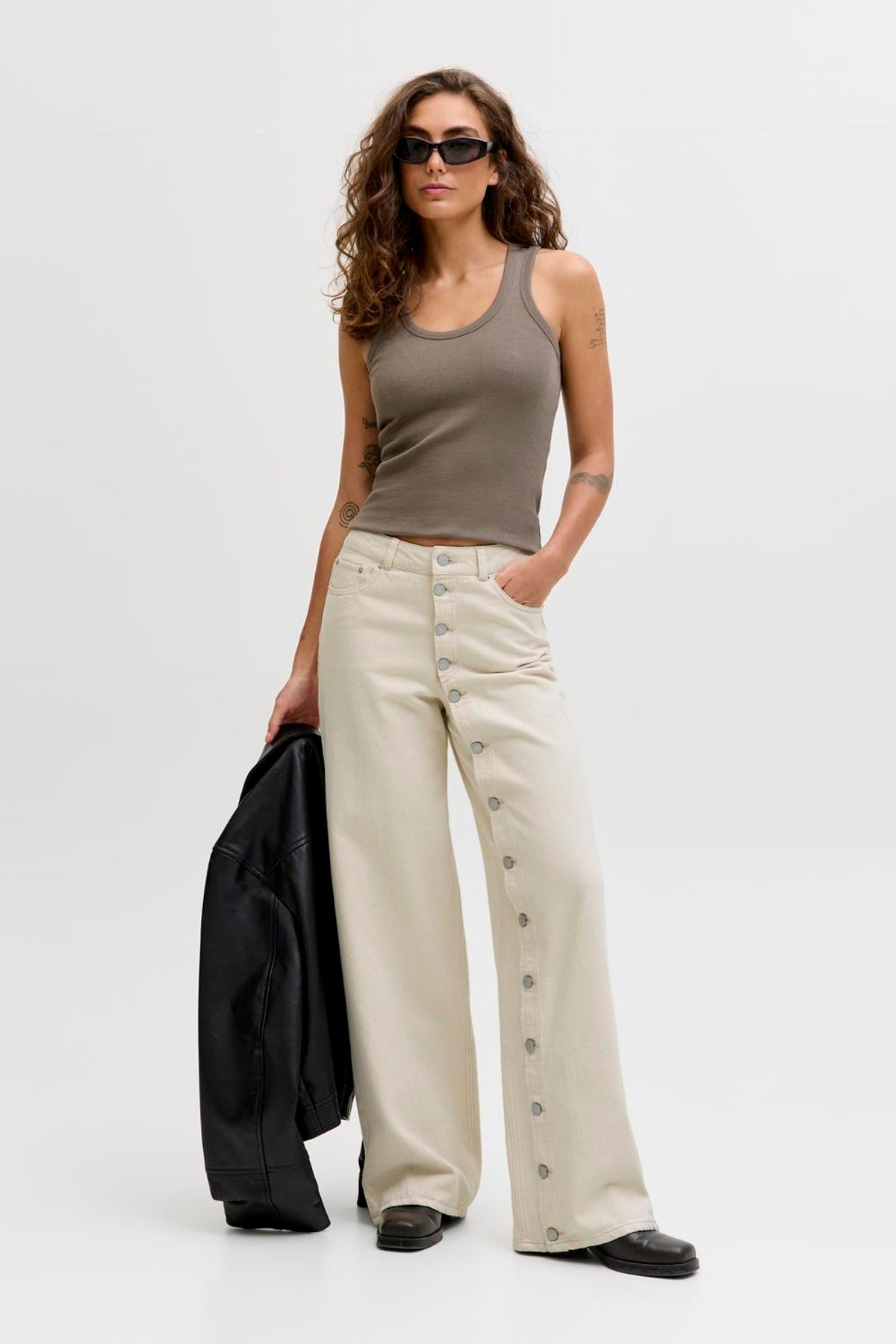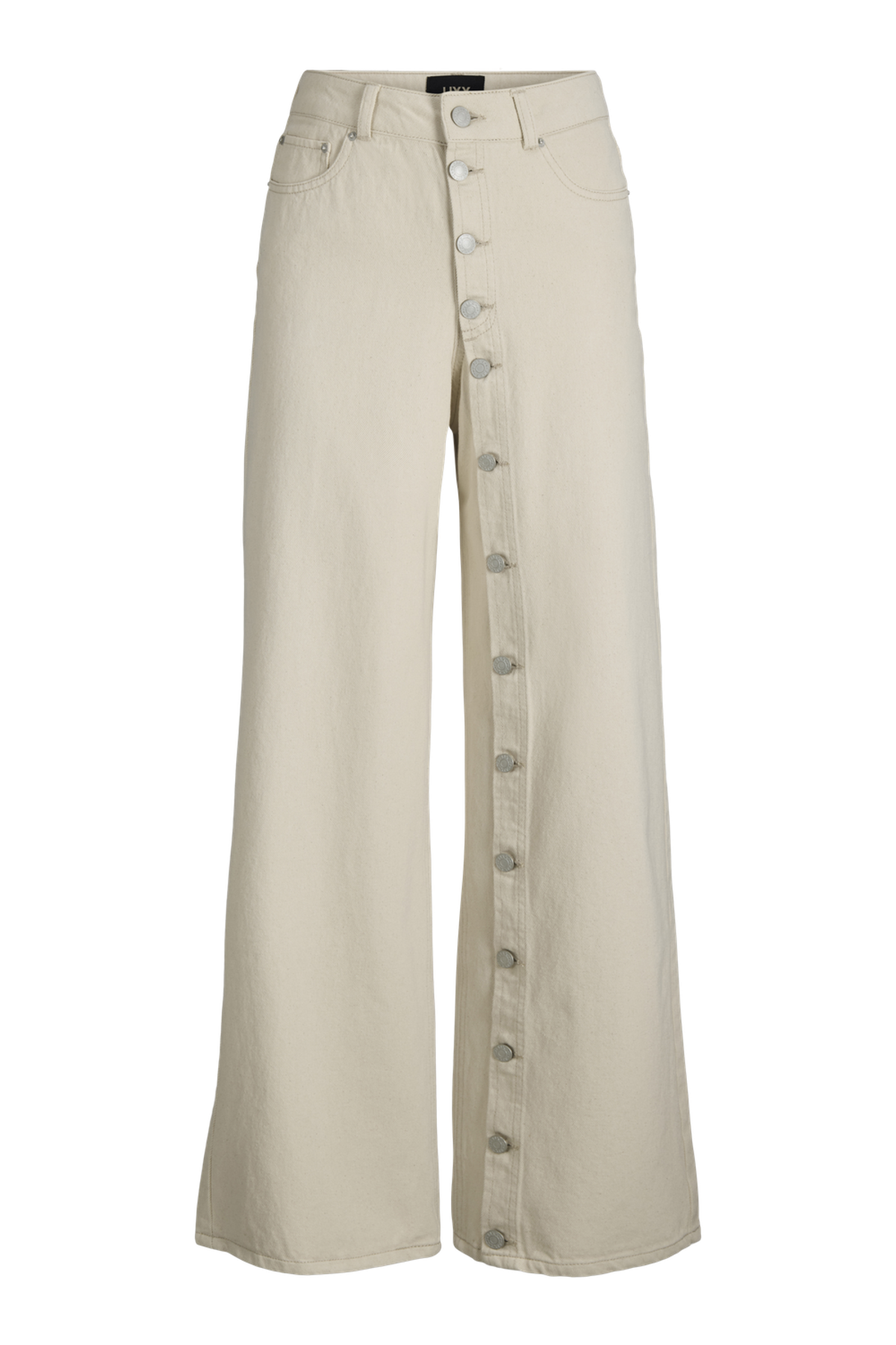 Disse wide-leg jeans med højtaljet pasform byder på en afslappet og komfortabel stil, perfekt til hverdagsbrug, arbejde eller rejser. Det lyse ecru-farvede stof kombinerer 80% bomuld med 20% genanvendt bomuld, hvilket sikrer et blødt og åndbart materiale med fokus på bæredygtighed. De har knappedetaljer ved lukningen og praktiske bag- og frontlommer, der understreger det funktionelle design fra JJXX.