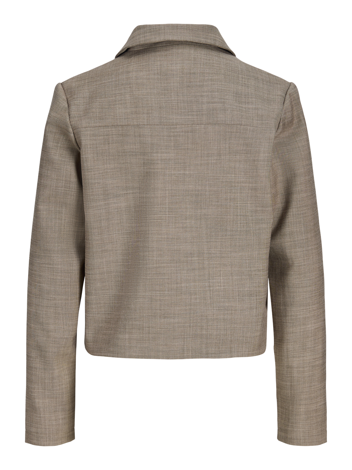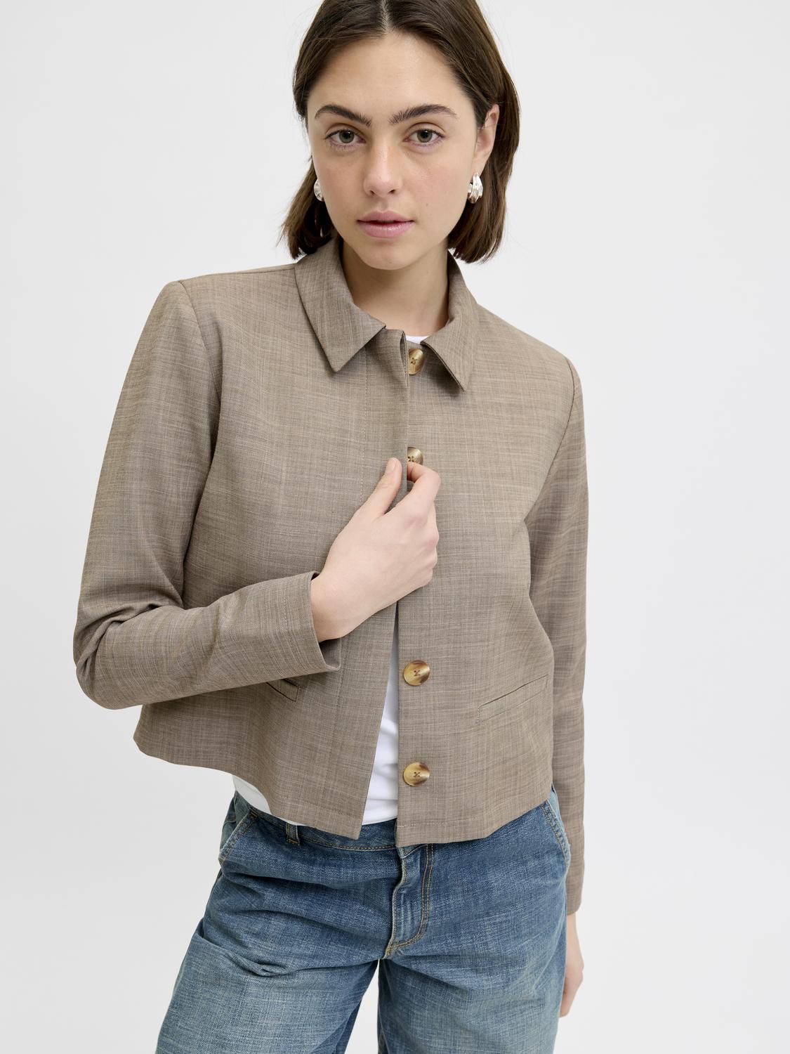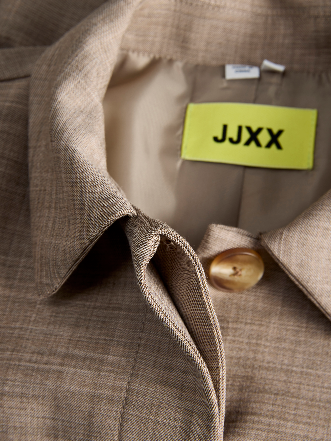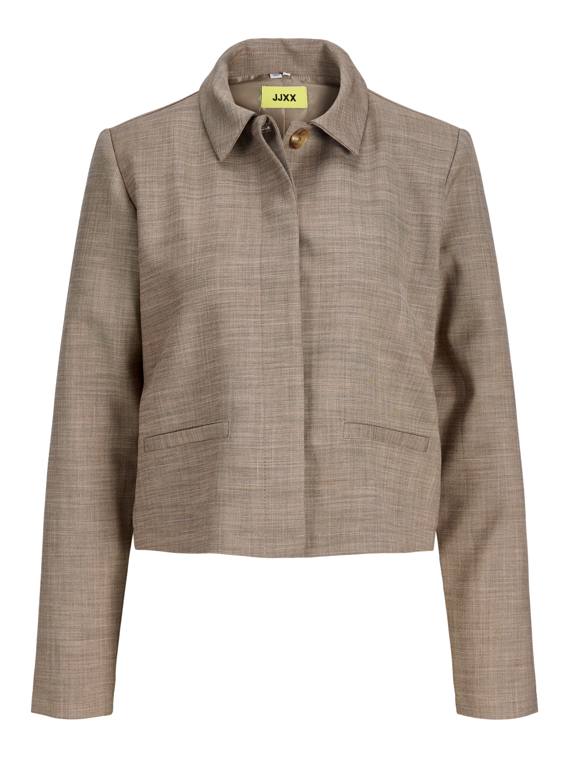 Denne Cooper jakke fra JJXX har et klassisk design med lange ærmer og en knappelukning, hvilket giver et formelt og traditionsrigt udtryk. Jakken er fremstillet i et slidstærkt vævet stof, der ikke strækker sig som strikket materiale, og den har en kort længde, der passer perfekt til forårssæsonen. Farven Coriander er brun men har en melangeeffekt, som bidrager til jakkens detaljerede udseende.